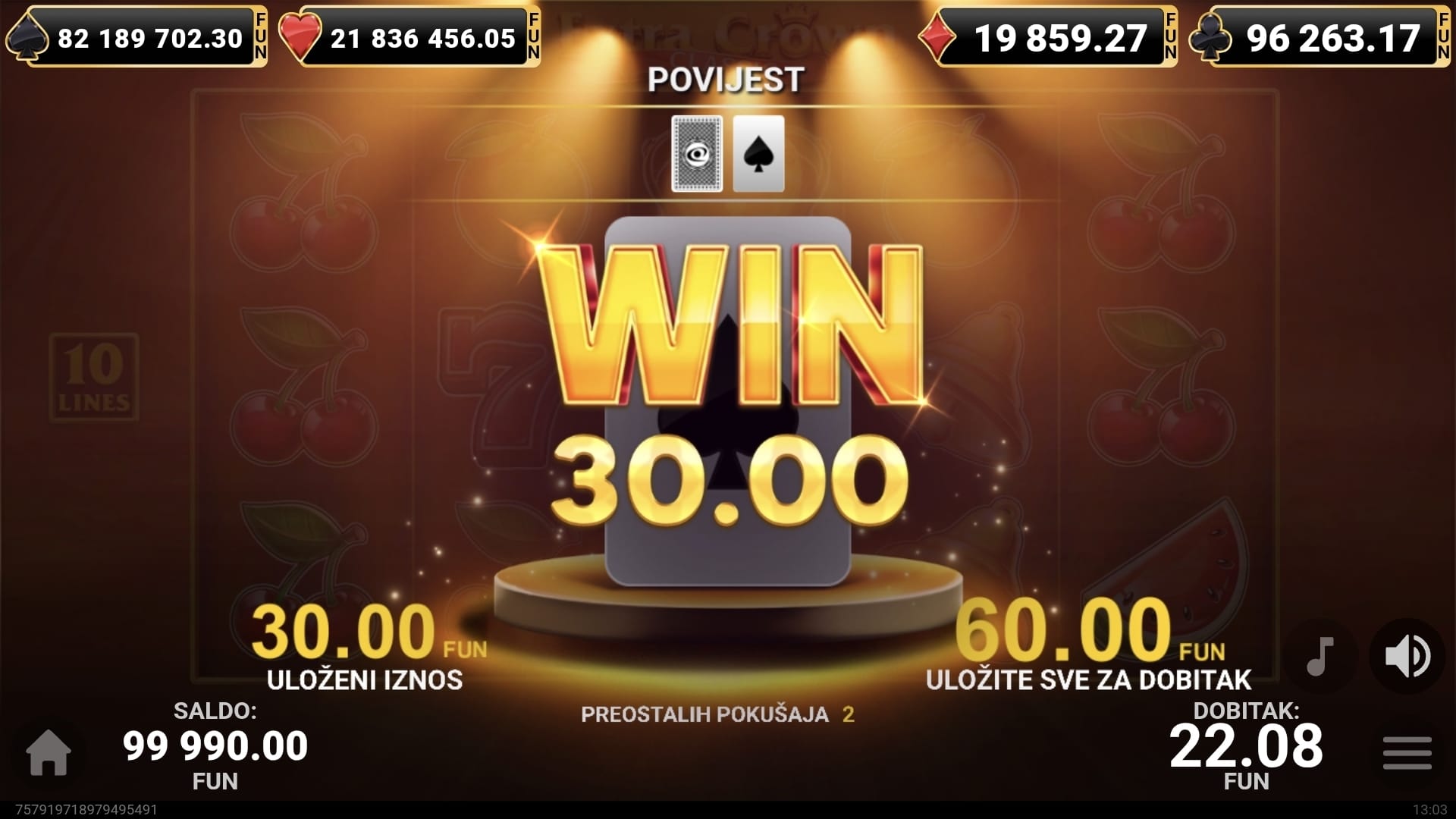 Nakon svake dobitne vrtnje, imate priliku udvostručiti svoj dobitak u značajci Klađenja pogađajući boju sljedeće karte.