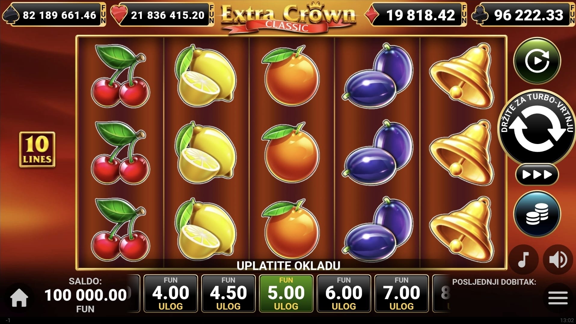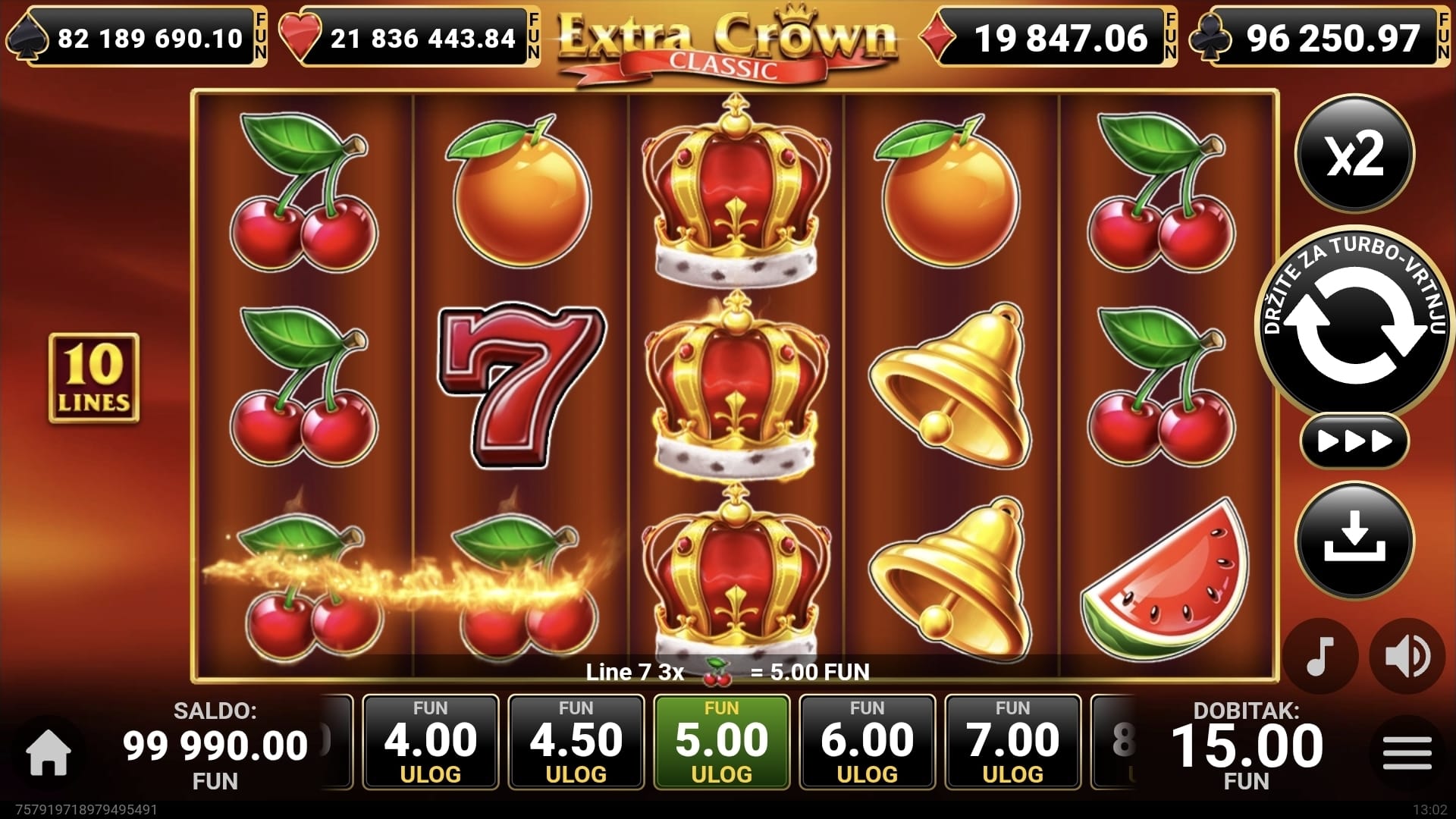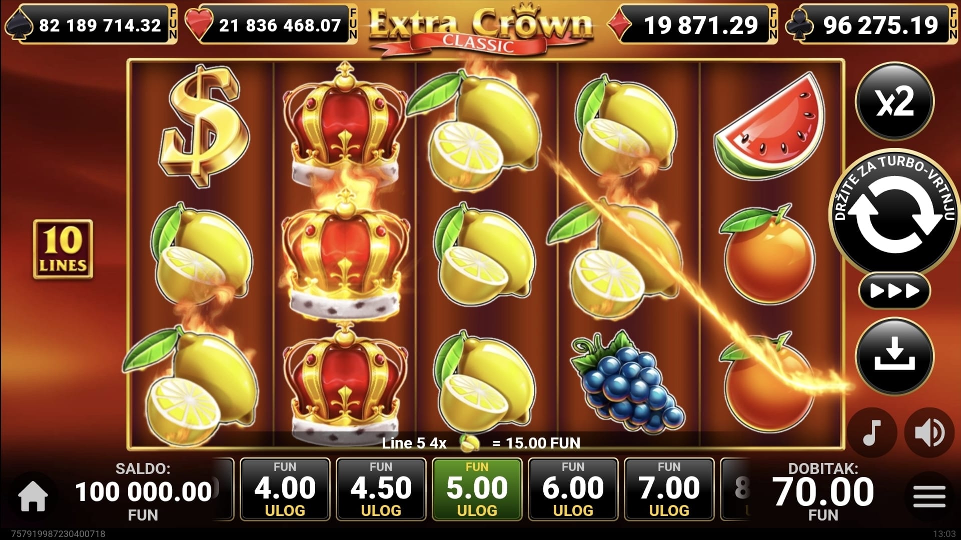 U igri Extra Crown Classic, dobitne kombinacije ostvaruju se na 10 fiksnih linija, počevši s lijeve strane. Glavni simbol je kruna, koja djeluje kao Wild simbol. On se pojavljuje samo na valjcima 2, 3 i 4 te se proširuje kako bi prekrio cijeli valjak, što značajno povećava šanse za dobitak.