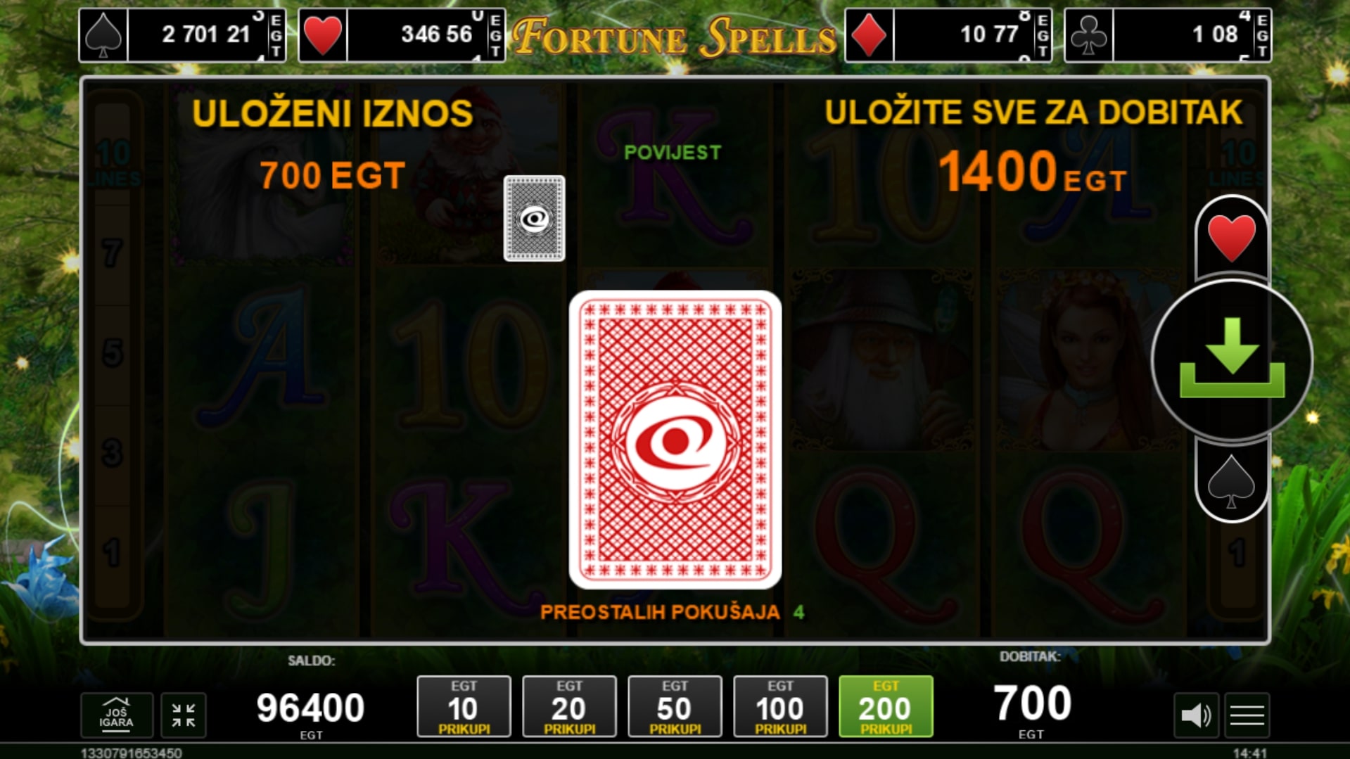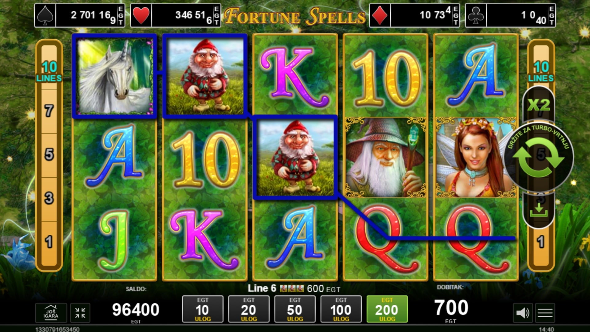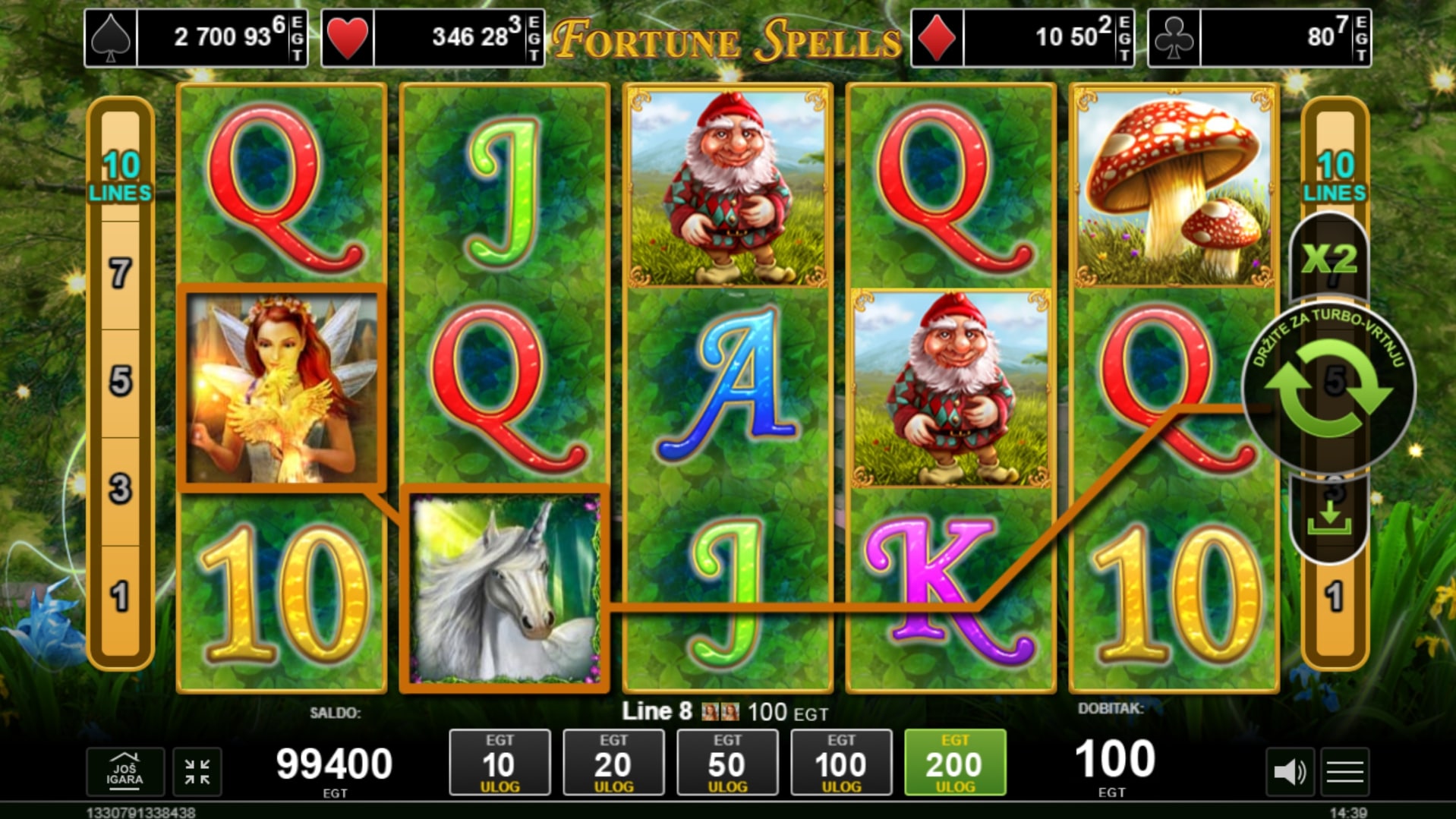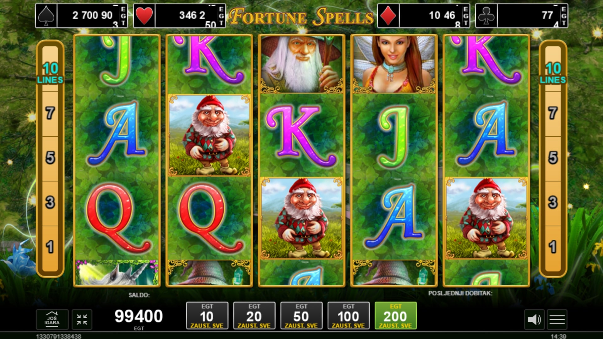 Fortune Spells od Amusnet klasična je slot igra koja vodi igrača u pustolovni svijet mistike i šumskih likova. Najvredniji simboli po značaju dobitaka su vile i čarobnjaci, a igraču najzanimljiviji bit će simbol jednoroga koji obnaša funkcije Wilda i Scattera. On može zamjeniti sve simbole, ali i odvesti igrača u svijet besplatnih vrtnji. Također, po uzoru na igre istog autora, Fortune Spells pruža igraču priliku za udvostručivanje dobitaka te osvajanje Jackpot rundi koje ga mogu odvesti do fantastičnih nagrada.