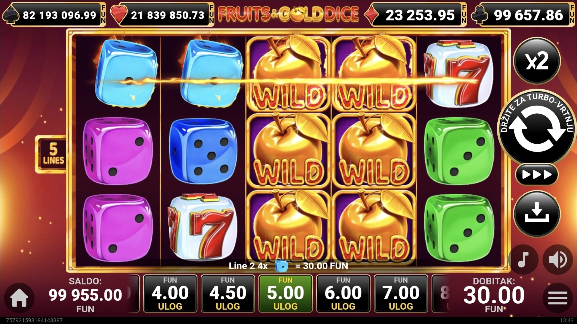 U igri Fruits & Gold Dice, dobitne kombinacije ostvaruju se na 20 fiksnih linija. Wild simbol se može pojaviti samo na valjcima 2, 3, 4 i 5, te zamjenjuje sve simbole. Scatter simbol je zlatna poluga koja donosi isplate neovisno o poziciji na valjcima. Igra također sadrži popularni Jackpot Cards Mystery Bonus, koji se može nasumično pokrenuti nakon bilo koje vrtnje. Ova bonus igra daje vam priliku da osvojite jedan od četiri progresivna jackpota.