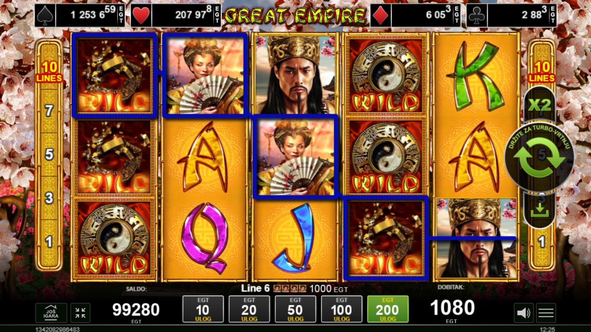 Great Empire slot je igra povijesne tematike koja vodi igrača u nezaboravnu avanturu moćnim i snažnim carstvima Azije. Simboli su inspirirani njihovom bogatom tradicijom, a od običnih simbola najviše isplaćuju oni s ilustracijama domaćeg stanovništva. Igra također sadrži simbol yina i yanga koji mijenja druge simbole, ali i simbol Scattera koji može igrača odvesti do besplatnih vrtnji. U slučaju dobitka, igrač ga može pokušati udvostručiti pogađanjem boje karte okrenute licem prema dolje. Zaigraj Great Empire i osvoji veličanstvene nagrade!