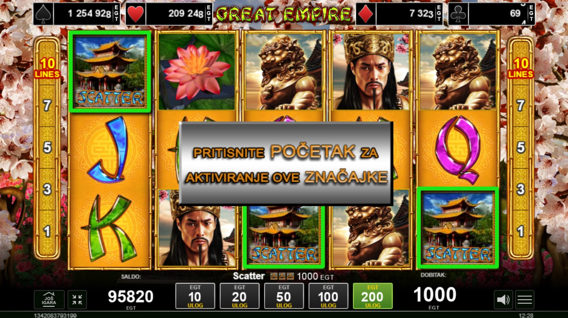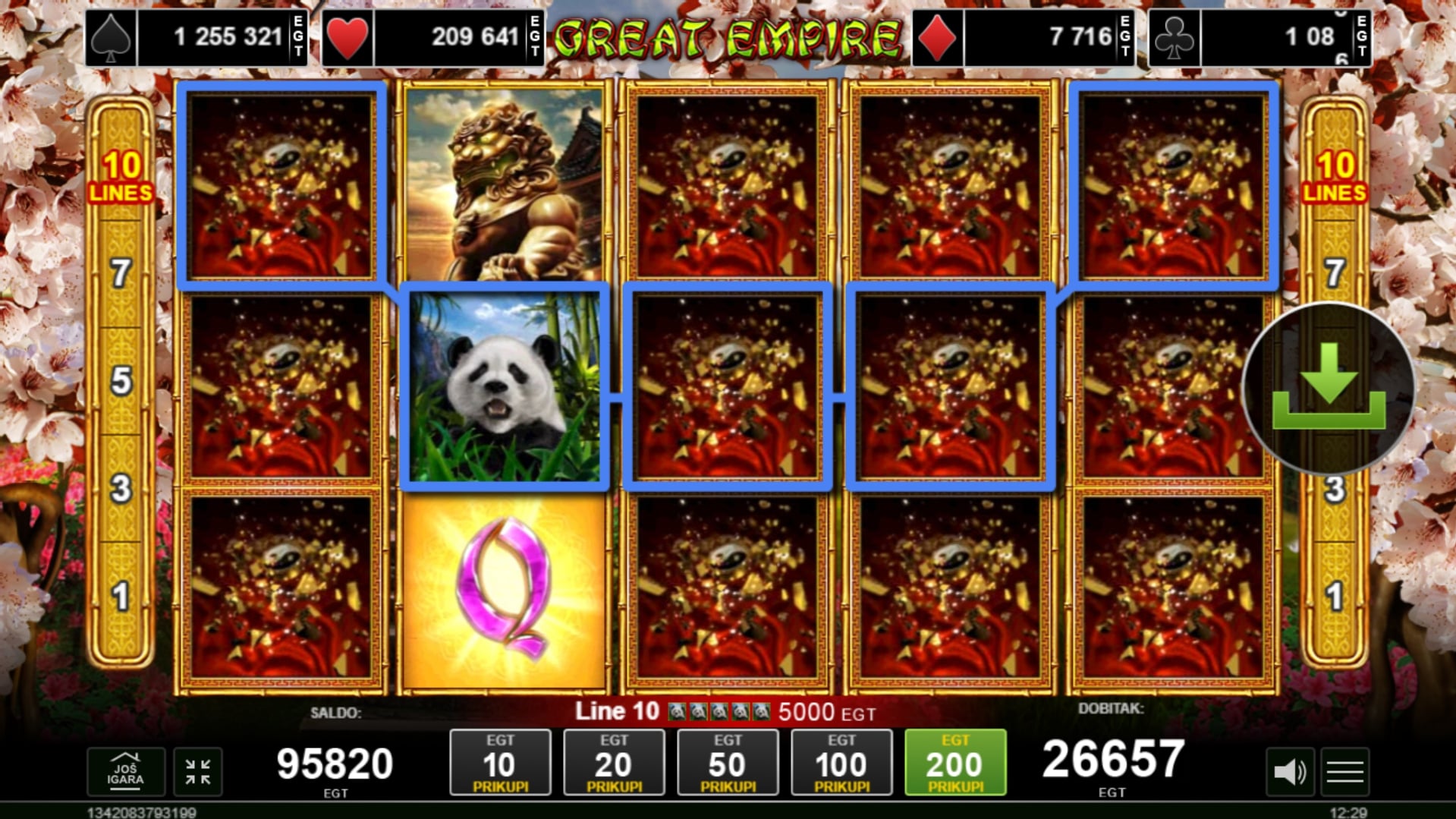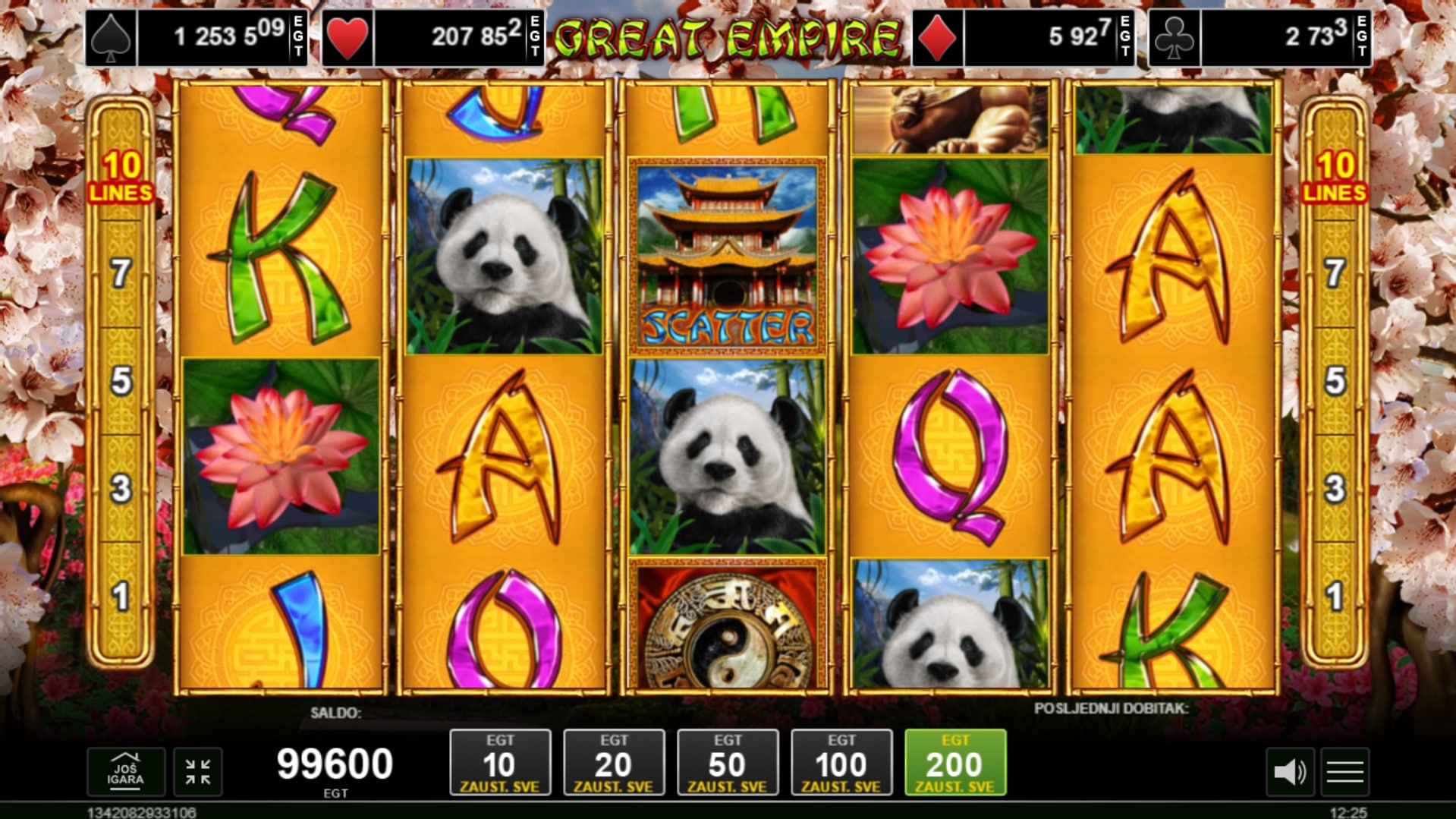 Great Empire slot je igra dinamičnog gameplaya punog uzbuđenja. Odvija se u 5x3 gridu, a sadrži 10 isplatnih linija što isplaćuju s lijeva na desno. Wild yina i yanga pomaže u stvaranju isplatnih linija zamjenom drugih simbola, dok simbol Scattera pojavom na 1., 3. i 5. kolutu istovremeno osvaja igraču besplatne vrtnje. Igrač sam može odabrati kakve besplatne vrtnje želi, a svaki odabir ima svoje prednosti koje nude super dobitke.