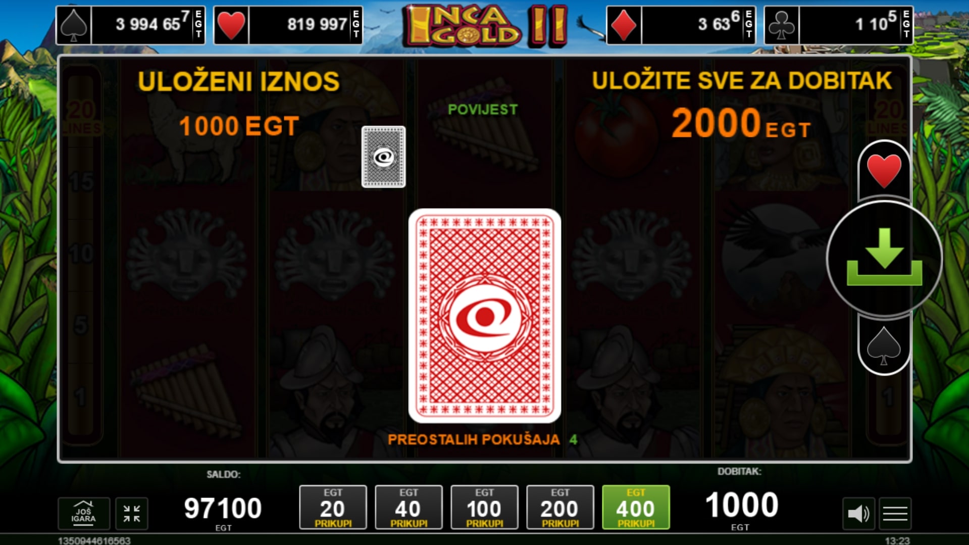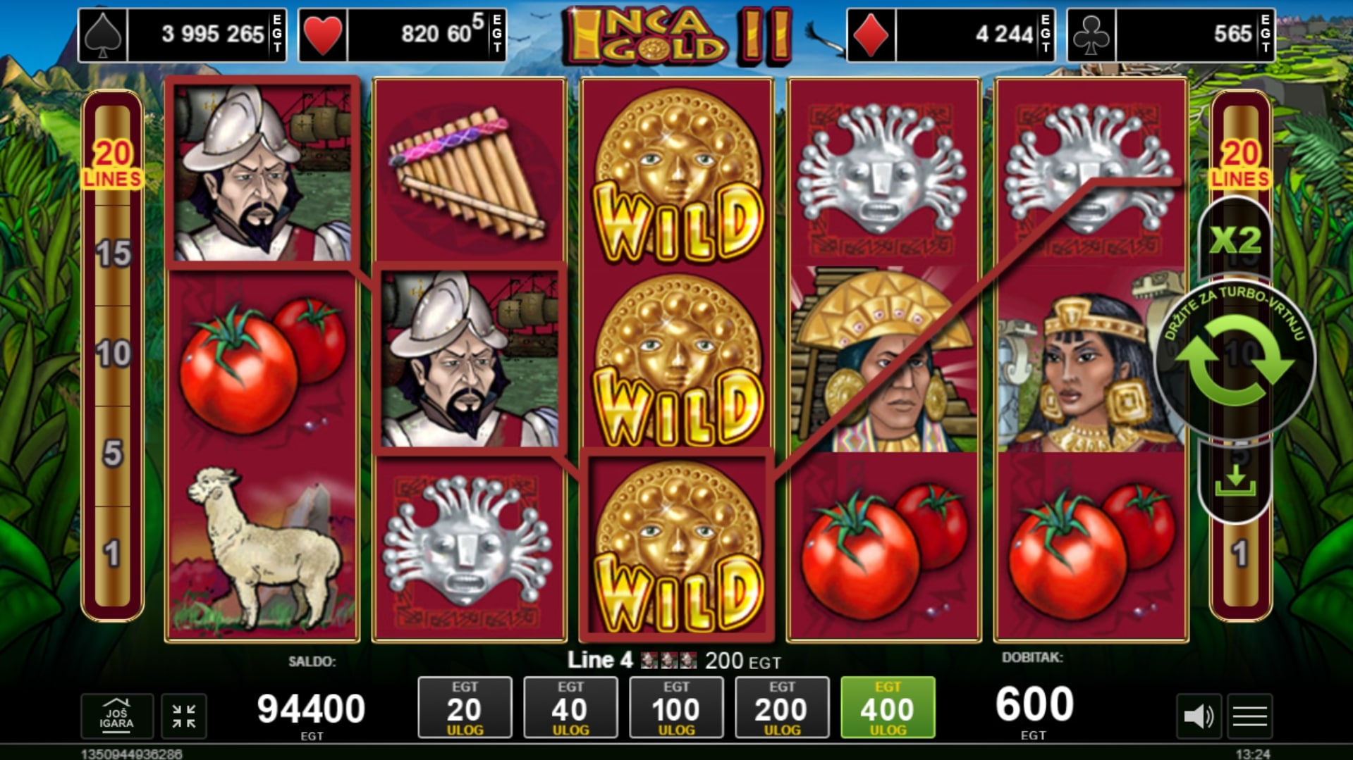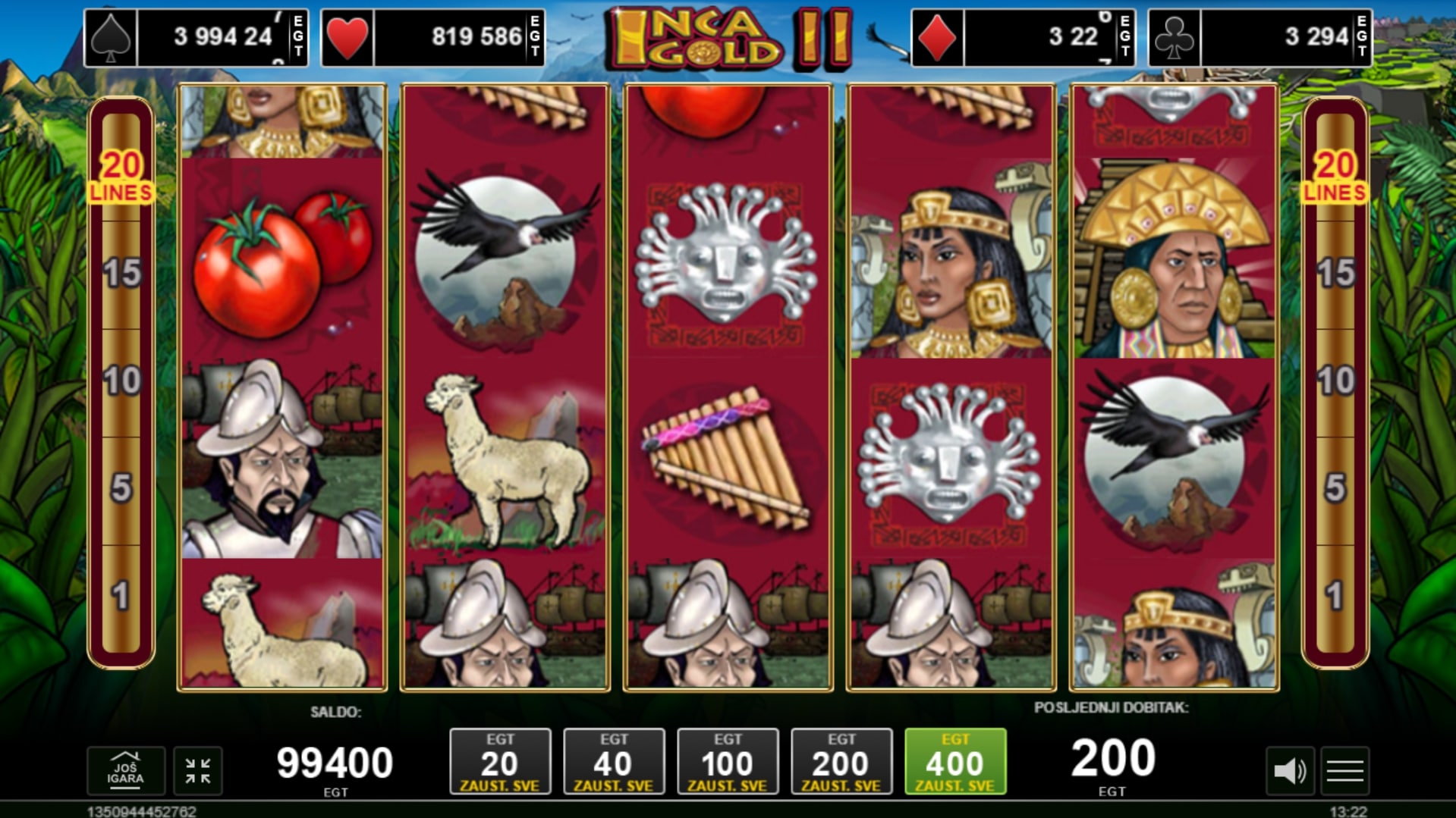Inca Gold II slot je igra povijesne tematike koja vodi igrača kroz povijest jedne od najstarijih civilizacija koja je ujedno zaslužna za famozni Machu Picchu. Najviše isplaćuju simboli raznih domorodaca i zlatnog kipića. Igrač također može okrenuti posebne simbole pozlaćenog sunca i mozaika koji mijenjaju druge simbole, odnosno šalju igrača u svijet besplatnih vrtnji. U slučaju dobitka, igrač ga može pokušati udvostručiti pogađanjem boje karte okrenute licem prema dolje. Zaigraj Inca Gold II te osvoji vrhunske nagrade!