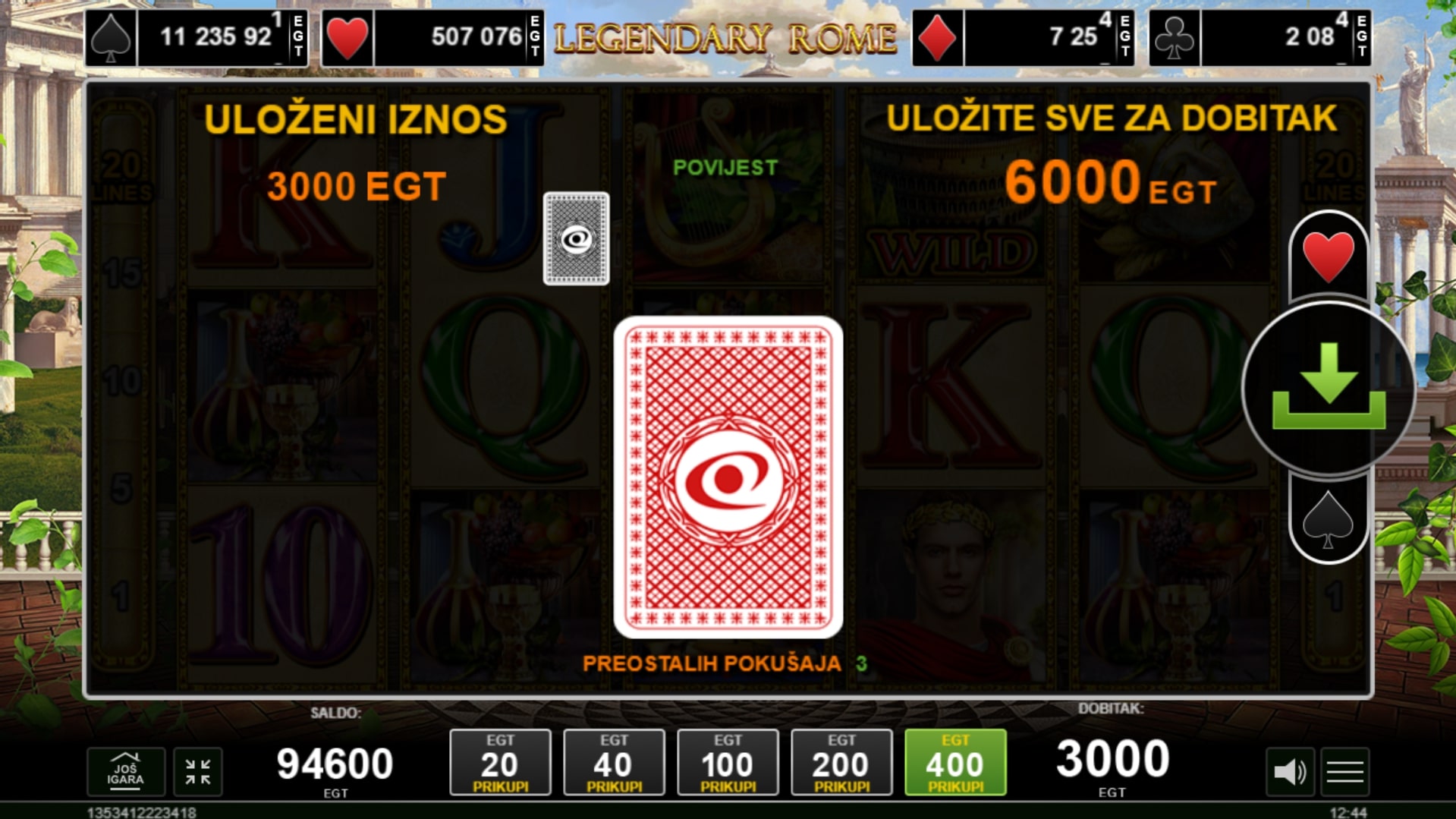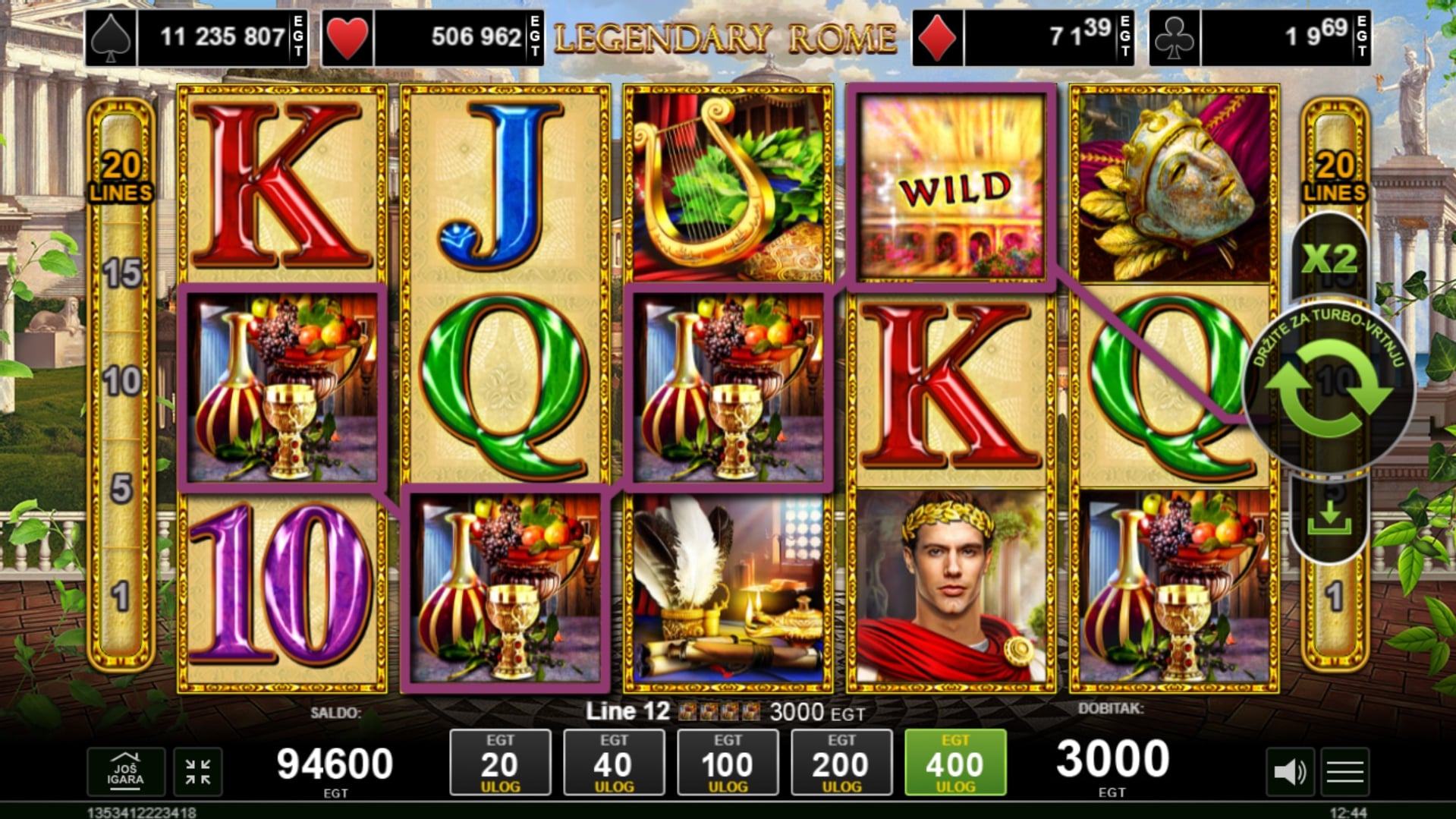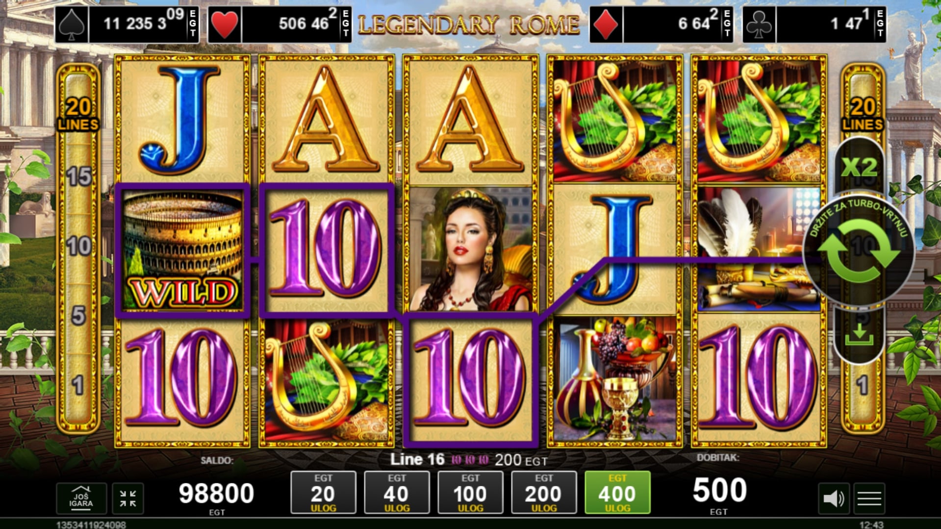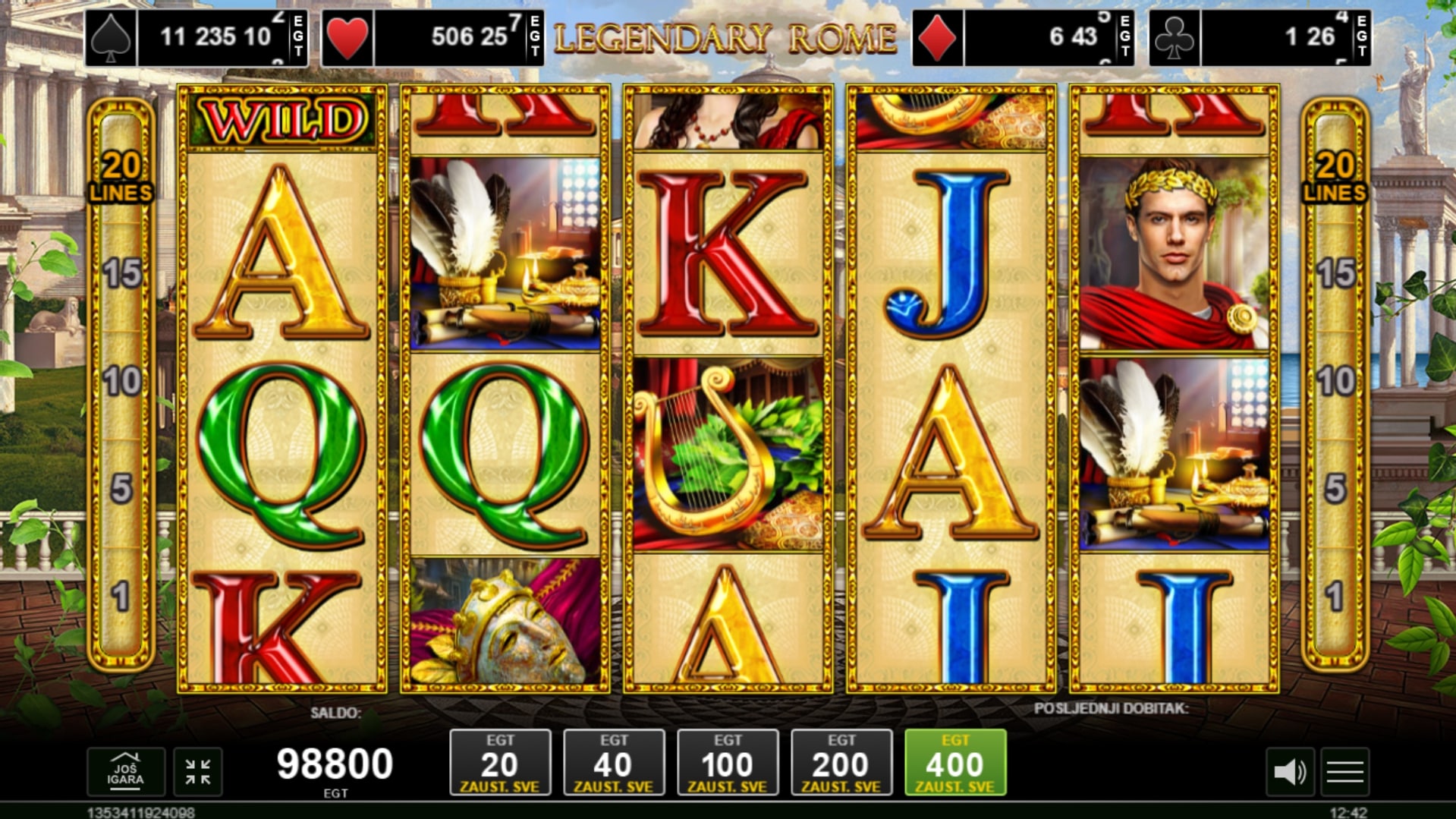 Legendary Rome slot je igra povijesne tematike koja vodi igrača kroz vremeplov razvoja Rima u jedno od najvećih carstva u povijesti. Najviše isplaćuju simboli vladara, harfe i kraljeve maske, dok simbol arene udvostručuje vrijednosti simbola koje mijenja. Besplatne vrtnje ostvaruju se slaganjem simbola vučice iz legende o osnutku Rima, a u slučaju dobitka igrač ih može pokušati udvostručiti pogađanjem boje karte okrenute licem prema dolje. Zaigraj Legendary Rome te ostvari mitske dobitke!