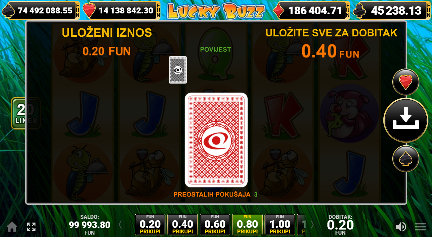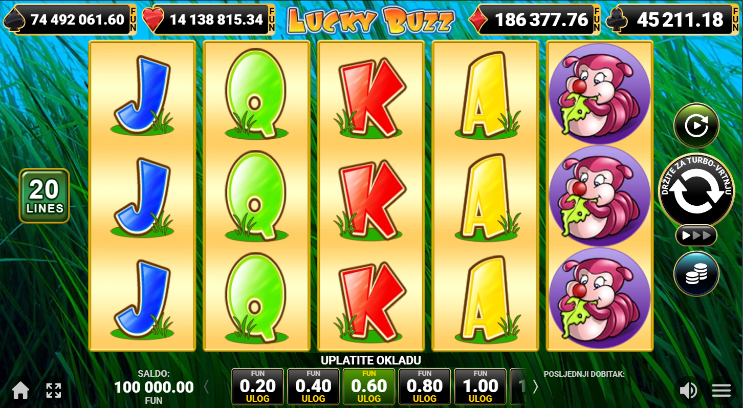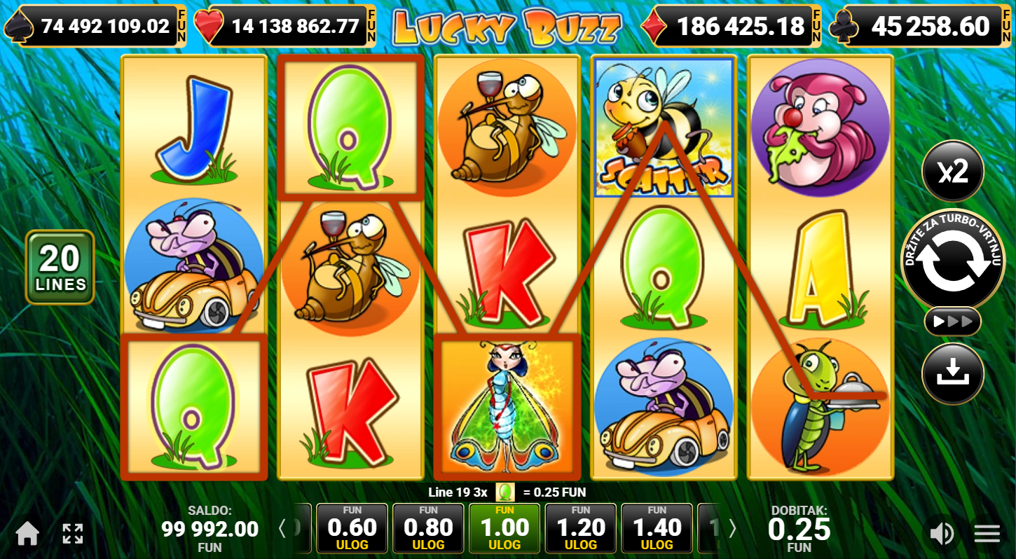 Lucky Buzz je šarena i razigrana slot igra od providera EGT, smještena u veseli svijet kukaca. Na 5 koluta i 20 isplatnih linija upoznat ćeš simpatične pčele, skakavce i leptire koji kriju razne bonuse. Wild simboli, Scatteri i prepoznatljiva Jackpot Cards značajka čine igru bogatom sadržajem. Uz šarmantnu grafiku i laganu glazbu, igra pruža zabavno i opuštajuće iskustvo. Savršena je za sve igrače koji vole klasične slot mehanike s vedrim zaokretom.