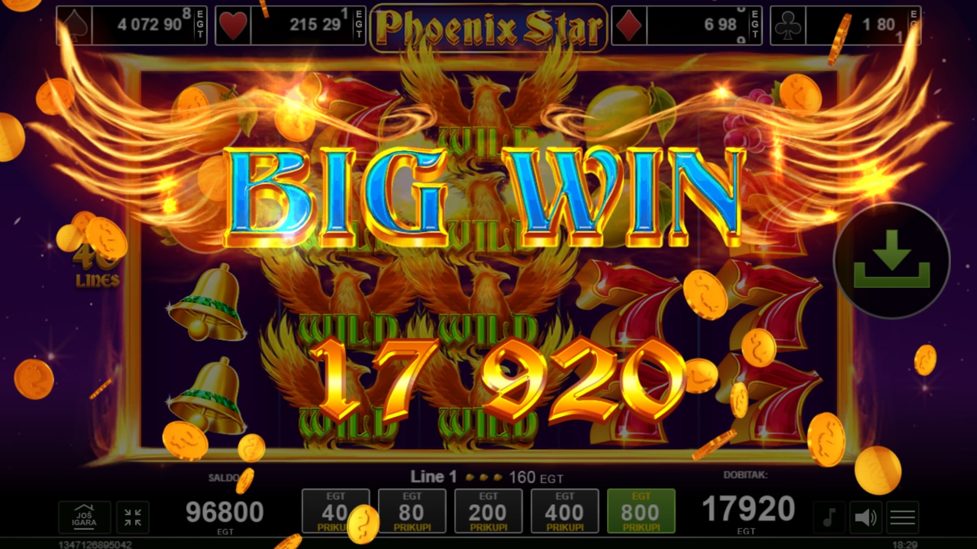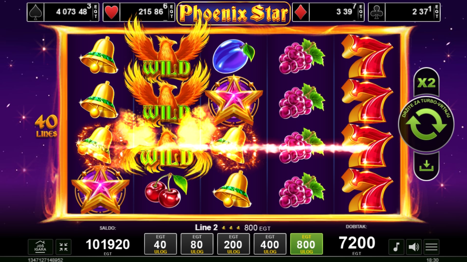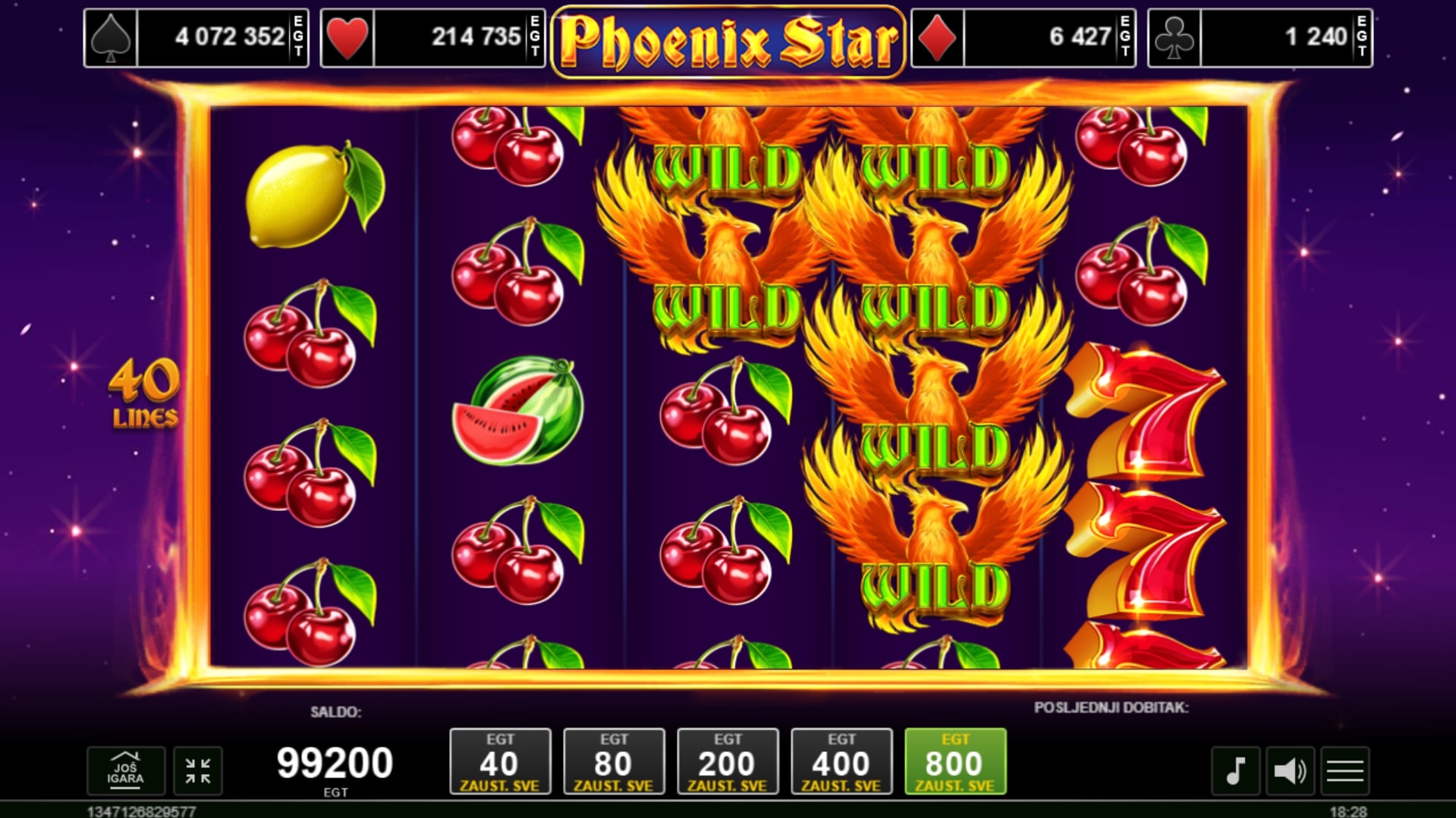 Phoenix Star slot je igra užarene atmosfere koja vodi igrača u svijet voća i vatrenih nagrada. Najviše isplaćuju simboli sedmica, zvona, lubenica i grožđa, a igra uz to sadrži posebne simbole Feniksa i zvijezde. Feniks mijenja druge simbole u potrazi za dobicima, a ovaj potonji isplaćuje bez obzira gdje se nalazi. U slučaju osvajanja određenog iznosa vrtnjom, igrač ga može pokušati 'poduplati' pogađanjem boje karte okrenute licem prema dolje. Zaigraj Phoenix Star te ostvari fenomenalne dobitke!