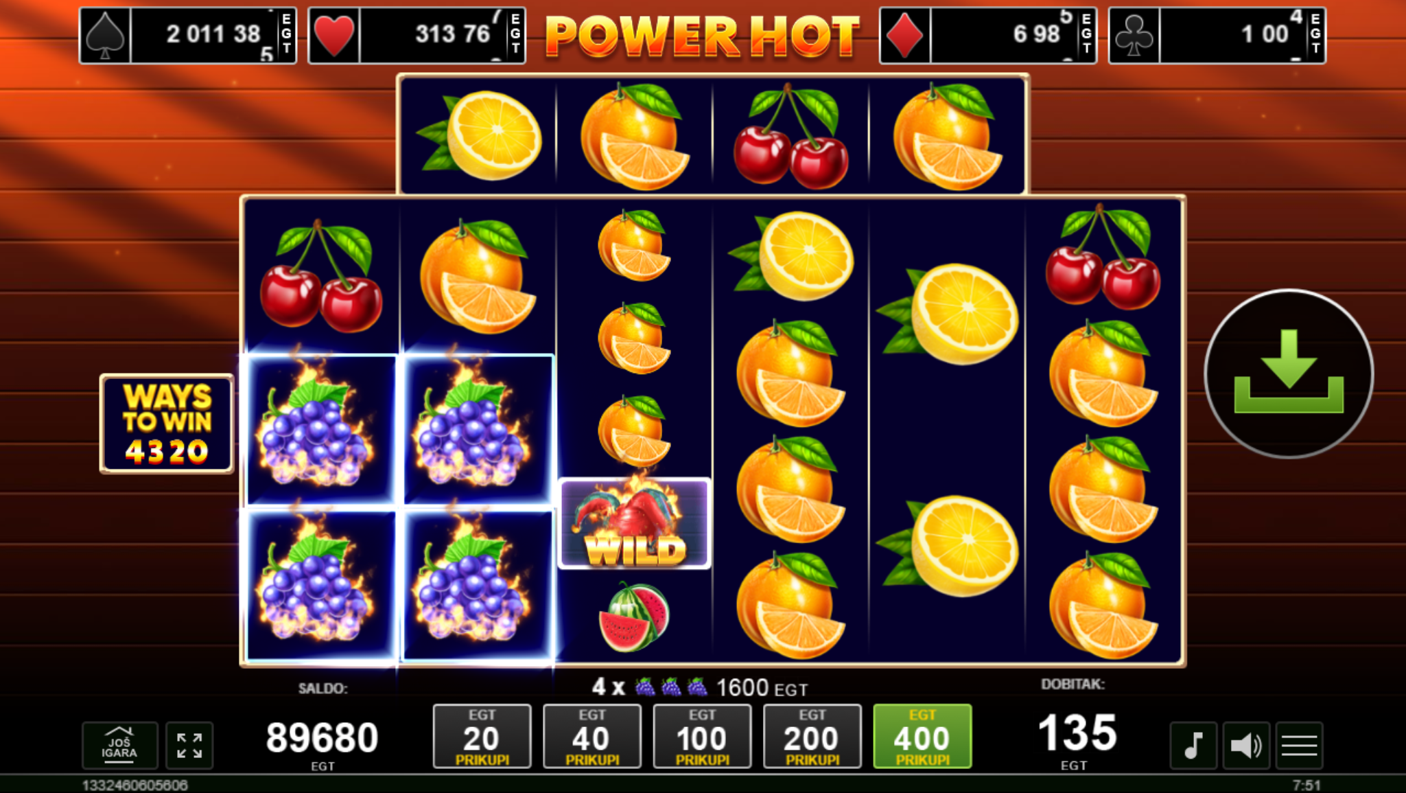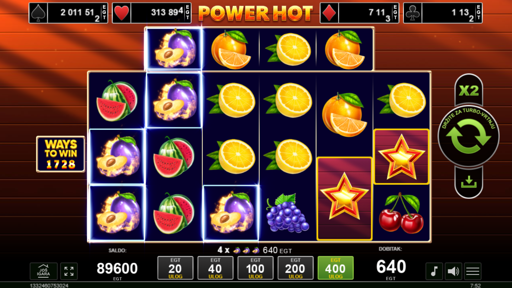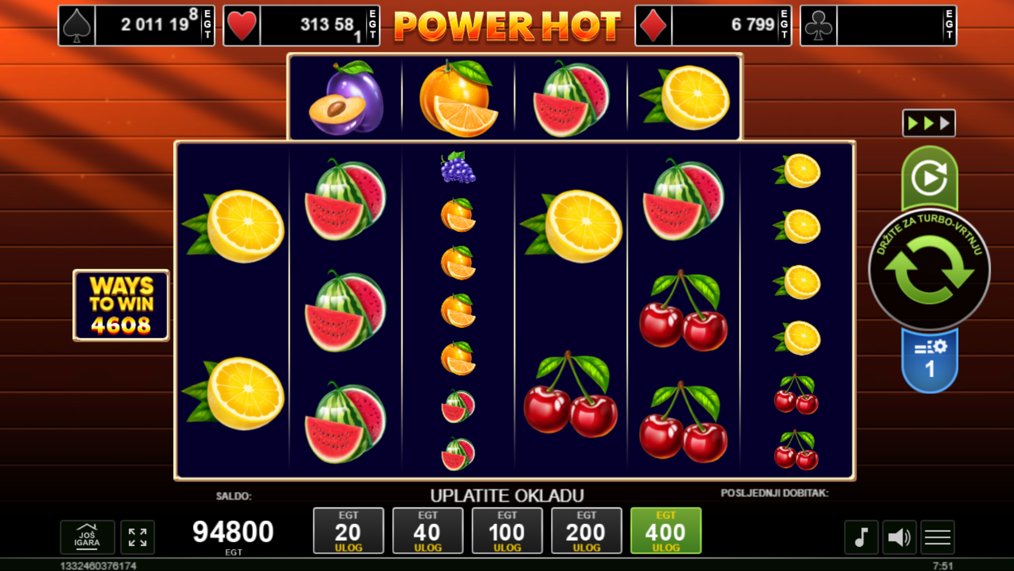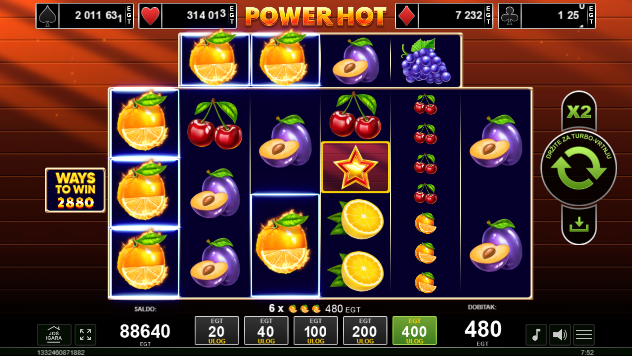 Svatko tko voli jednostavne slotove sa elegantnim simbolima i dozom uzbuđenja na pravom je mjestu, jer Power Hot pruža sve to, a i mnogo više. Primamljivo voće učiniti će igranje zabavnijim i zanimljivijim, a tajanstvena "jackpot cards" bonus igra super uzbudljivim te bogatim po pitanju dobitaka! Kao jedan od najpopularnijih slotova, Power Hot odličan je izbor za sve igrače koji vole izvrstan omjer rizika i dobitaka.
