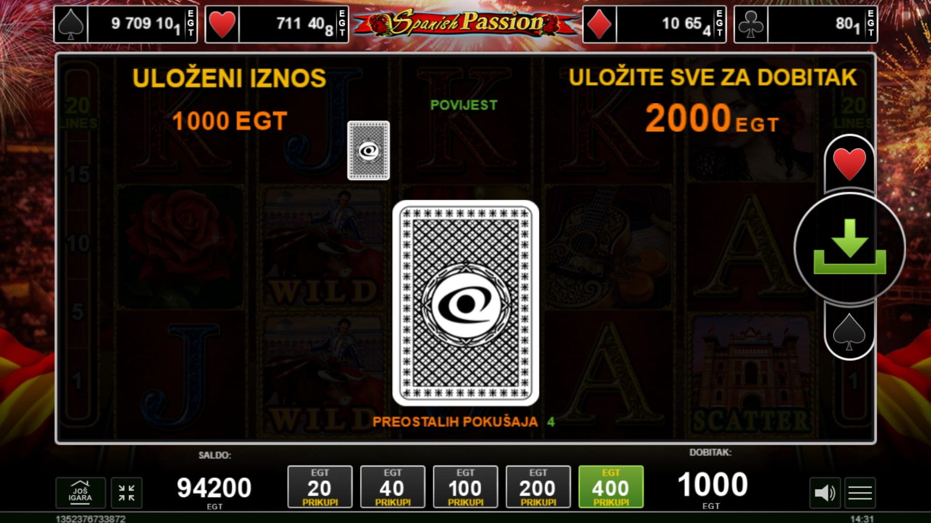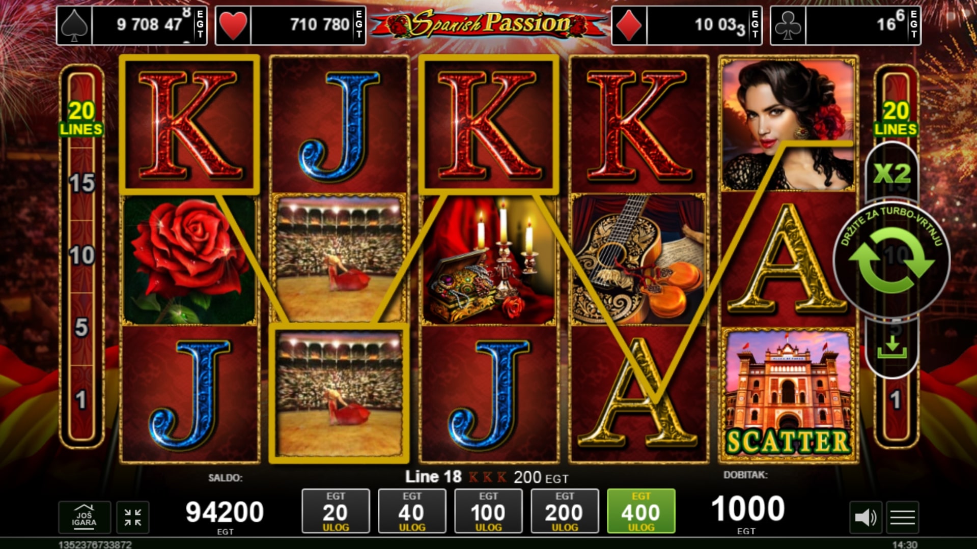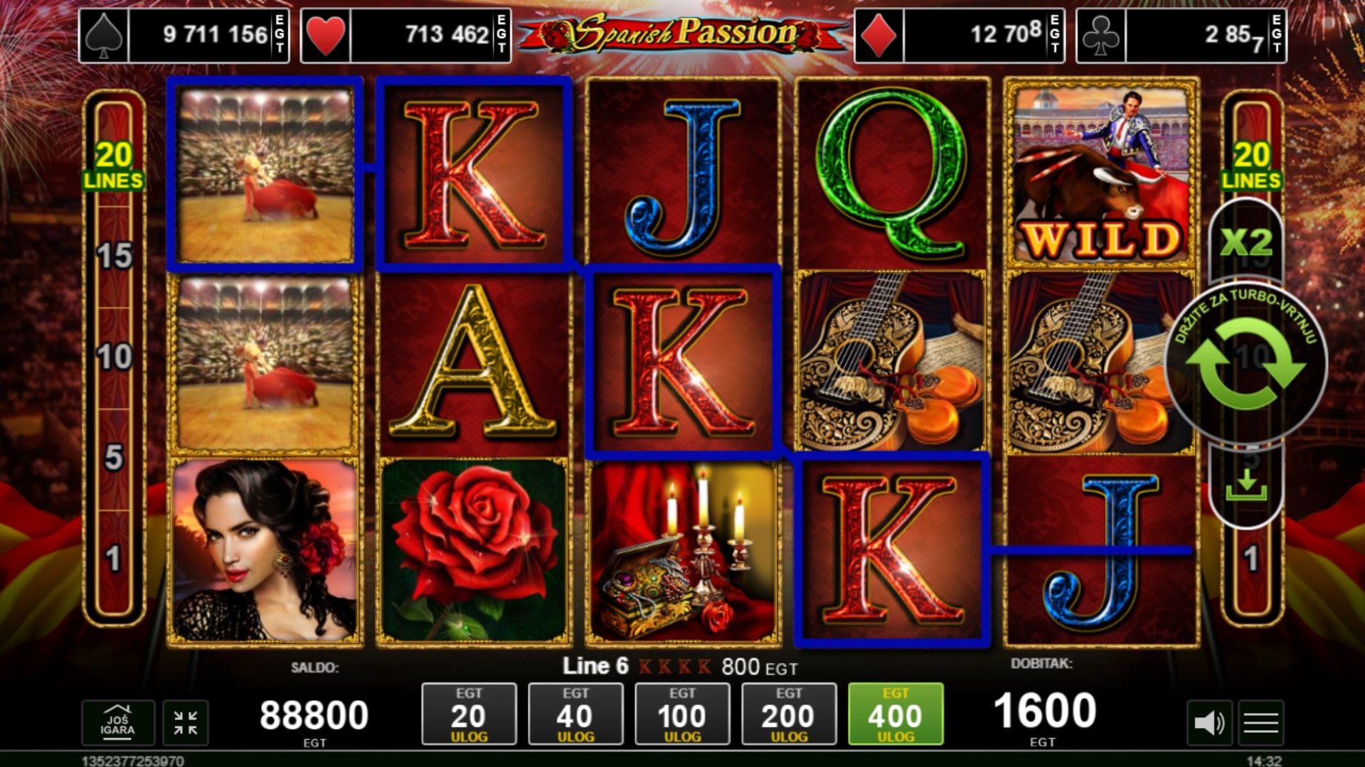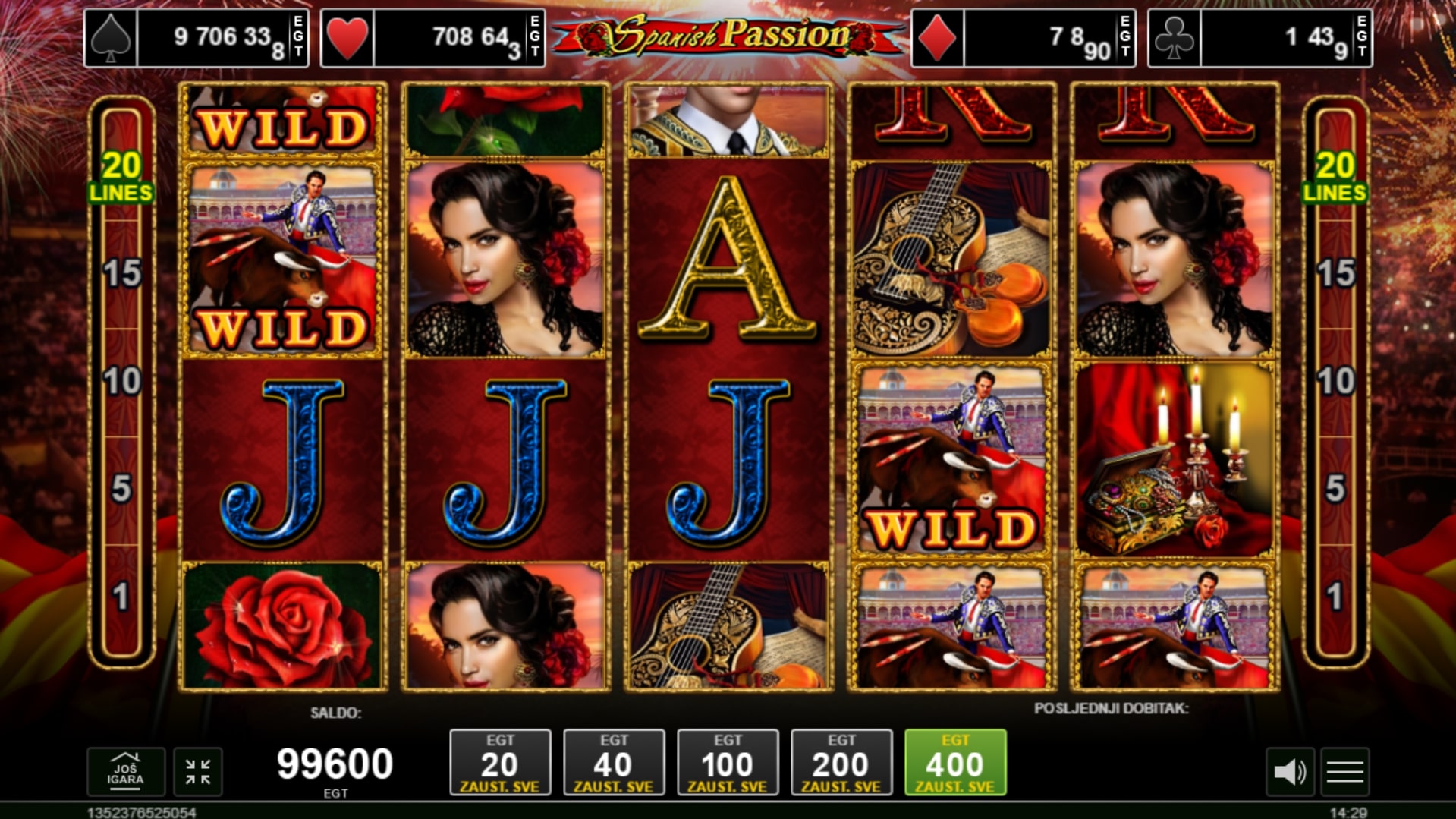Spanish Passion slot je igra pustolovne tematike koja vodi igrača na Pirenejski poluotok u svijet adrenalina i romantike gdje vladaju veliki dobici. Najviše isplaćuju simboli matadora i plesačice, a zatim slijede gitare, ruže i kovčezi sa zlatom. Igrač također može okrenuti posebne Wild i Scatter simbole koji služe kao zamjena za druge simbole, odnosno aktiviraju besplatne vrtnje. U slučaju dobitka, igrač ga može pokušati 'poduplati' pogađanjem boje karte okrenute licem prema dolje. Zaigraj Spanish Passion te ostvari vrhunske nagrade!
