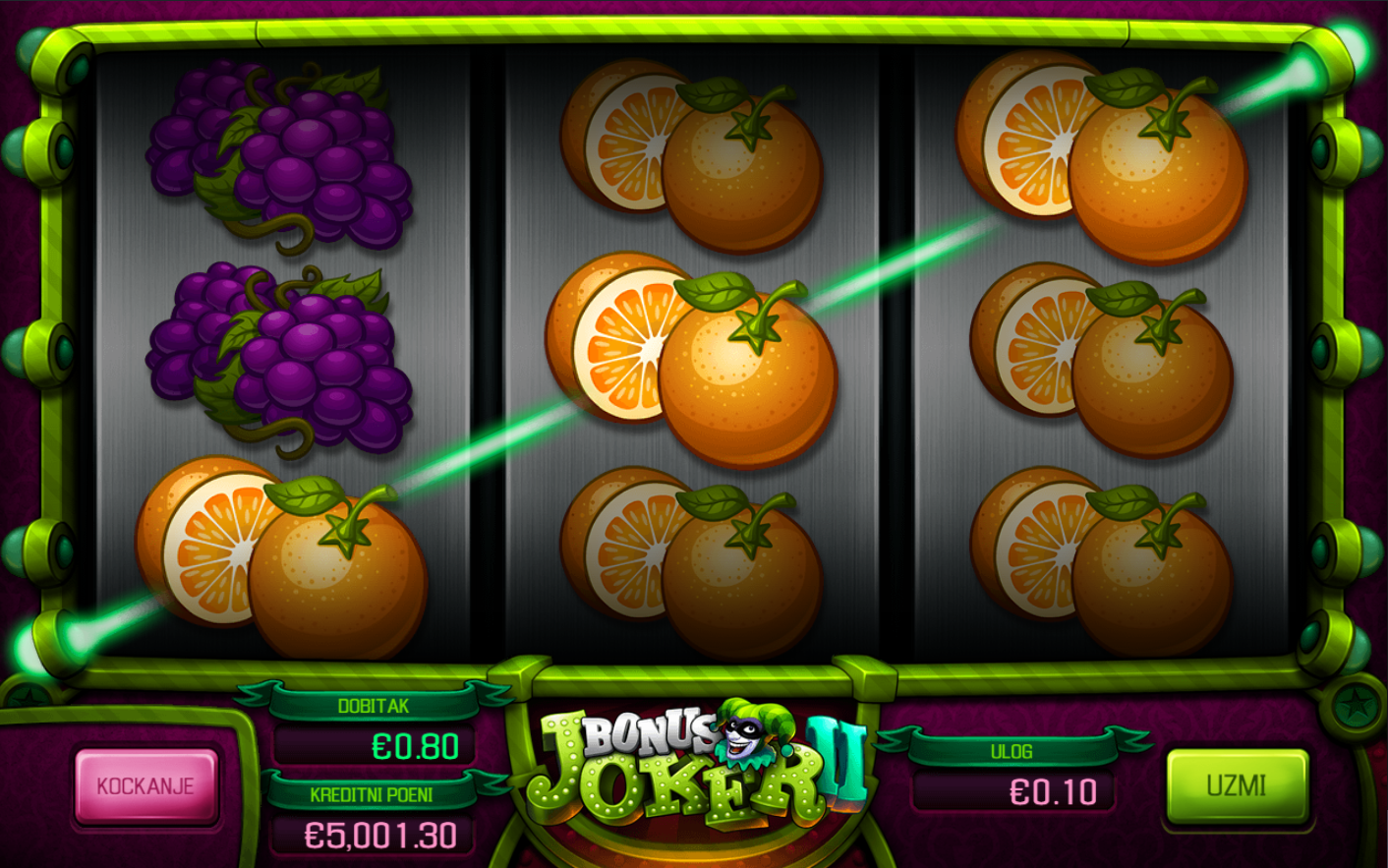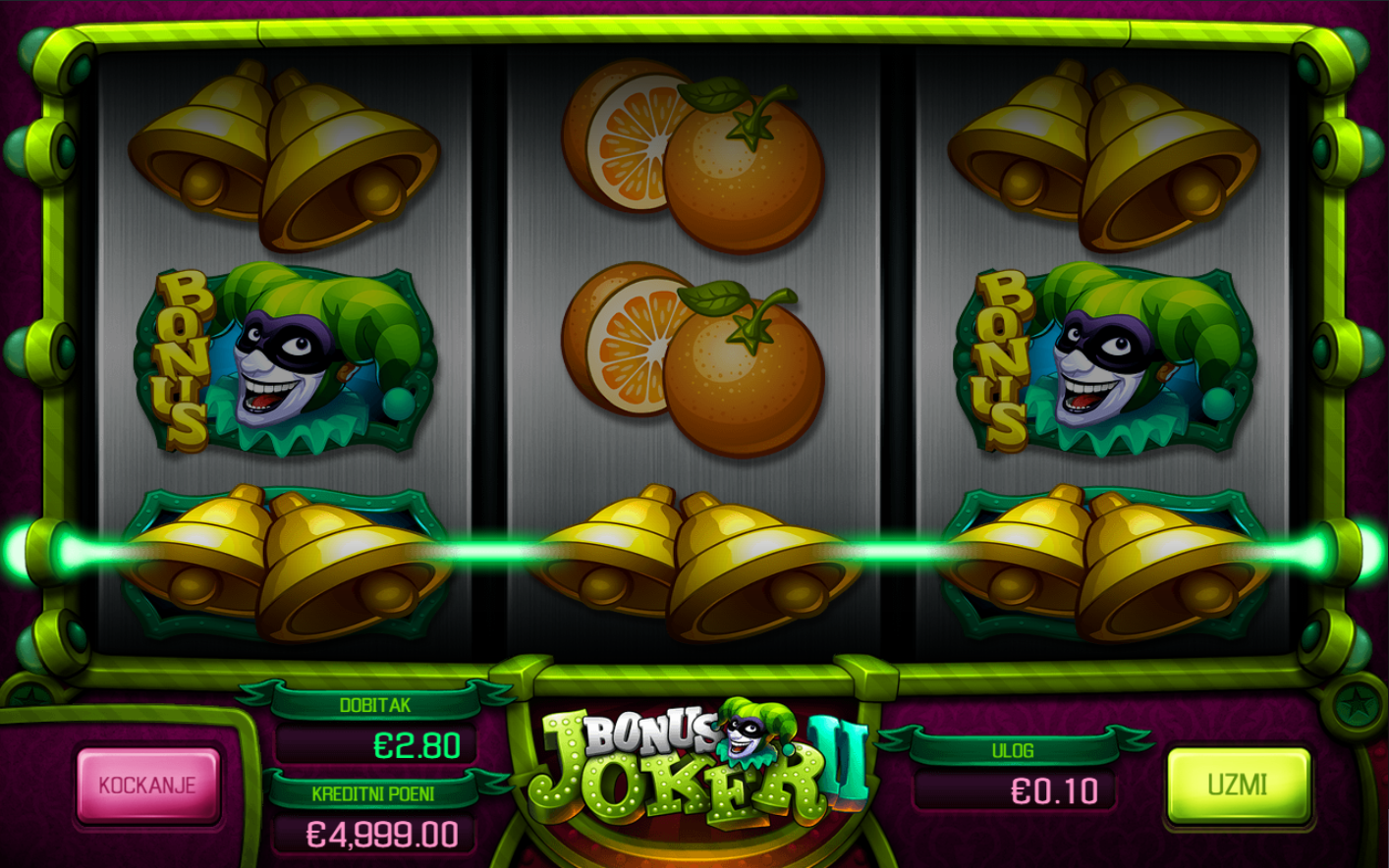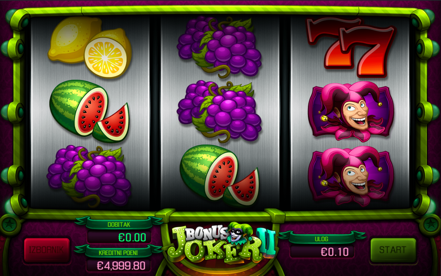 OPIS IGRE: Dobro došli u Bonus Joker II! Ova uzbudljiva igra pruža šansu za osvajanje velikih nagrada zavrtanjem kolutova. Tvoj cilj je dobiti tri istovjetna simbola u barem jednoj od pet isplatnih linija. Bonus igra s simbolom BONUS JOKER donosi dodatne nagrade, a JOKER simbol može zamijeniti svaki drugi simbol osim BONUS JOKERA, čime se povećava tvoja šansa za dobitak. Uz napete trenutke kockanja, Bonus Joker II nudi sve što trebaš za nezaboravno igranje.