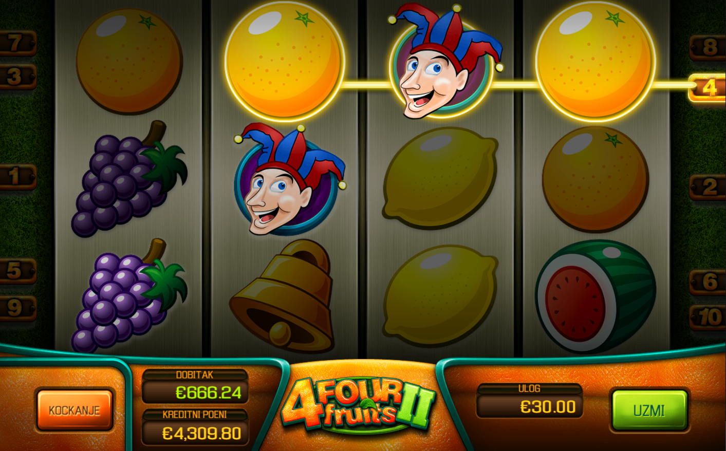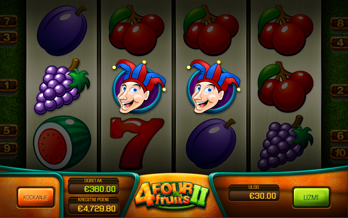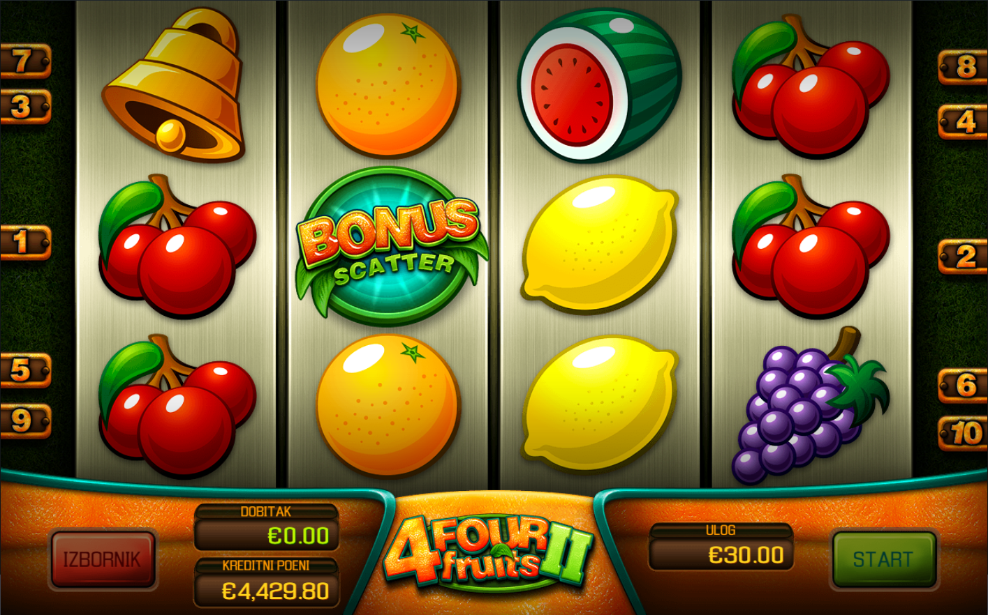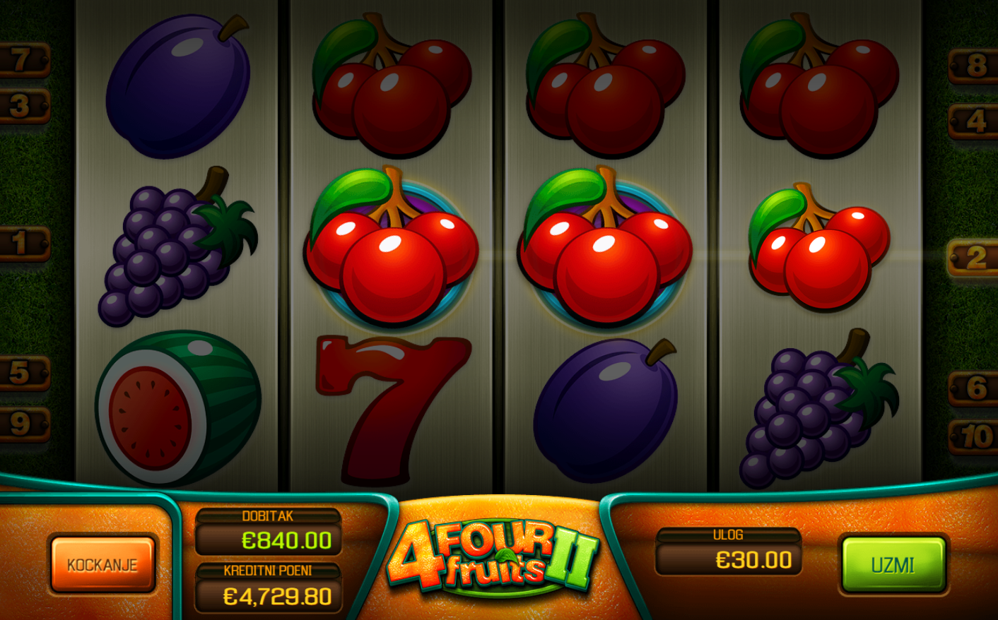 OPIS IGRE: U igri Four Fruits II, uživat ćeš u raznolikim bonusima i klasičnim voćnim simbolima. Ova igra nudi uzbudljive mogućnosti za dobitak uz fantastične bonus runde i velike jackpotove. S deset isplatnih linija i brojnim šansama za dobitak, ova igra će te uvesti u svijet svježeg voća i sočnih nagrada. Pokušaj spojiti tri identična simbola na isplatnim linijama i osvoji velike nagrade!