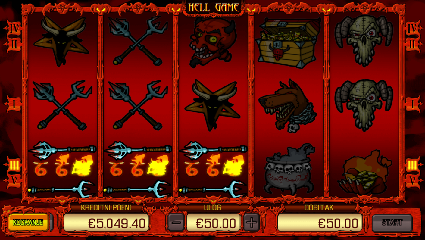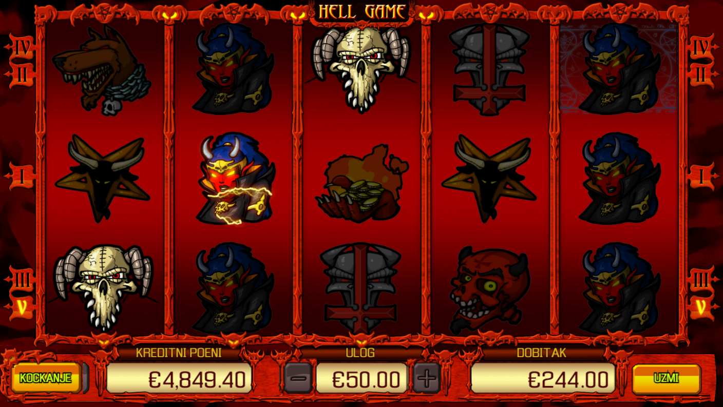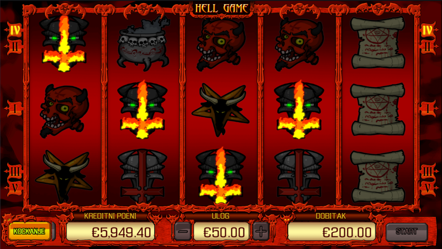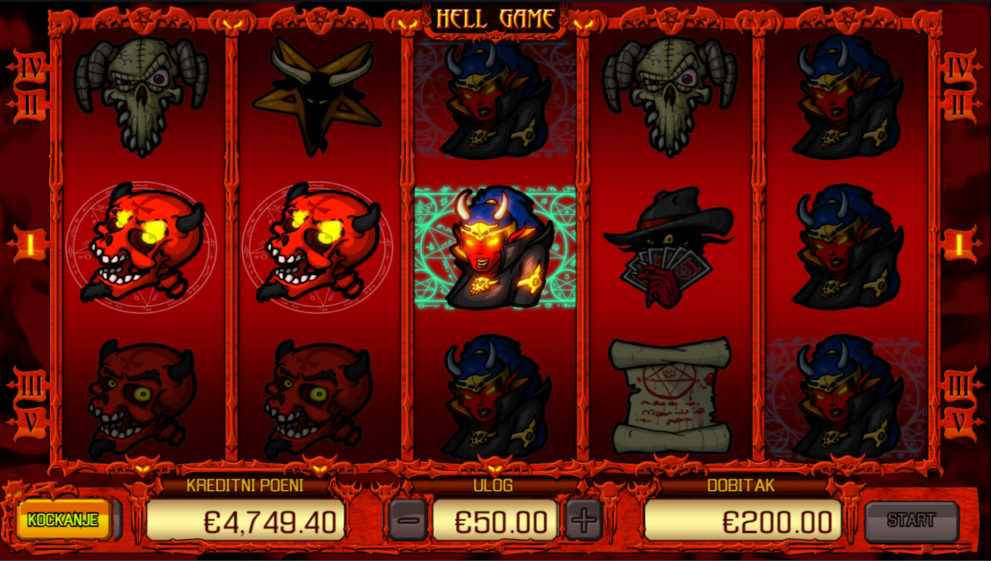OPIS IGRE: U igri Hell Game, uživat ćeš u raznolikim bonusima i simbolima inspiriranim paklom. Ova igra nudi uzbudljive mogućnosti za dobitak uz fantastične multiplikatore i velike jackpotove. S pet isplatnih linija i brojnim šansama za dobitak, ova igra će te uvesti u svijet vatrenih simbola i sočnih nagrada. Pokušaj spojiti dva do pet identičnih simbola na isplatnim linijama i osvoji velike nagrade!