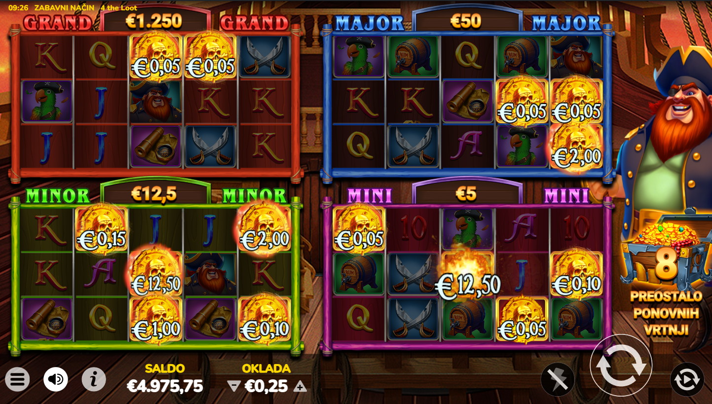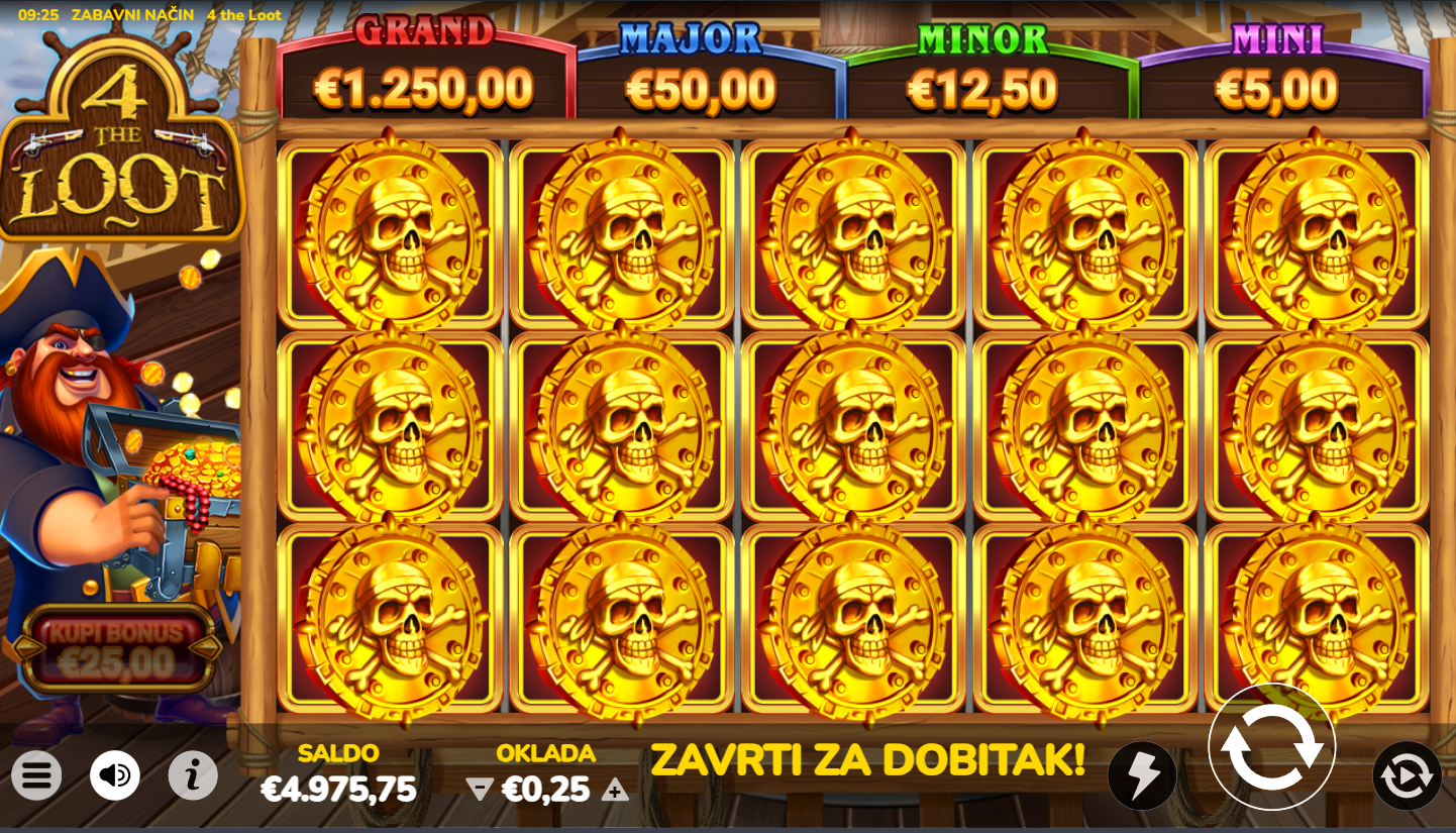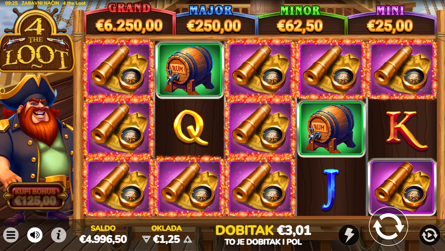 Vrtiš mrežu od 5x3 s 25 linija, ciljaš 6+ zlatnih kovanica i bum! Ulaziš u bonus s čak četiri aktivne mreže. Imaš 8 respinova, sticky kovanice i šansu za Grand jackpot od 5000×. Bonus se može i kupiti, ako si nestrpljiv pirat željan akcije! Sve je brzo, šareno i napeto, kao pravi lov na blago.