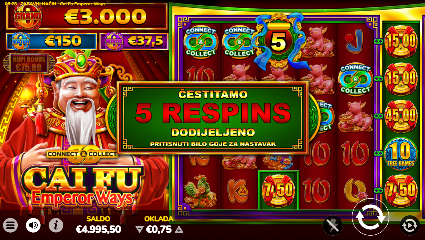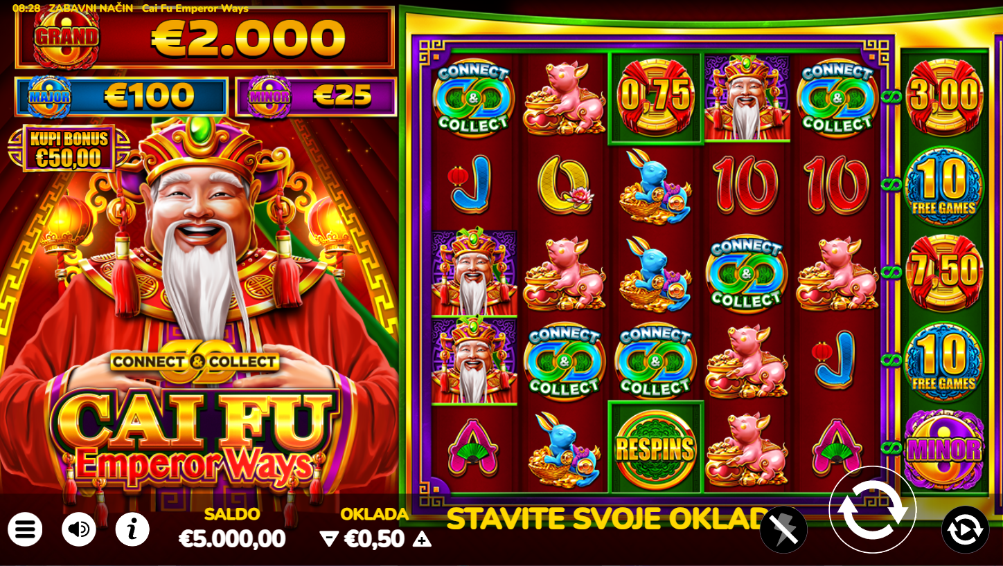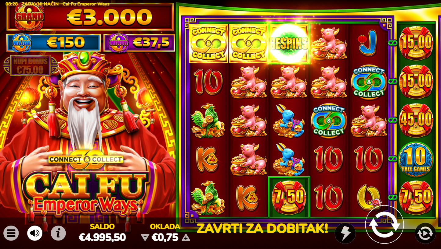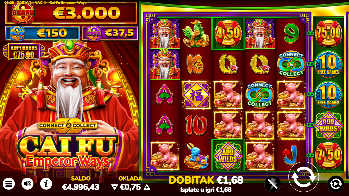 Cai Fu Emperor Ways ima RTP od 95.52% i srednju volatilnost, što znači da stabilna igra donosi solidnu dozu uzbuđenja. Iako dobici nisu stalni, poveći trenuci mogu brzo podići atmosferu što je baš idealno za one koji traže balans između igre i napetosti.