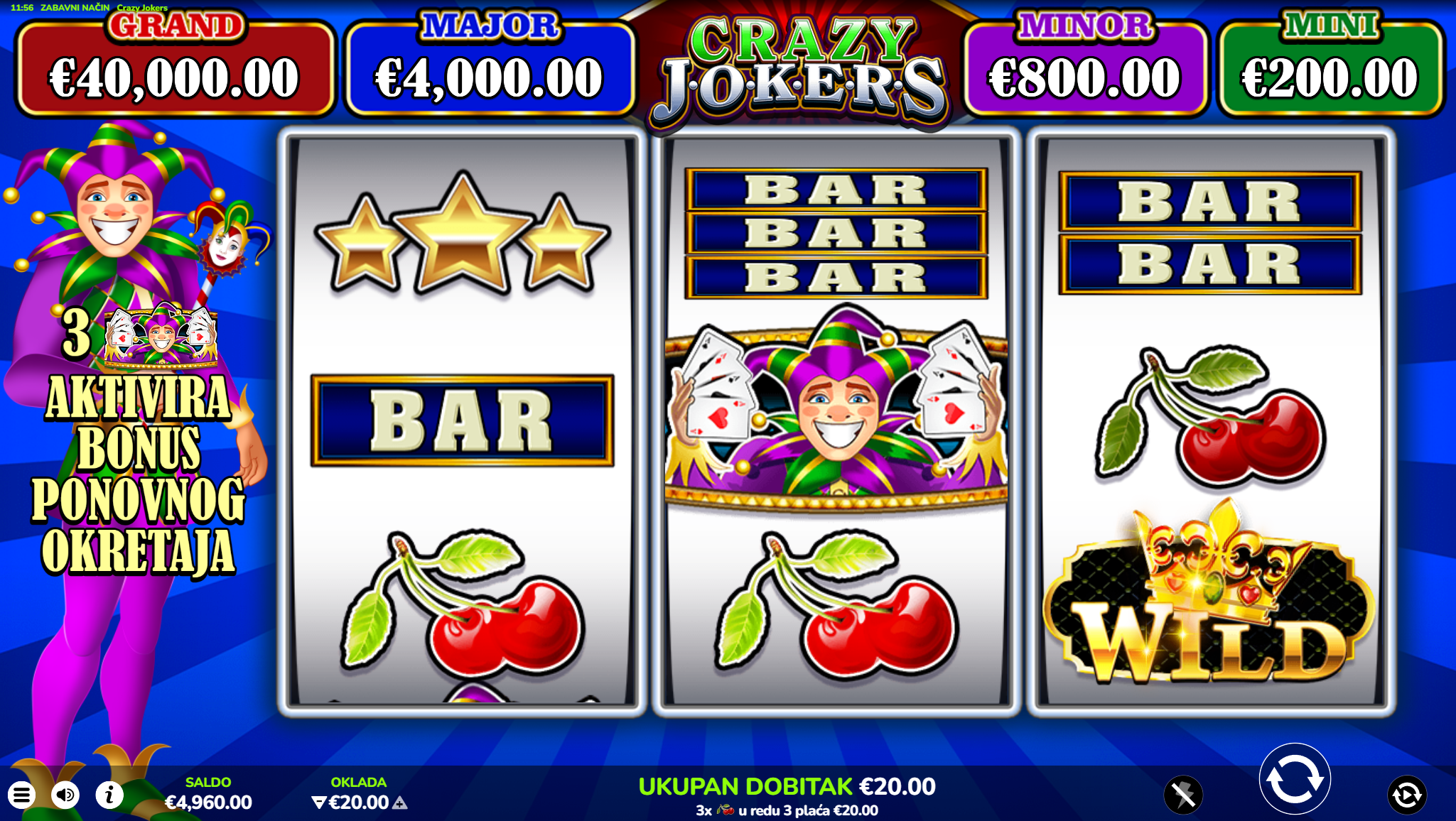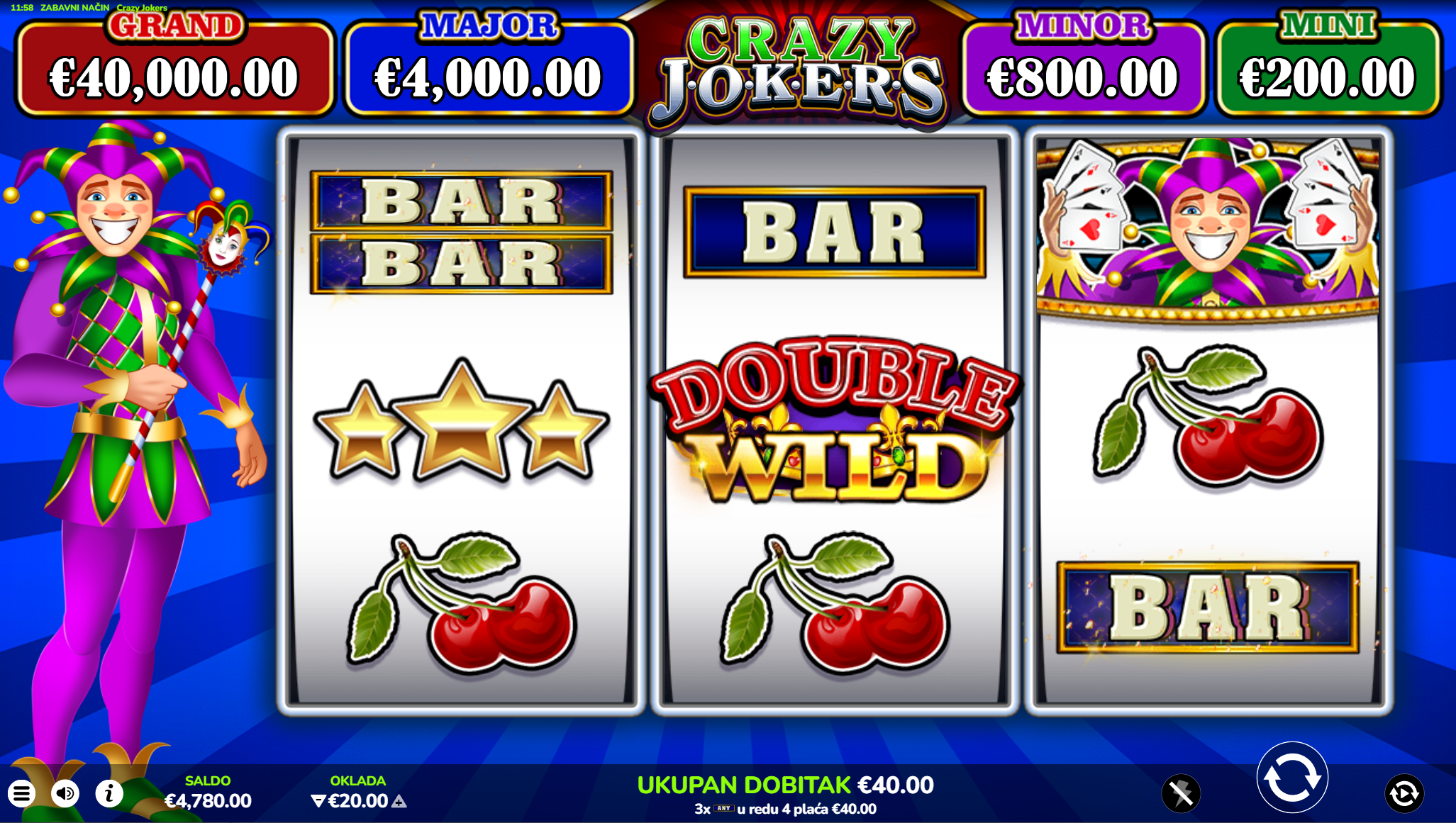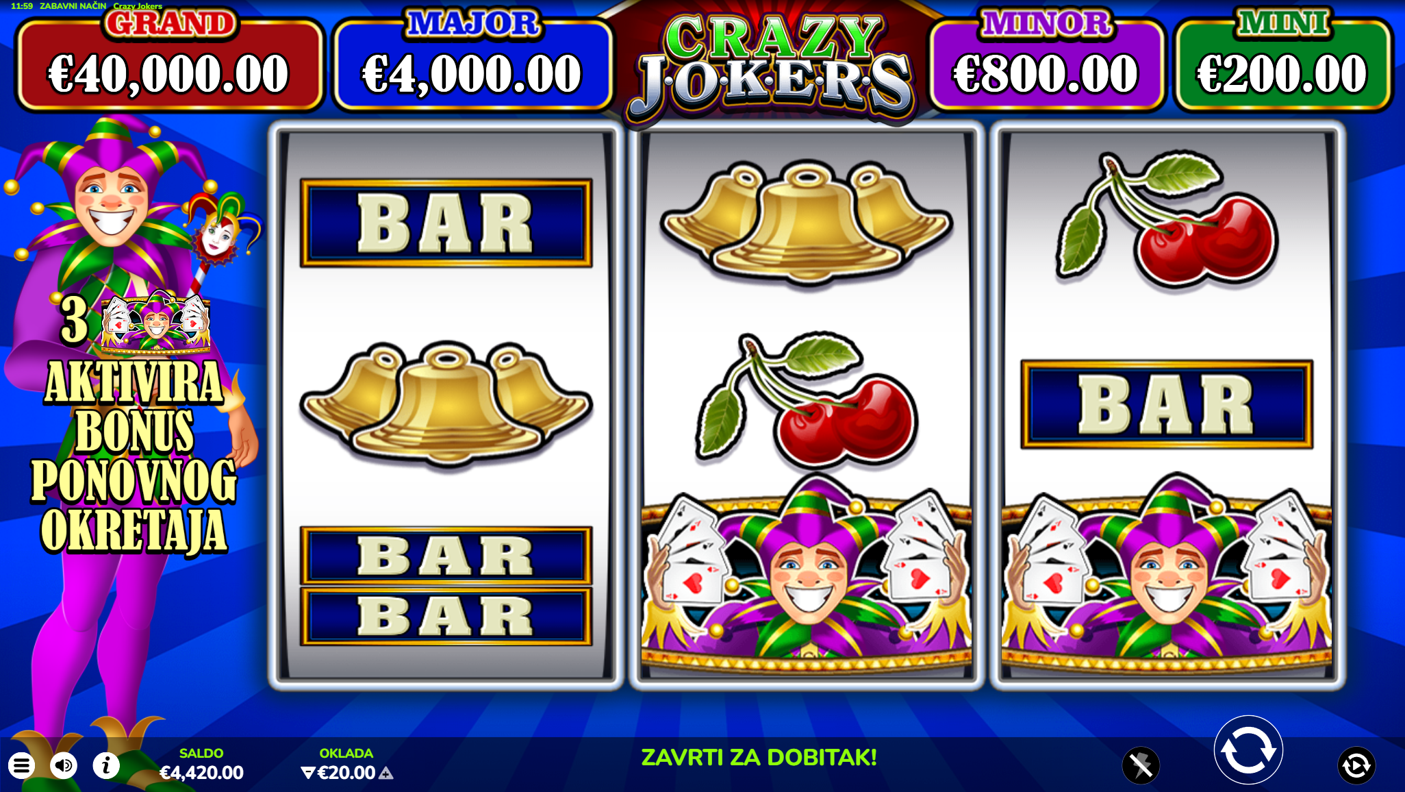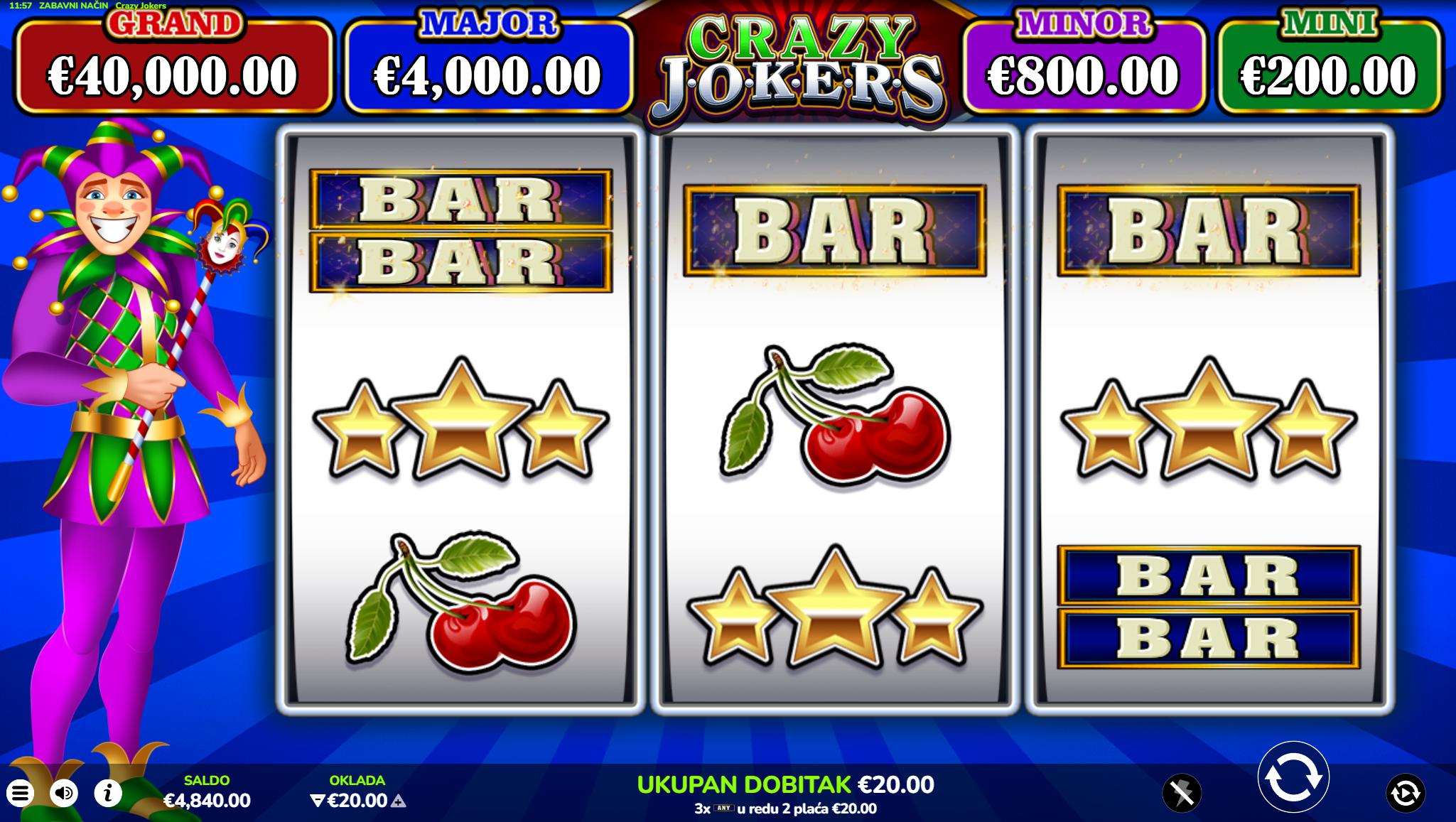 Dobrodošao u Crazy Jokers, zabavnu avanturu inspiriranu gomilom sočnog voća i tajanstvenih jokera koji će ti uz nezaboravno igranje donjeti i velike dobitke! Primamljivo ilustrirano voće jednostavnog dizajna, kao i način igranja učiniti će dozu zabave i zanimacije nedostižnom! Kako uzbuđenju tu nebi bio kraj, pobrinuti će se joker simbol i igranje pretvoriti u super uzbudljivo te bogato po pitanju dobitaka! Kao jedan od najpopularnijih slotova, Crazy Jokers odličan je izbor za sve igrače koji vole izvrstan omjer rizika i dobitaka.