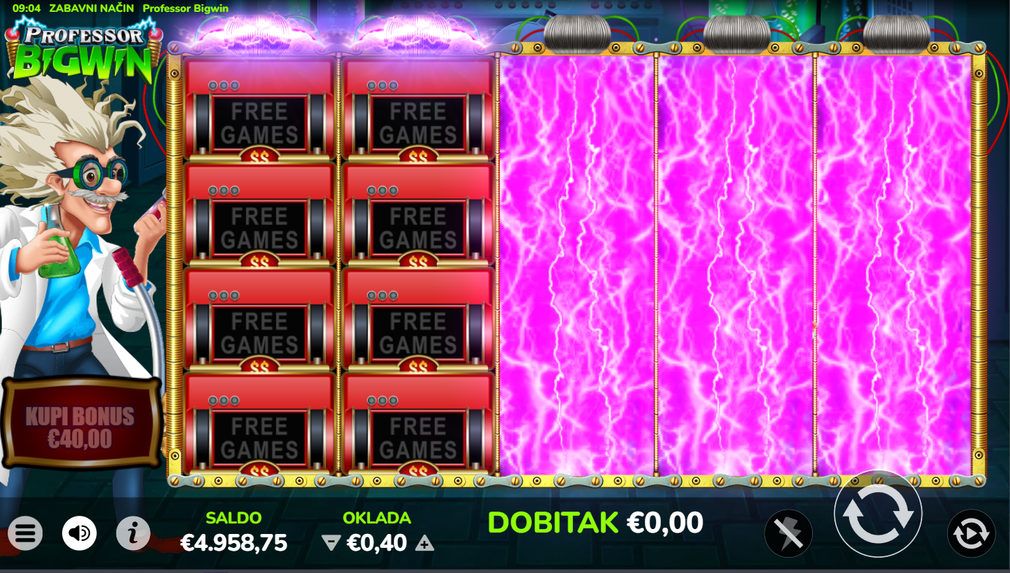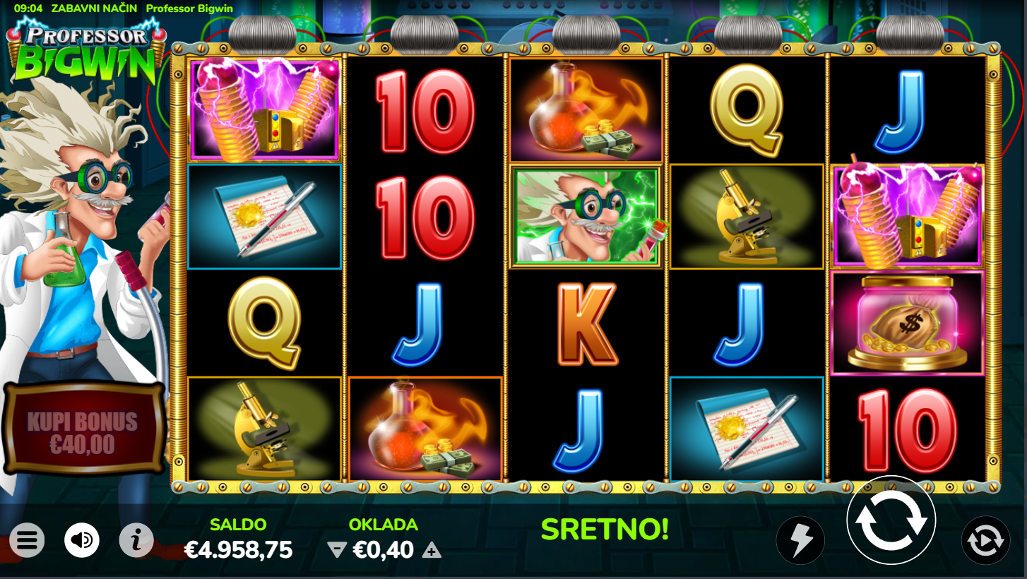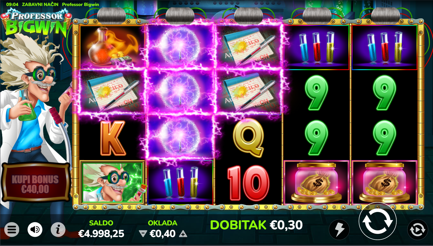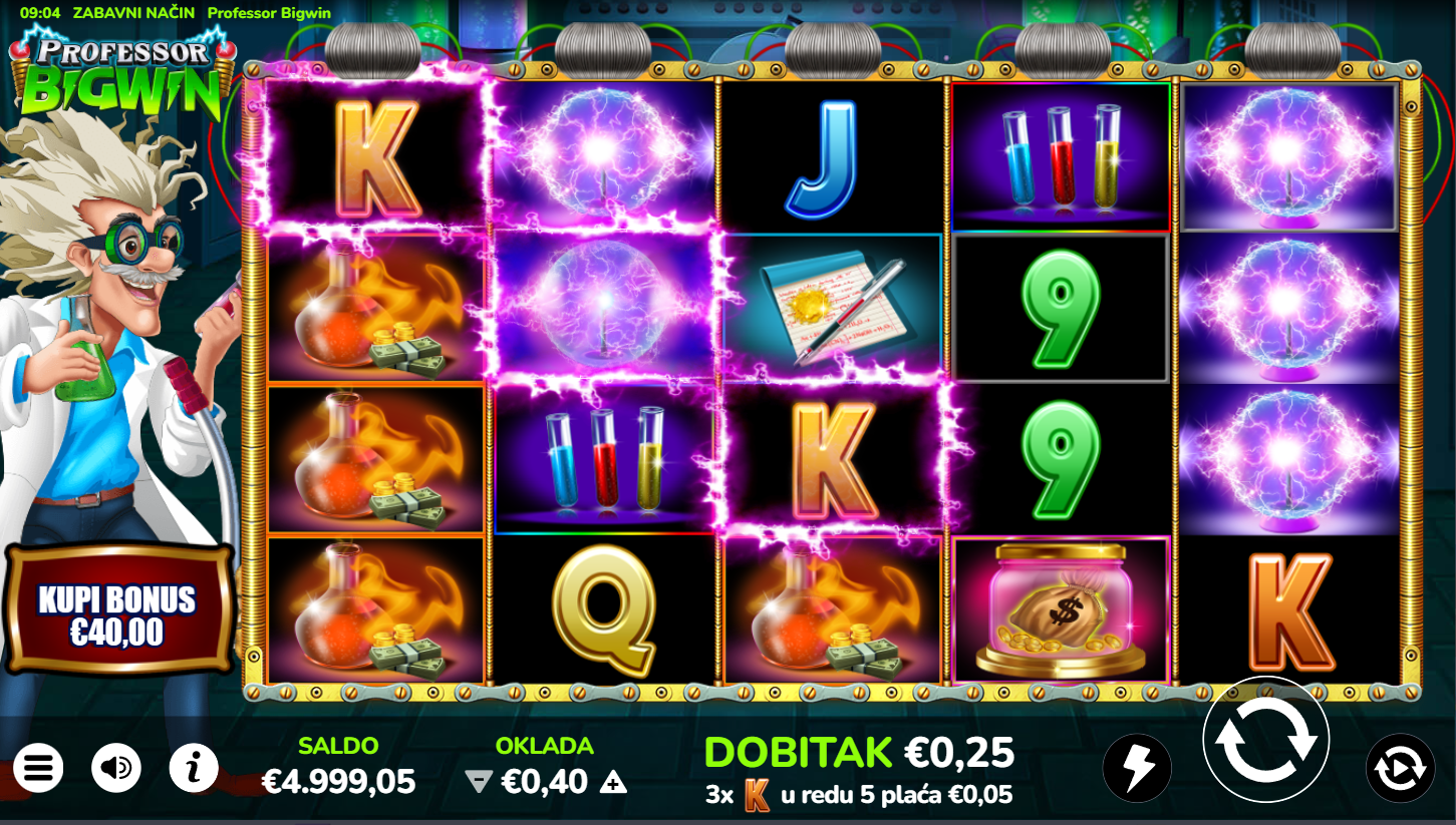 Vrti kolute i pazi na bočice, napitke i, naravno, samog Profesora! On donosi bonus značajke, besplatne vrtnje i nasumične množitelje. Igra je brza, zabavna i nepredvidiva, baš kao znanstveni eksperiment koji iznenadi svakim rezultatom. Svaki spin može pokrenuti lančanu reakciju dobitaka!