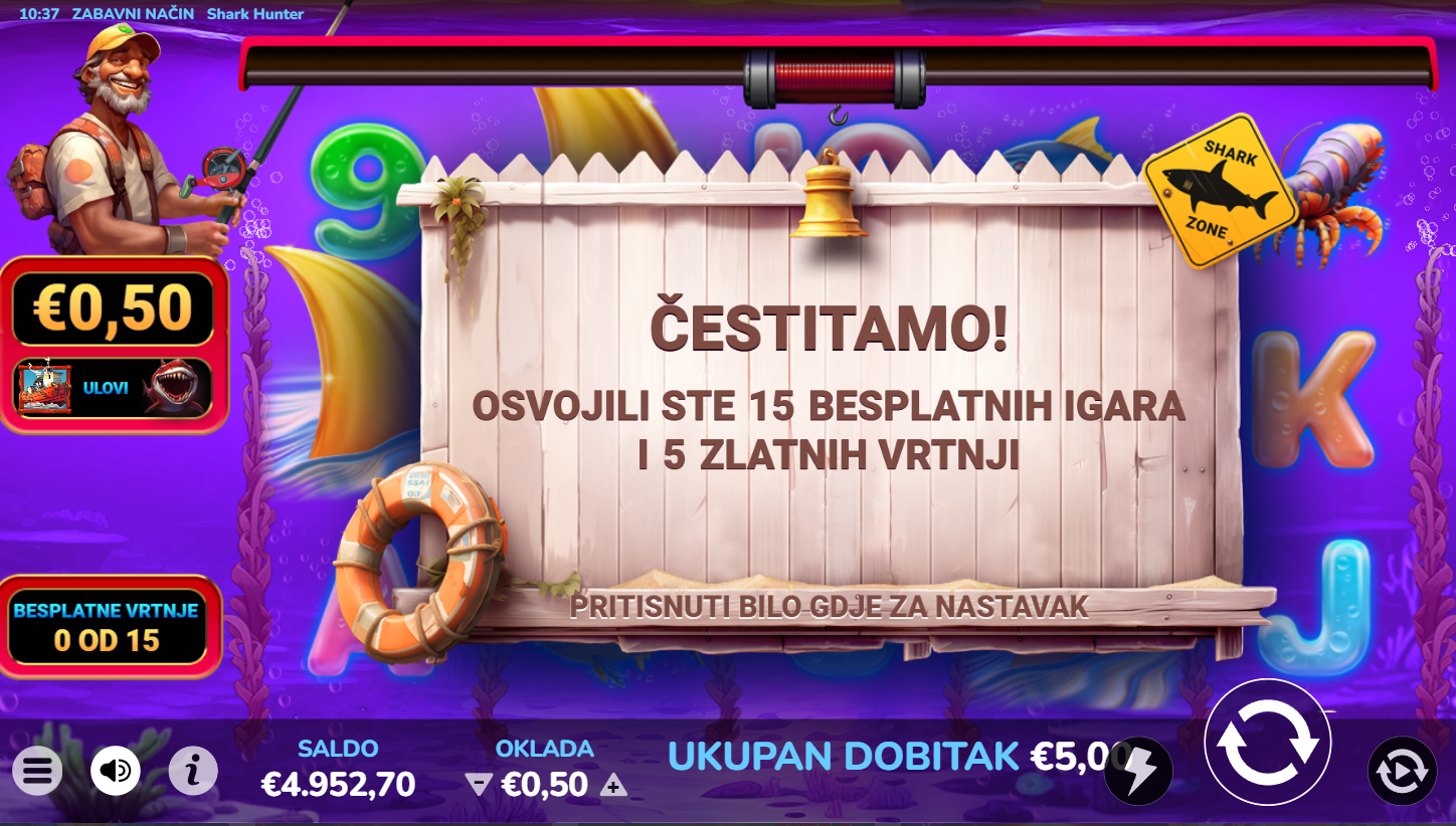 Vrti kolute i skupljaj simbole riba, sidara i opreme za ronjenje! Tri ili više Scatter simbola aktiviraju besplatne vrtnje s dodatnim množiteljima, dok Wild simbol u obliku morskog psa donosi najveće nagrade. Igra nudi brzu, napetu akciju i jednostavnu mehaniku koja te vuče sve dublje u ocean dobitaka. Spremi harpun, lov na jackpot upravo počinje!
