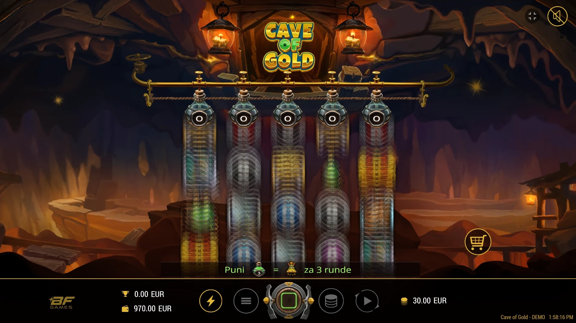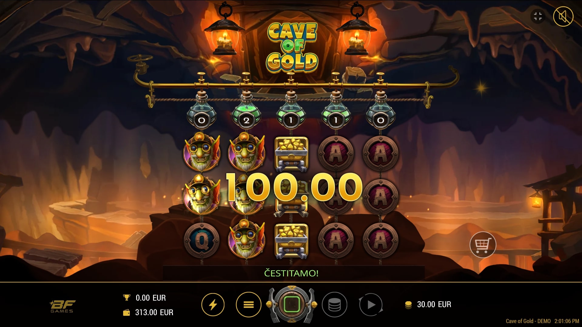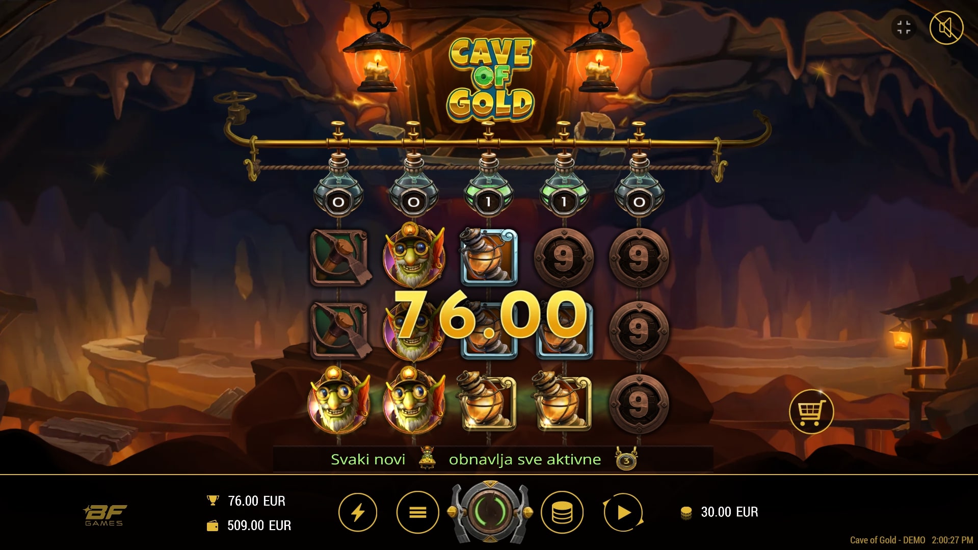 Cave of Gold tematska je slot igra koja vodi igrača u rudnik pun zlata kojim vladaju fantastični dobici. Najviše isplaćuju simboli vagona i cijevi u kojima se nalaze zlatni grumeni, dok kovčeg pojavom na tri ili više koluta vodi igrača u svijet besplatnih vrtnji. Moguće je okrenuti i simbol goblina koji mijenja druge simbole u potrazi za nestvarnim dobicima. Zaigraj Cave of Gold te pretvori snove o vrhunskim dobicima u stvarnost!