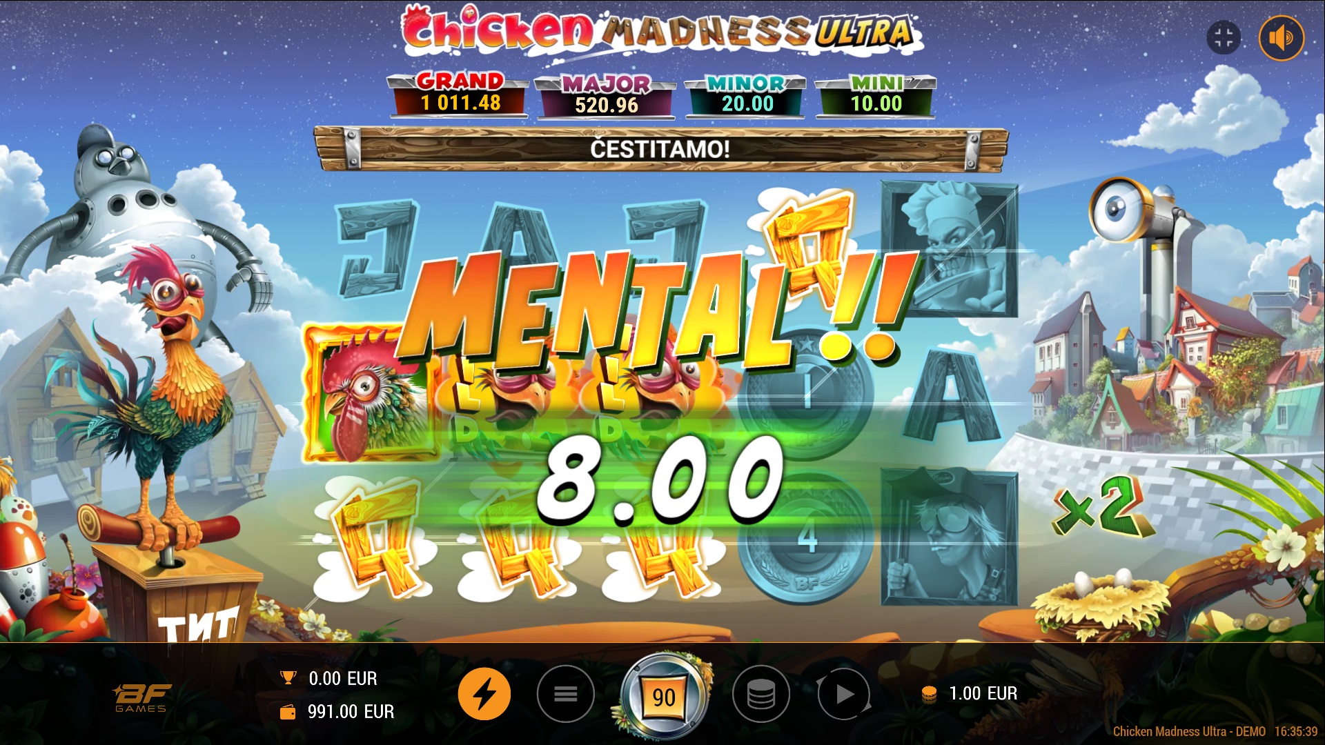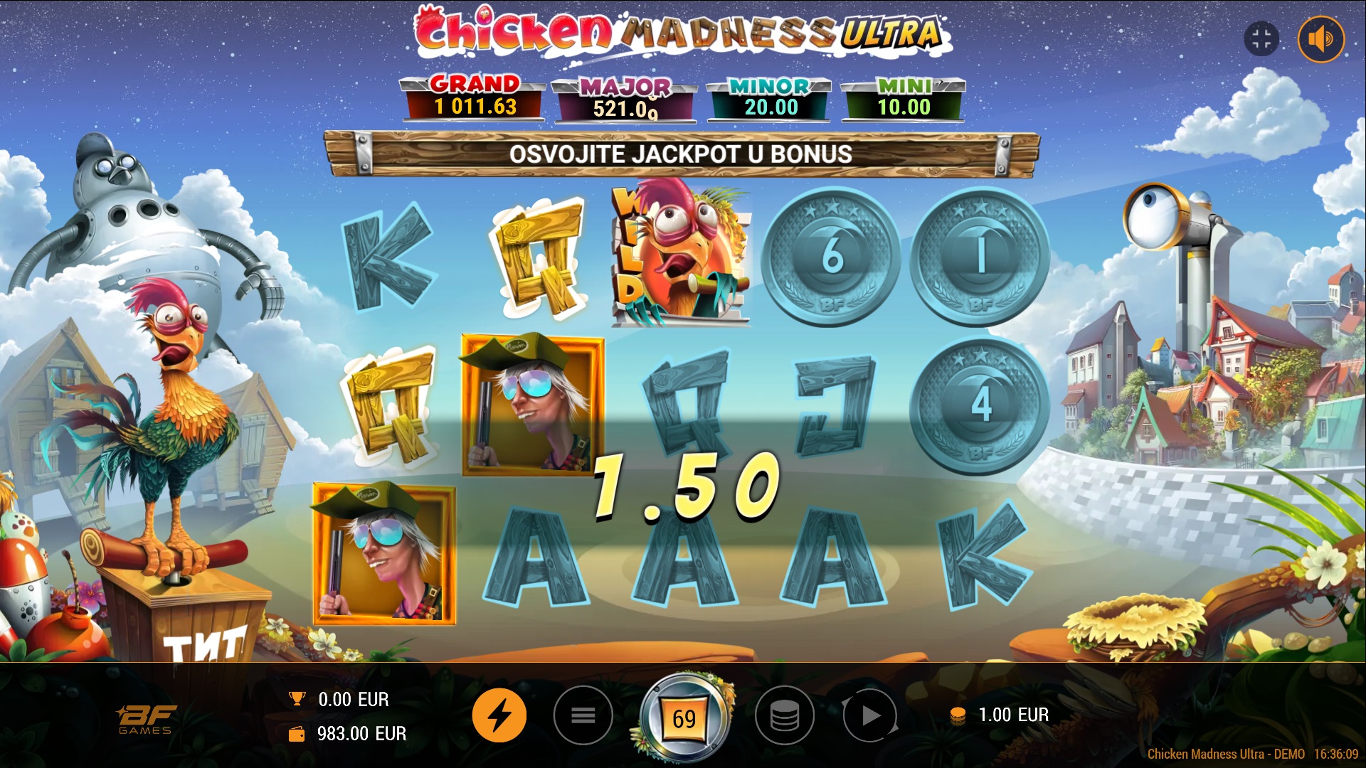 Gameplay u Chicken Madness Ultra je dinamičan i jednostavan. Ova slot igra s 5 bubnjeva i 10 isplatnih linija pruža ti priliku za velike dobitke uz Cash Mesh značajku. Kada složiš 5 ili više simbola Coin, aktivira se Cash Mesh, koji donosi bonus vrtnje ovisno o broju Coin simbola. Tijekom ovih vrtnji, pozicije s COIN simbolima ostaju zadržane, dok se ostale pozicije vrte pojedinačno. Ako uspiješ popuniti sve pozicije simbolima Coin, osvajaš dodatni multiplikator Full House x2. Osim toga, tu su i različiti Jackpoti i Bonusi koji te mogu nagraditi s još većim iznosima!