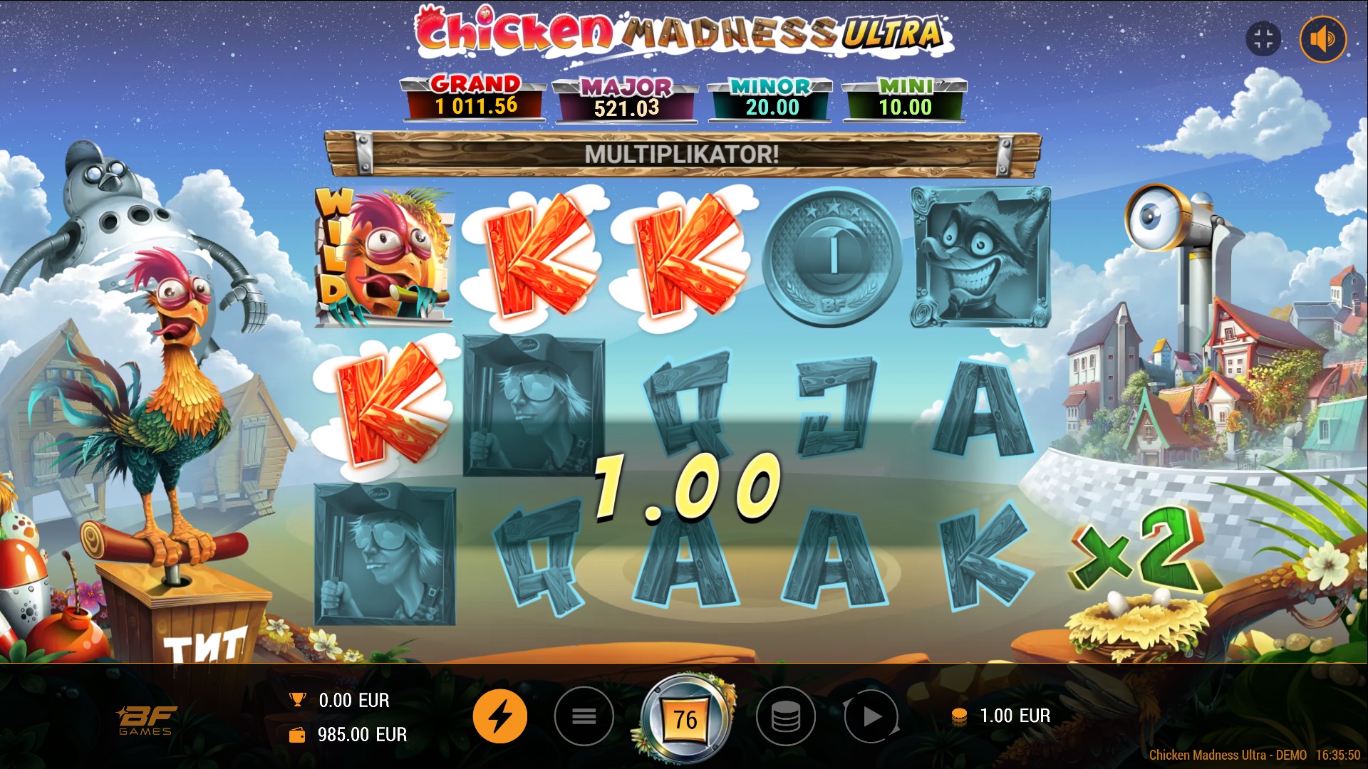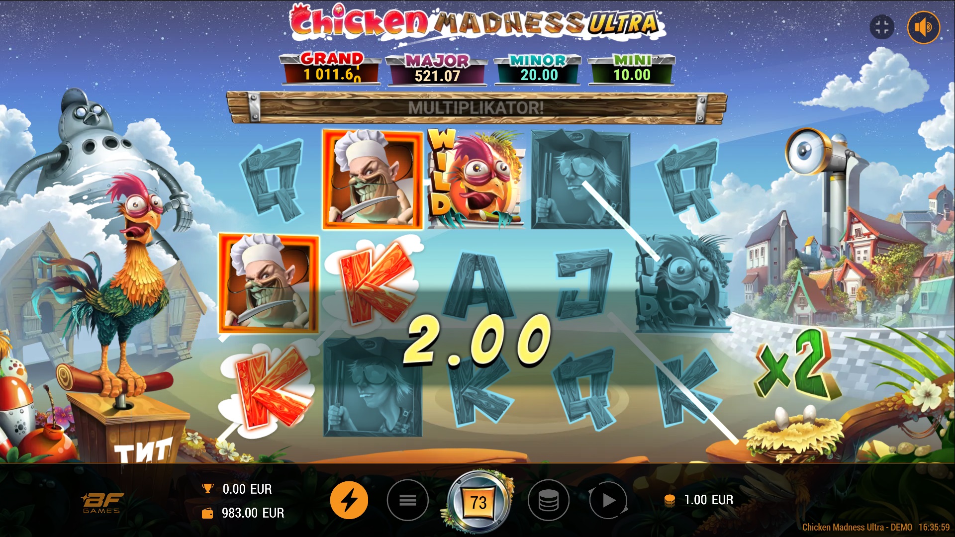 U igri Chicken Madness Ultra, očekuje te nevjerojatna zabava uz 5 bubnjeva, 3 reda i 10 isplatnih linija. Tvoj cilj je složiti što više identičnih simbola duž isplatne linije, počevši od prvog bubnja na lijevoj strani do zadnjeg na desnoj. Dobici na različitim isplatnim linijama se pribrajaju, dok se isplaćuje samo najveća dobitna kombinacija za svaki simbol. Uz uzbudljive značajke poput Cash Mesh i različitih Jackpota, Chicken Madness Ultra nudi brojne mogućnosti za dobitak. Pripremi se za akciju i osvoji velike nagrade uz mnoštvo bonus vrtnji i multiplikatora!