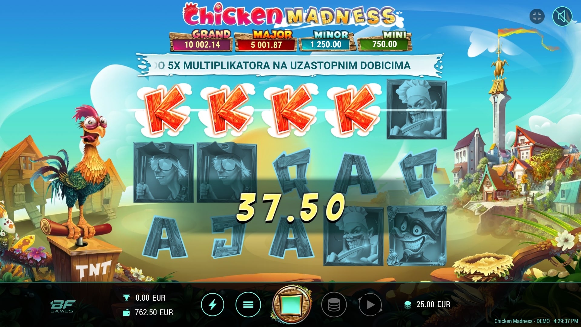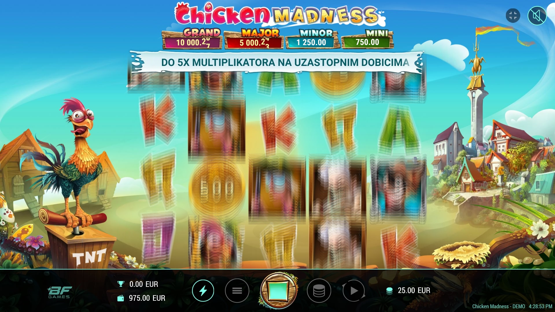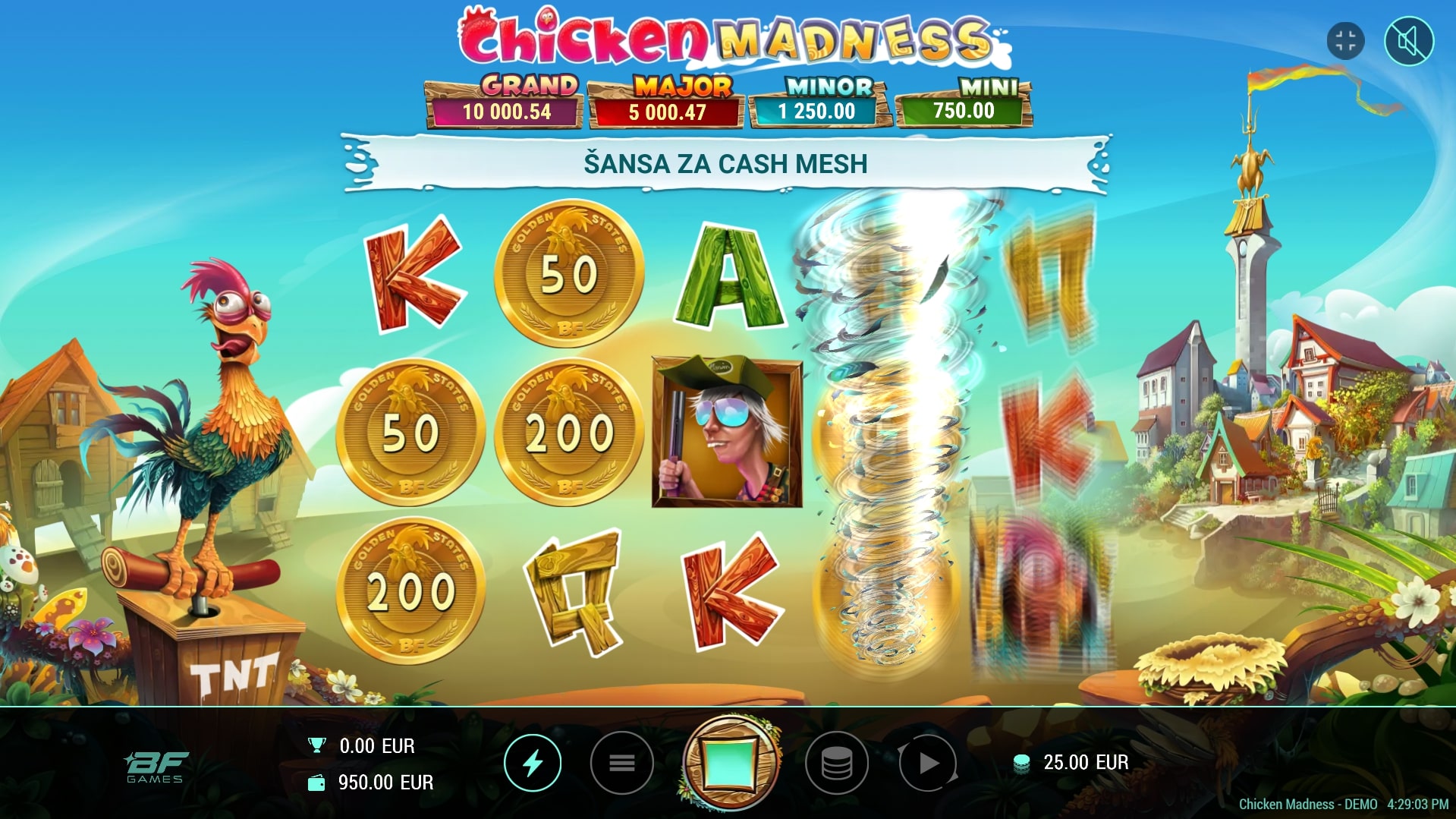 Chicken Madness slot je igra koja šalje igrača u seosku avanturu u potrazi za vrhunskim dobicima. Najviše isplaćuju simboli lovca, kuhara, lisice i kokoši, dok igra uz to sadrži poseban Wild simbol koji mijenja druge simbole. Također, simbol novčića aktivirat će besplatne vrtnje koje igrača vode u svijet iznimnih nagrada. Zaigraj Chicken Madness te ostvari fantastične dobitke!