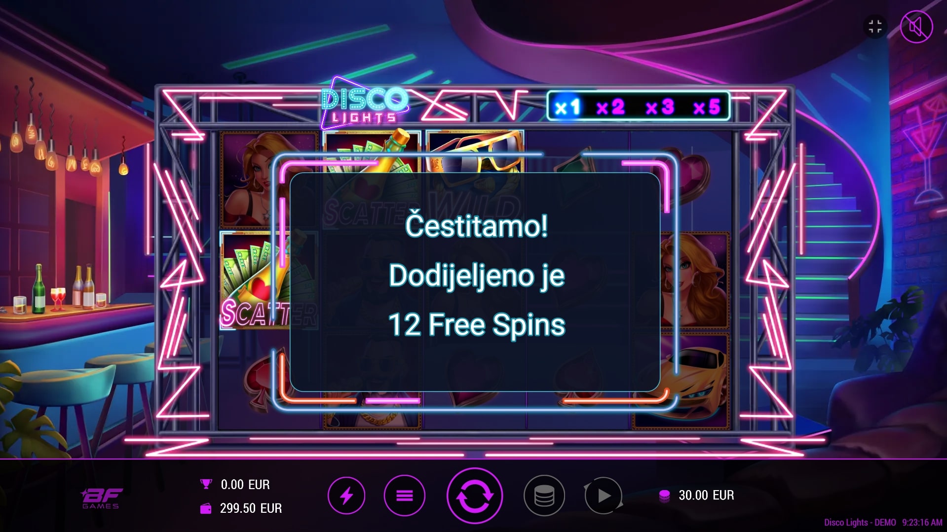 Disco Lights tematska je slot igra koja vodi igrača u svijet fluorescentnih svjetla i blještećih dobitaka što sjaje kilometrima. Najviše isplaćuju simboli brzih automobila, lijepih žena i bogatih muškaraca, dok igra uz to sadrži posebne simbole zlata vrijednih sunčanih naočala te šampanjca. Oni mijenjaju druge simbole, ali uz to mogu aktivirati besplatne vrtnje i osigurati vrhunske nagrade. Zaigraj Disco Lights te ostvari vruće dobitke!
