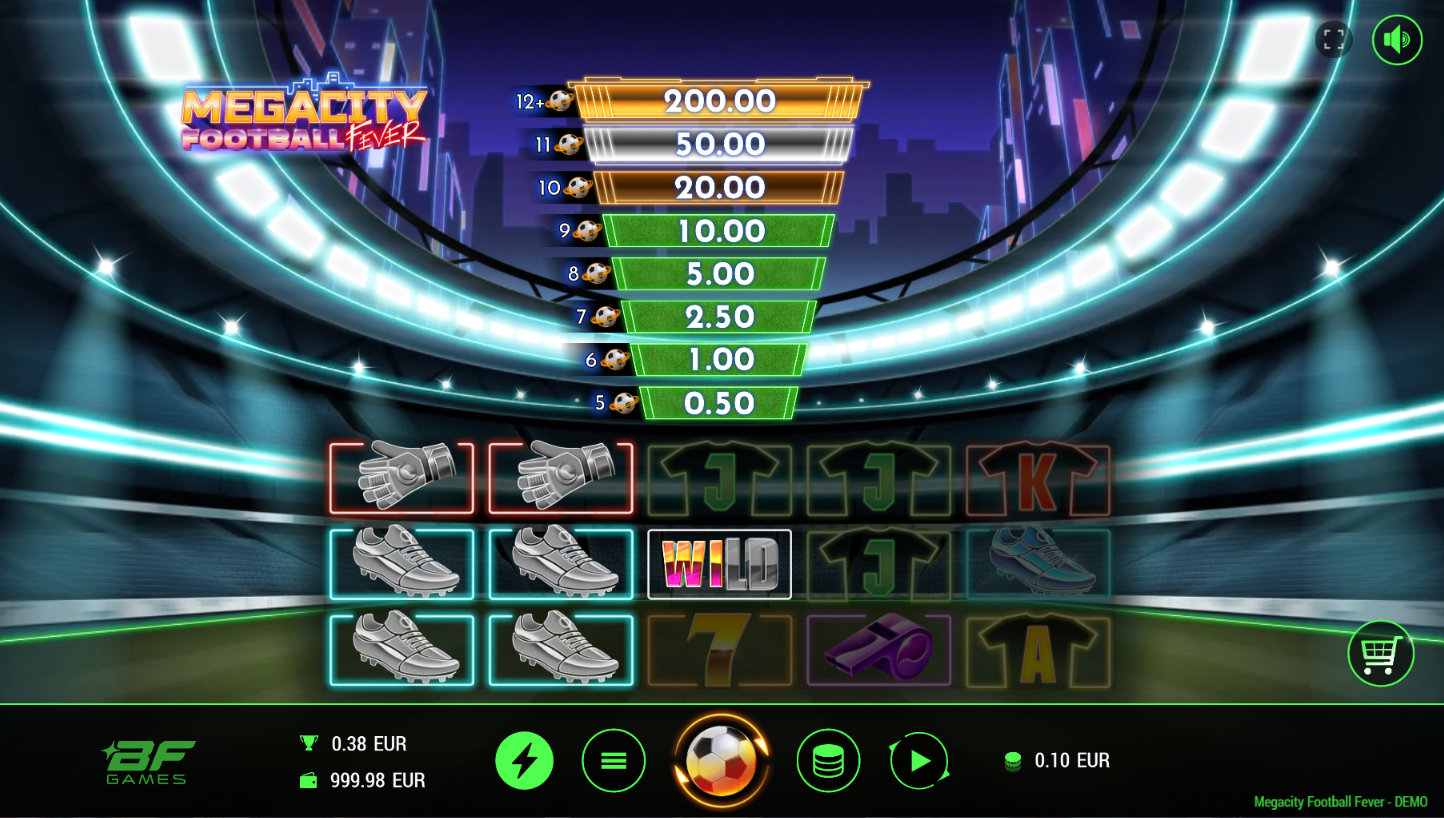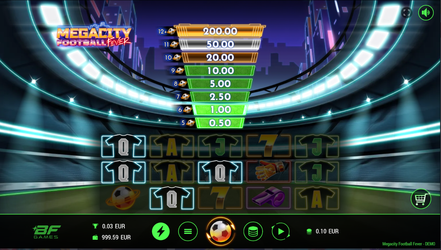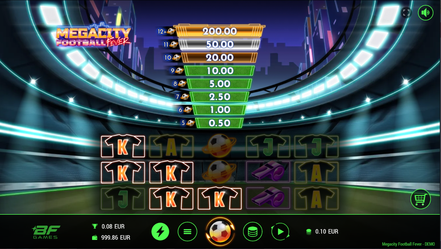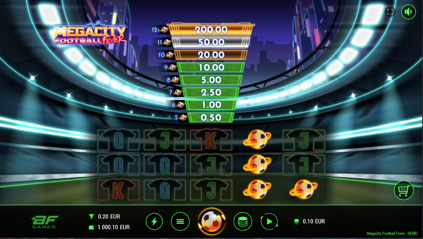Megacity Football Fever, od providera BF Games,spaja ritam futurističkog grada i strast nogometnog terena. Na 5×3 bubnjeva i 50 linija, svaki spin donosi adrenalin utakmice i energiju cyber svijeta. Sjajni simboli, neonske boje i nogometni elementi stvaraju nezaboravnu atmosferu. Ako voliš sportske slotove i moderni vibe, ovo je prava zabava za tebe!