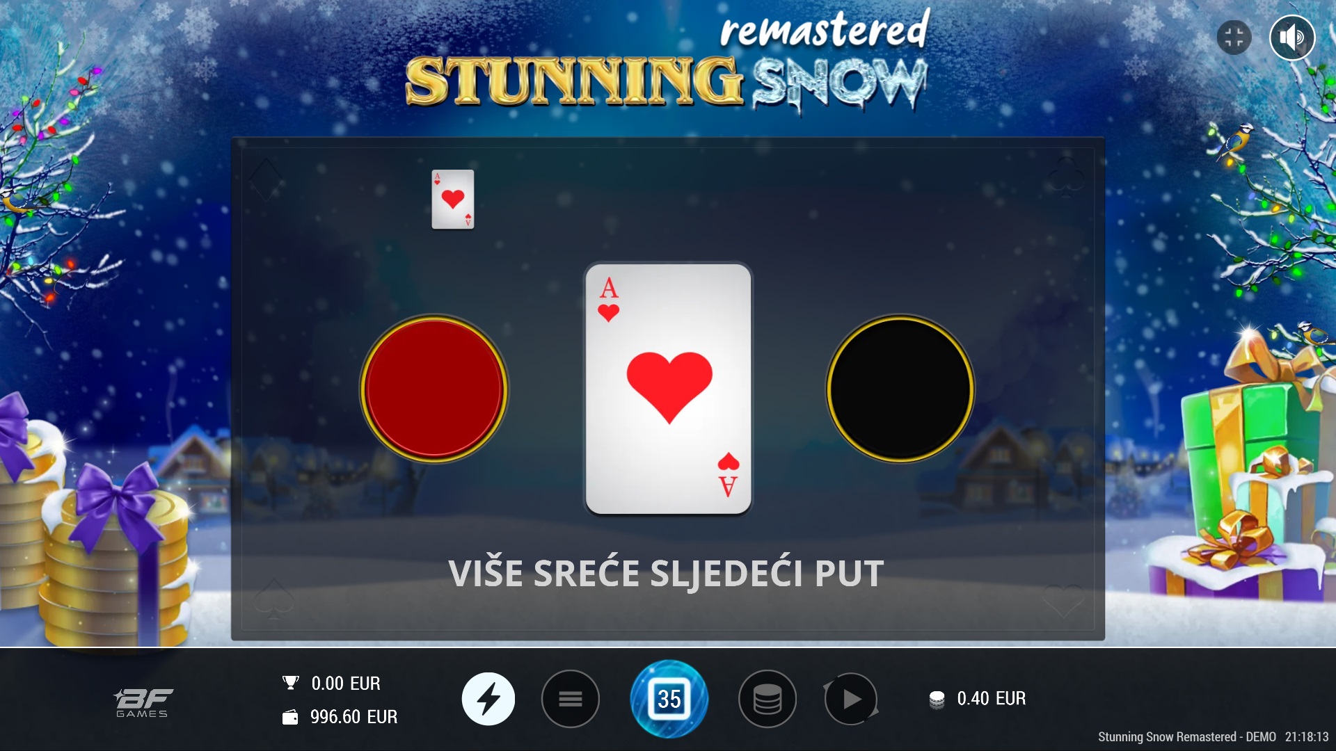 Igra Stunning Snow Remastered nudi klasičnu slot mehaniku s modernim zimskim ugođajem. Igra se na 5 bubnjeva s 3 reda i 20 fiksnih dobitnih linija. Cilj je složiti identične simbole od prvog bubnja s lijeve strane prema desnoj. Uz standardne simbole, Scatter simboli mogu donijeti dodatne dobitke, a pojavljuju se na bilo kojem od bubnjeva. Posebnost igre je opcija pogađanja boje karte, gdje možeš pokušati udvostručiti svaki dobitak, birajući između crvene ili crne boje. Oprez – maksimalno 4 puta možeš iskušati sreću! Uz jednostavna pravila i atraktivne dobitke, igra pruža pravo zimsko uživanje!