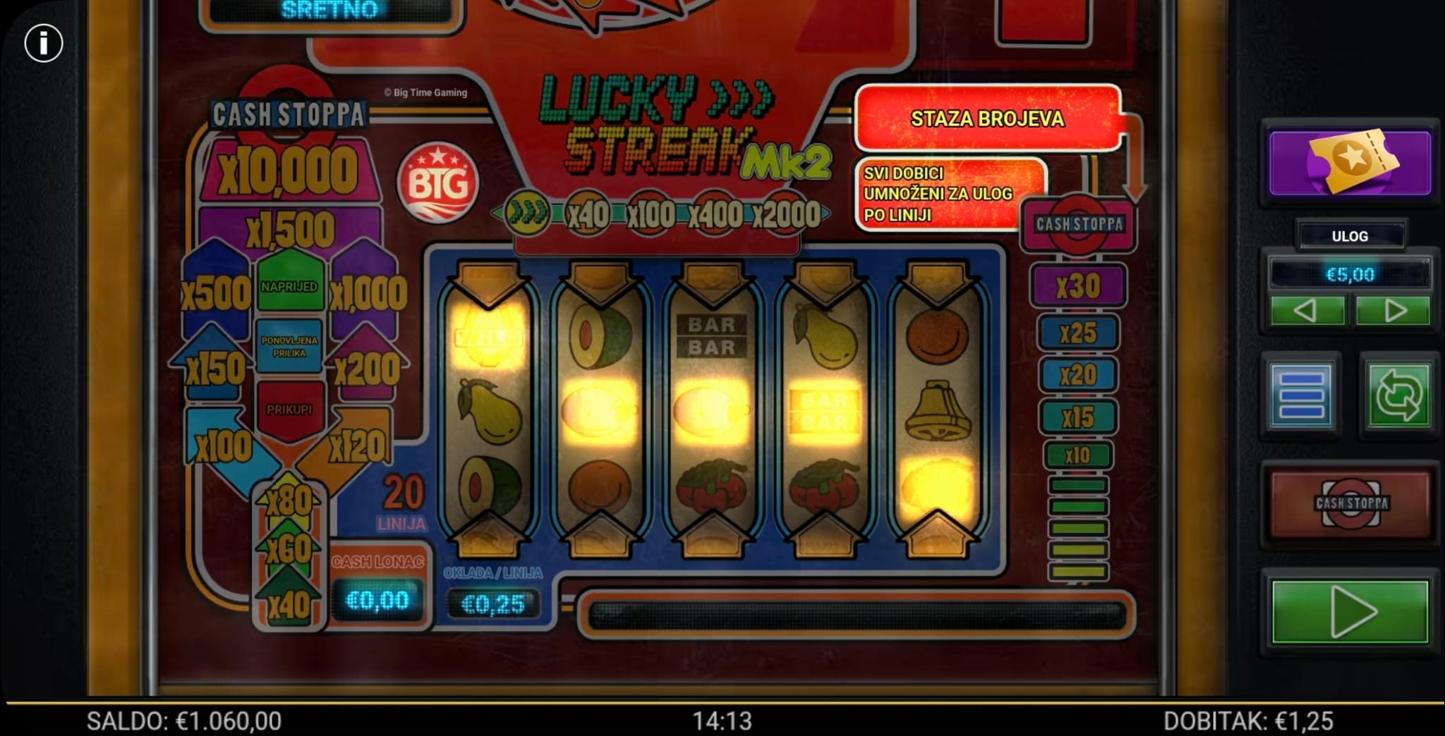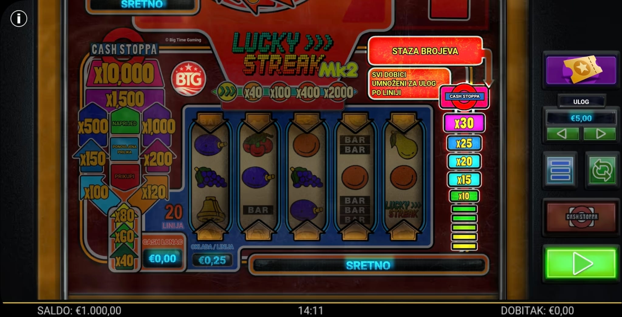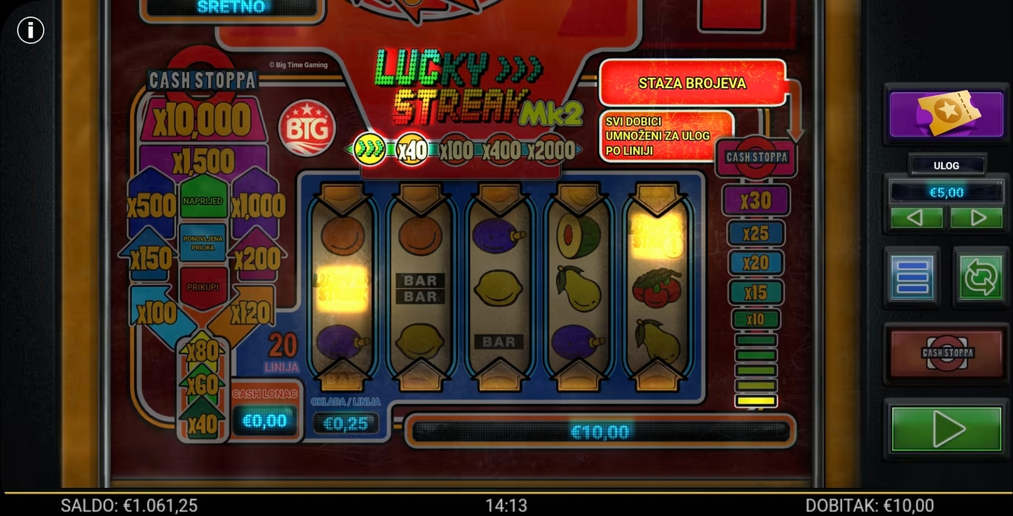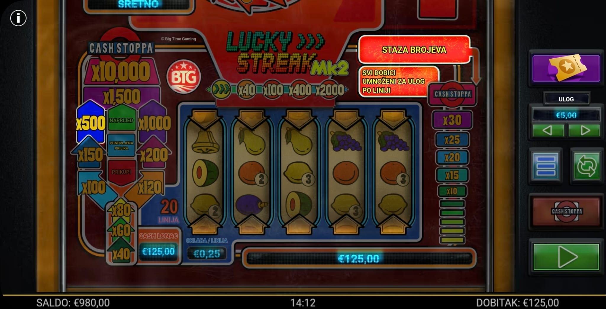 Igra Lucky Streak MK2 ima RTP od 96.32%, kao što je navedeno u pravilima igre. Zbog prisutnosti množitelja (x2 i x3) koji se aktiviraju u osnovnoj i bonus igri, volatilnost ove igre je srednja do visoka.