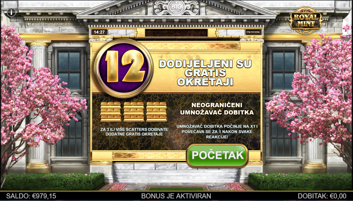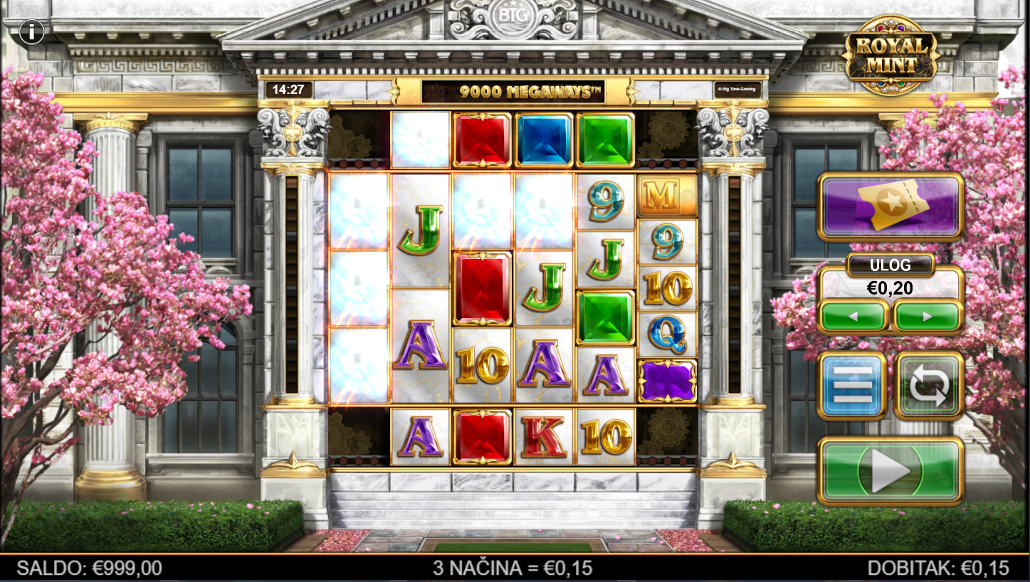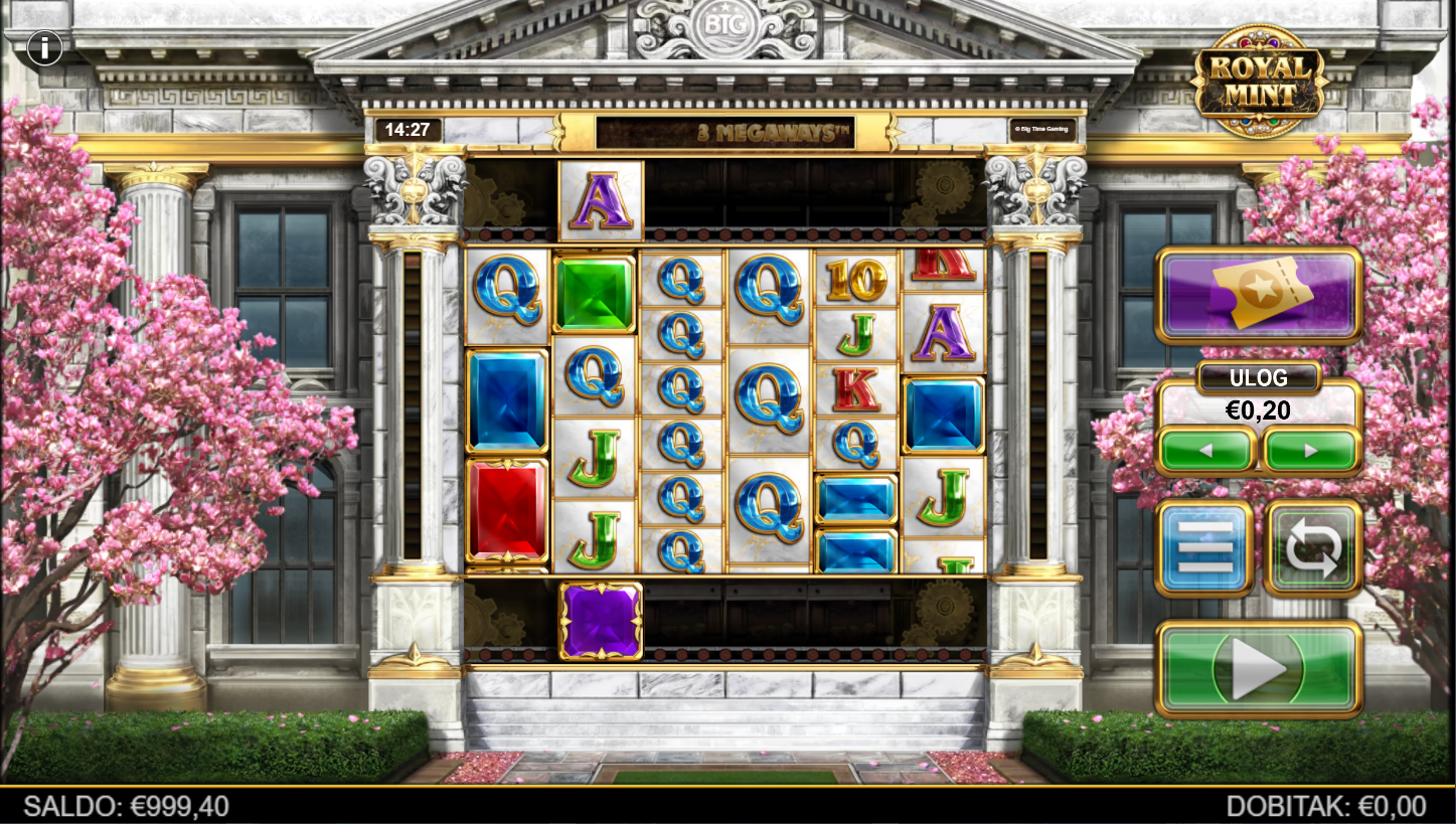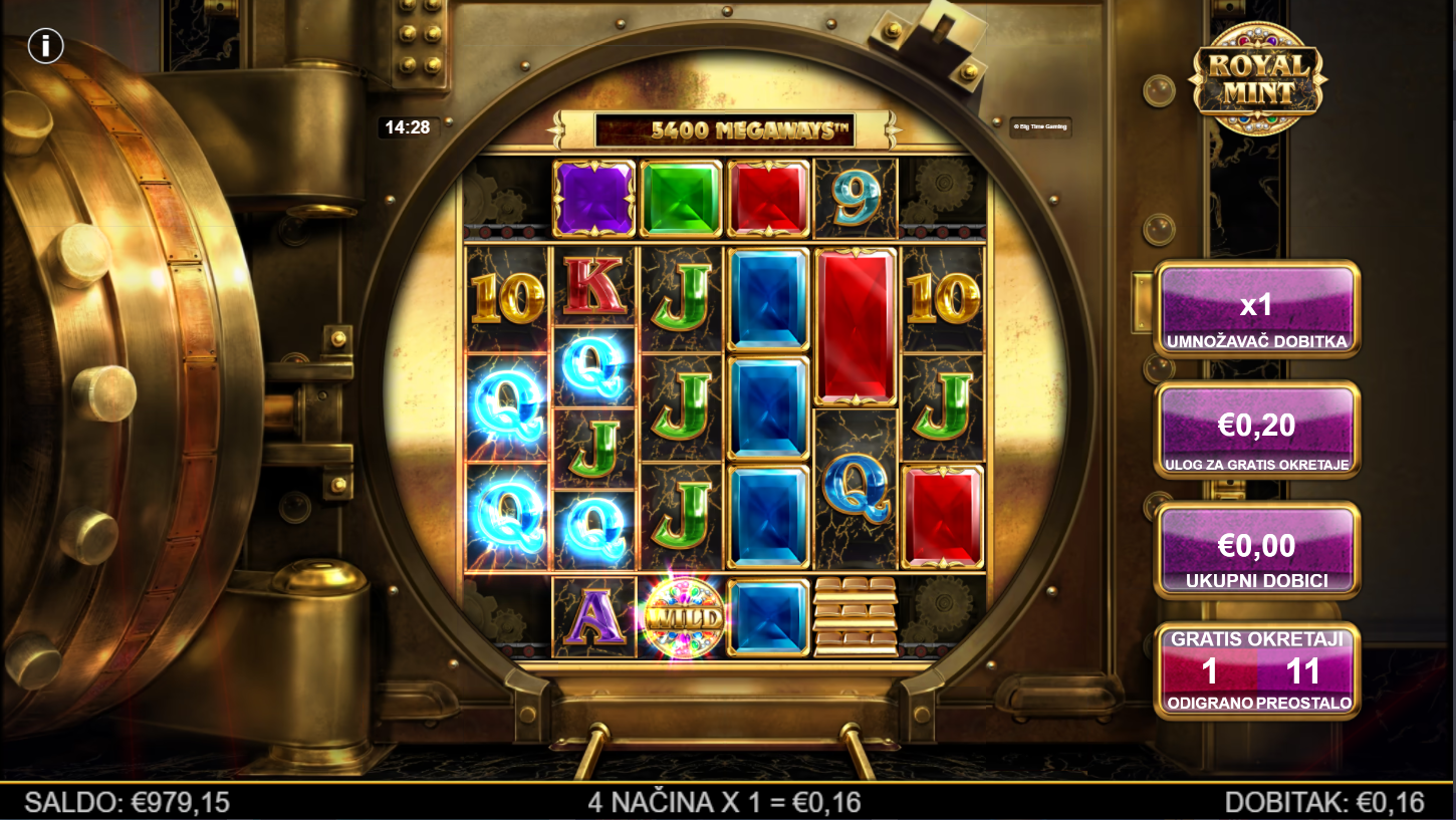 Royal Mint ima RTP od 96.48%. Volatilnost je ekstremno visoka, pa igra nije za one koji vole sitne i česte dobitke jer ovdje se juri veliki ulov. S maksimalnim potencijalom do 41300 puta uloga, ovo je pravi dragulj među Megaways slotovima.