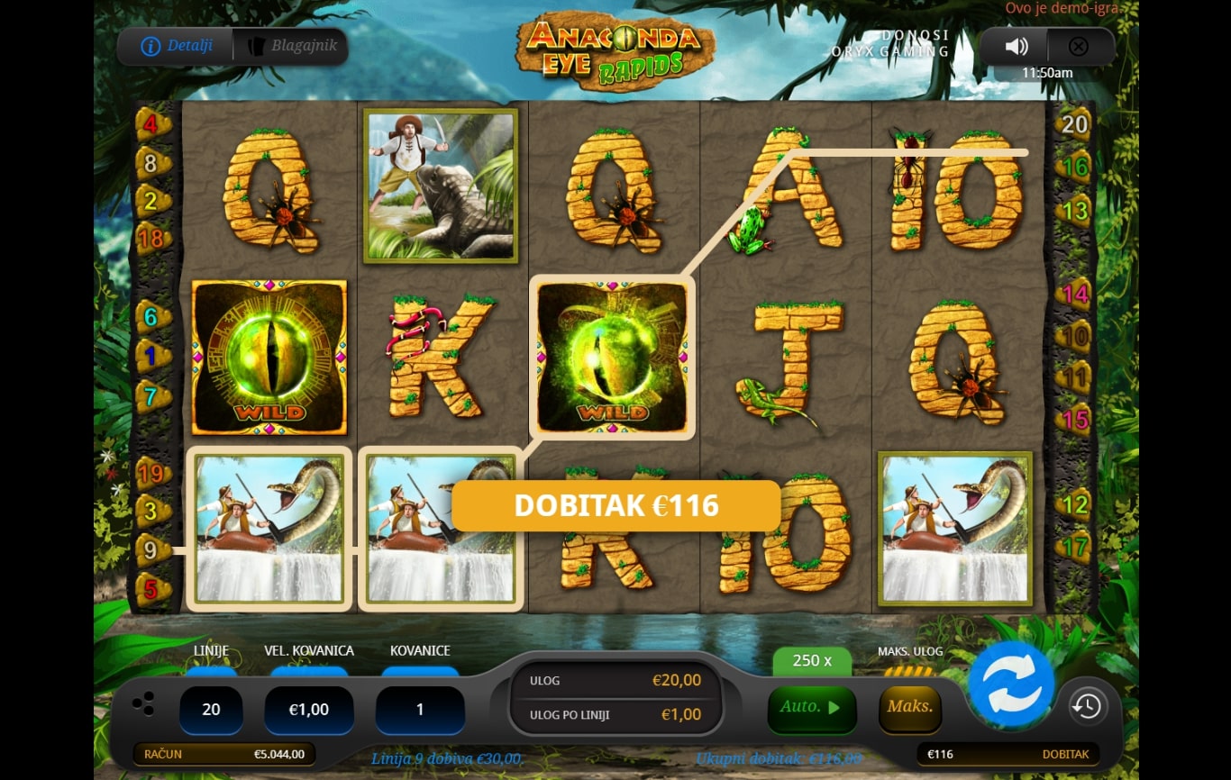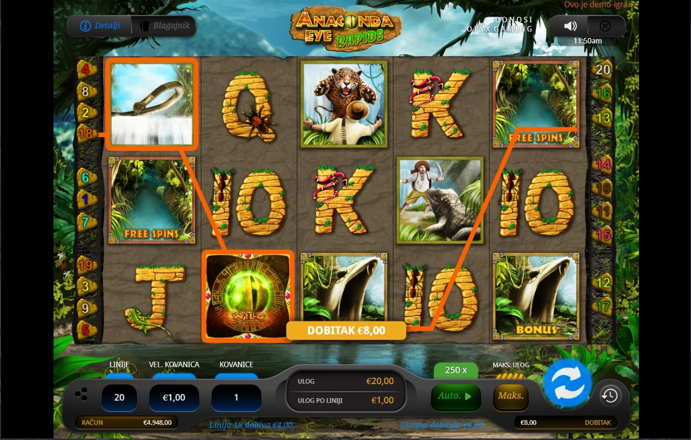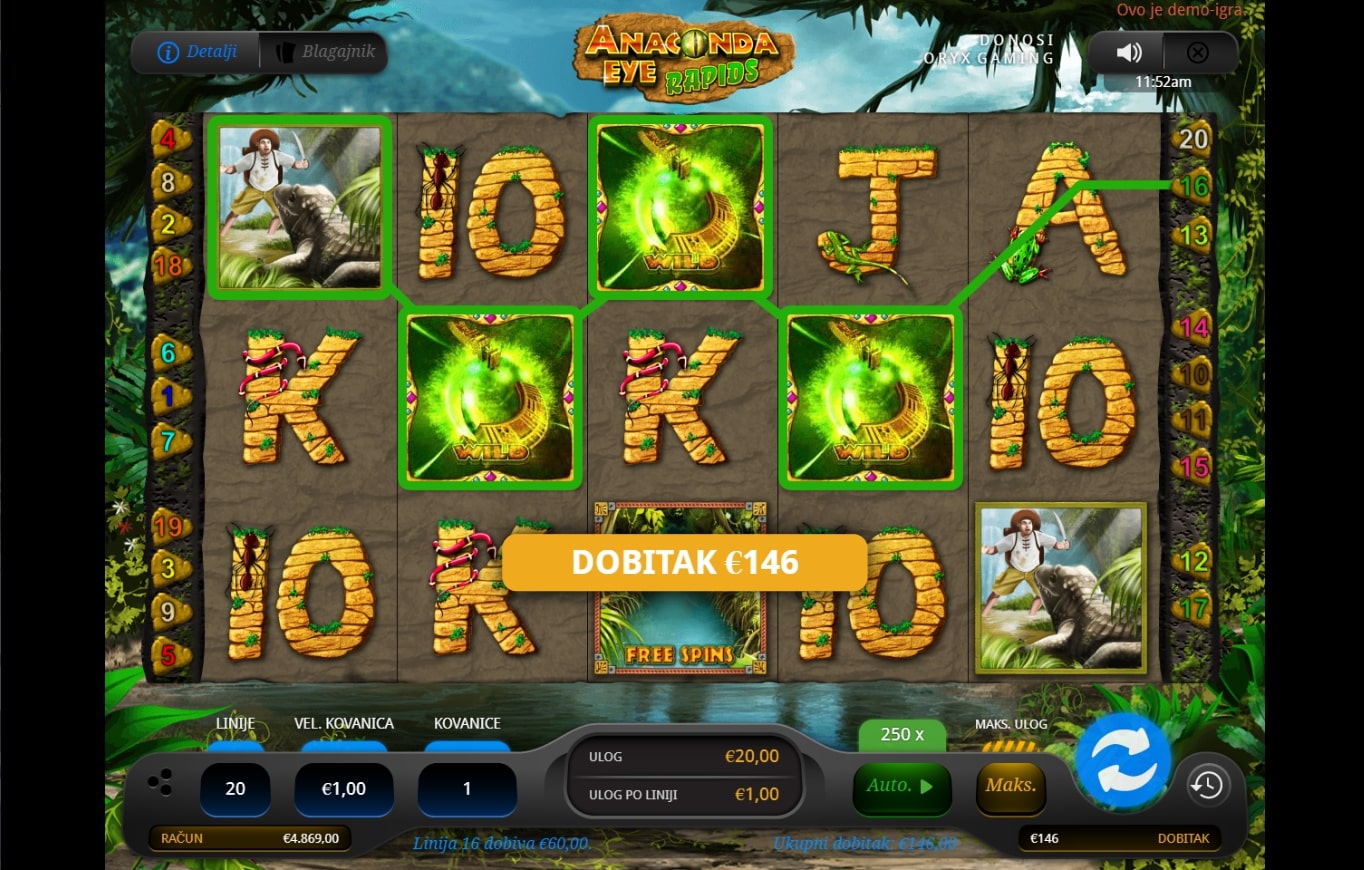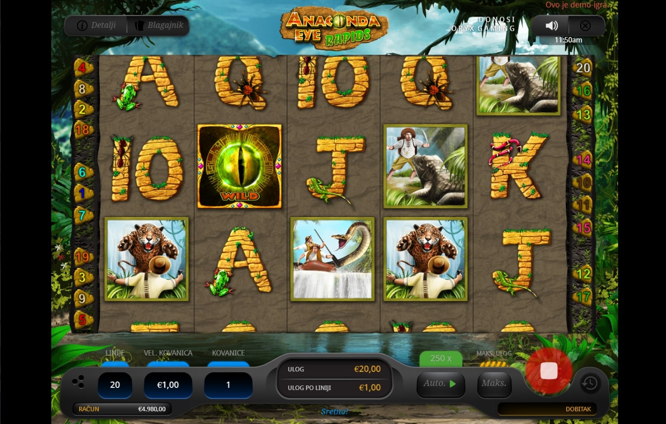 Anaconda Eye Rapids avanturistička je slot igra koja vodi igrača put amazonskih prašuma u lov na vrhunske dobitke. Najviše isplaćuju simboli zmija, jaguara i krokodila koji napadaju istraživača, dok simbol oka pomaže u stvaranju dobitaka mijenjajući druge simbole. Uz to, igrač može aktivirati besplatne igre javljanjem simbola anakonde, odnosno simbola rijeke. Zaigraj Anaconda Eye Rapids te osvoji epske nagrade!