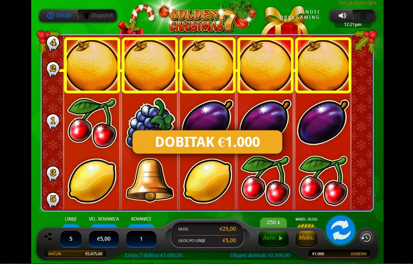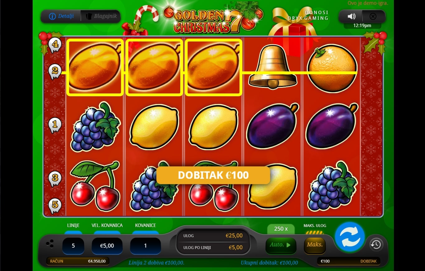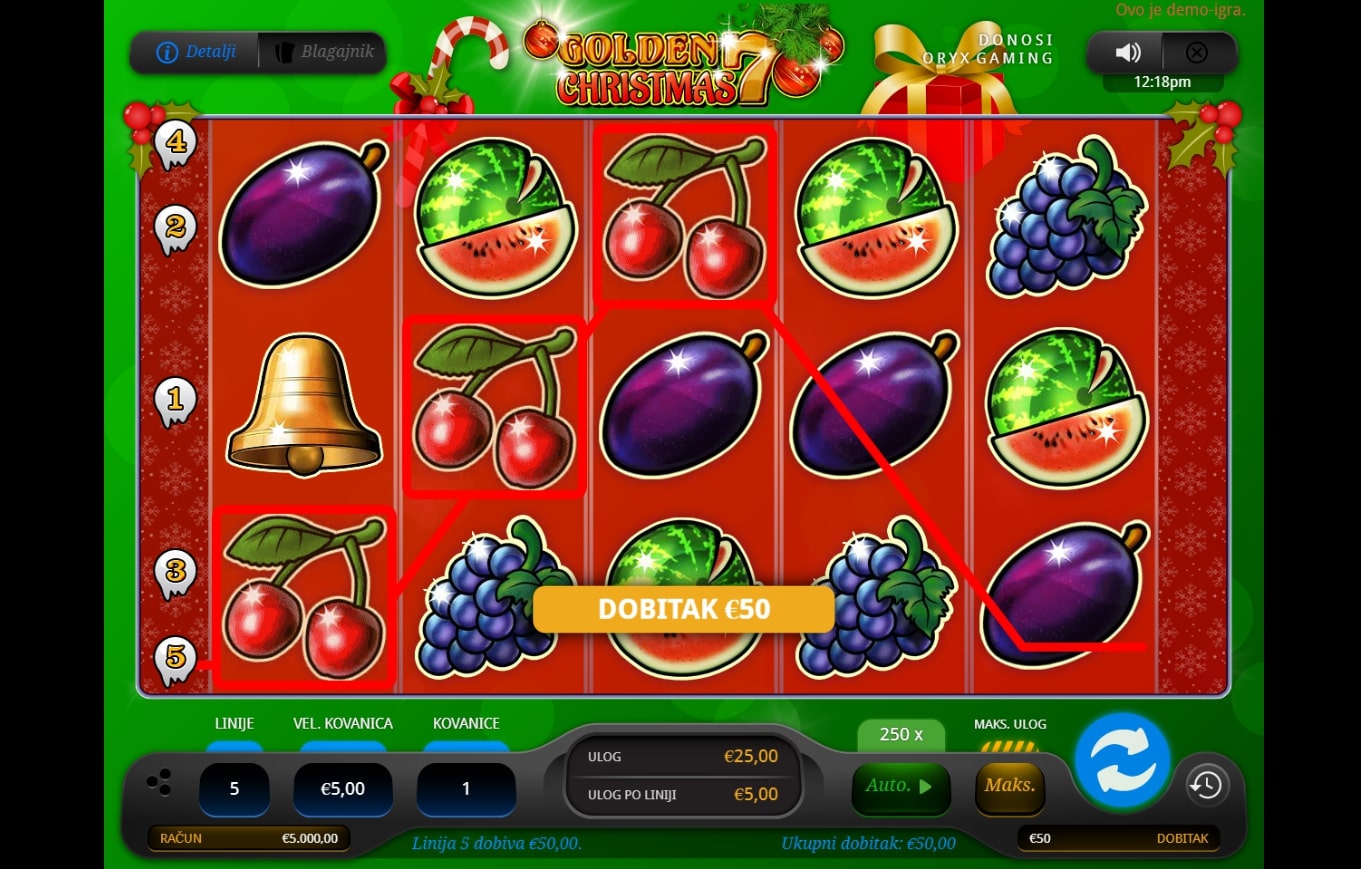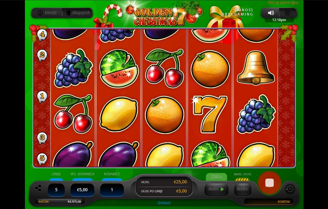 Golden 7 Christmas slot je igra retro karaktera koja miješa klasični svijet igara na sreću gdje dominiraju simboli voća s toplim božićnim ugođajem. Po običaju najviše isplaćuju sedmice, a zatim slijede lubenice i grožđe, pa šljive i naranče. Igra uz to sadrži simbol zvona koji može isplatiti bez obzira na svoju poziciju u mreži simbola. Zaigraj Golden 7 Christmas te osvoji osvježavajuće nagrade!
