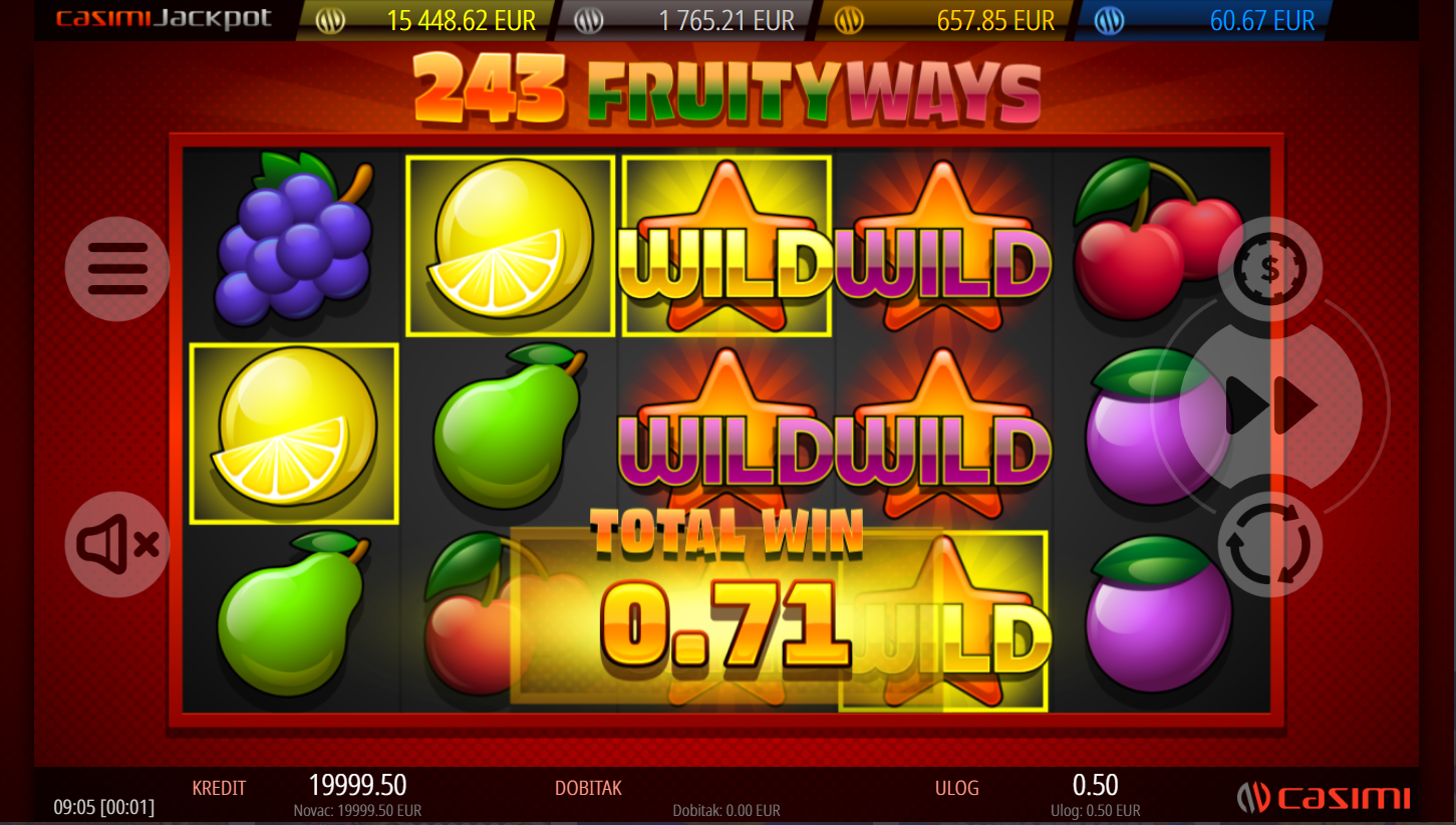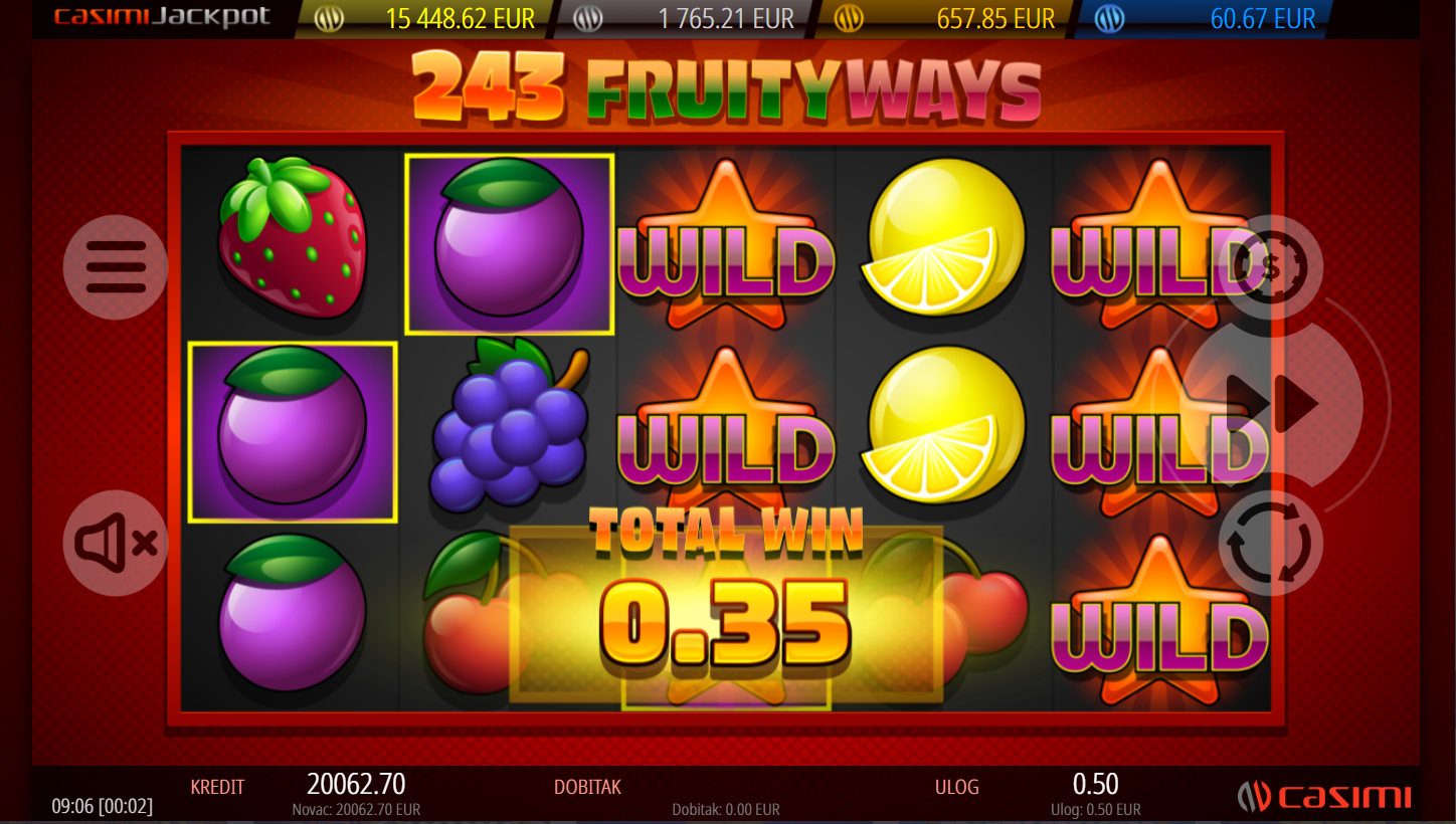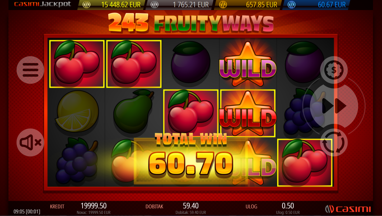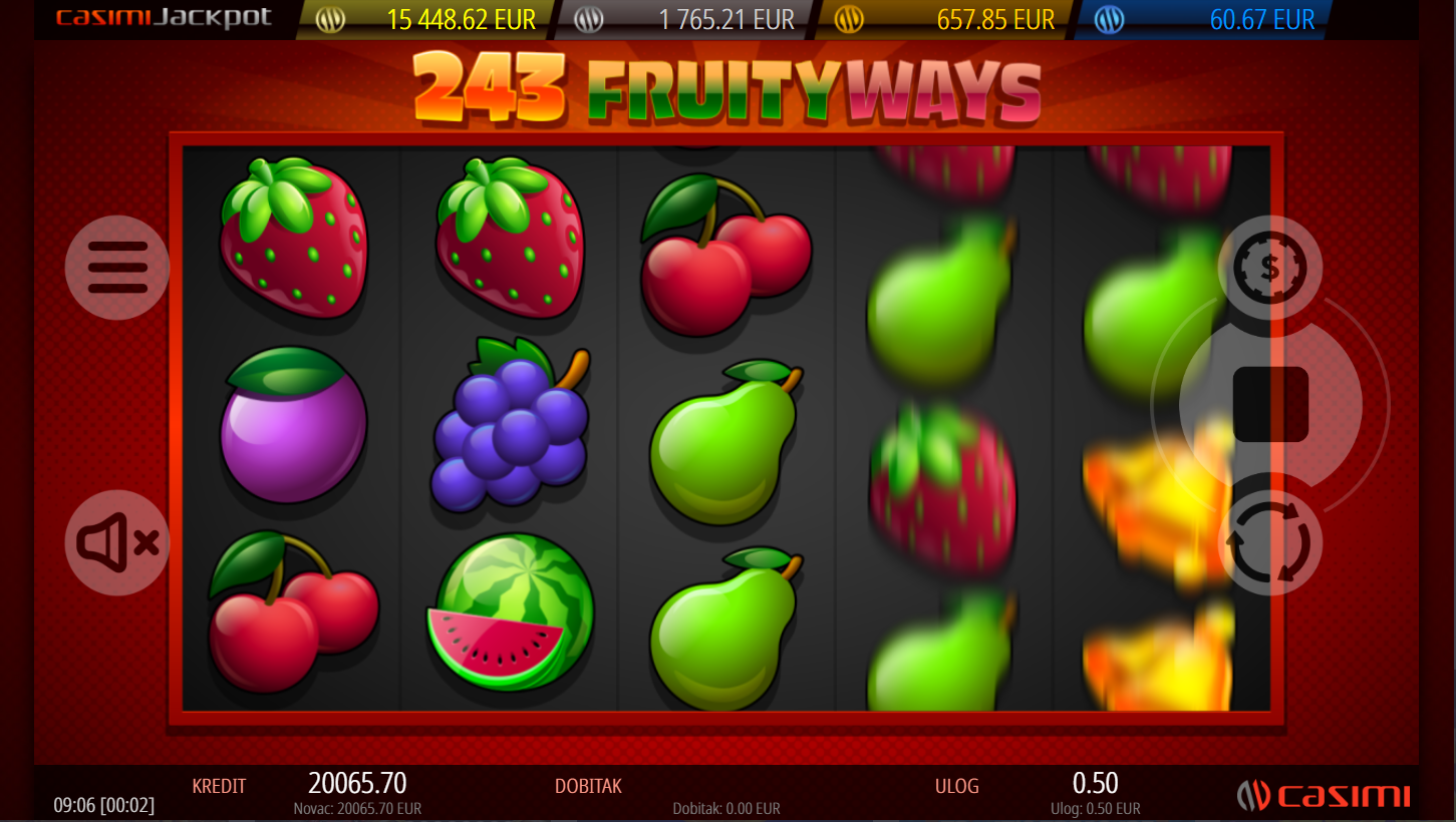 Vrti 5 koluta i pogađaj kombinacije voćnih simbola na 243 različita načina. Wild simboli pomažu ti složiti dobitne linije, dok brzi tempo igre drži napetost na vrhuncu. Pravila su jednostavna: što više voća, to veći dobitak. Idealna igra za sve koji vole lagan ulaz u akciju, ali i mogućnost neočekivanih pogodaka.