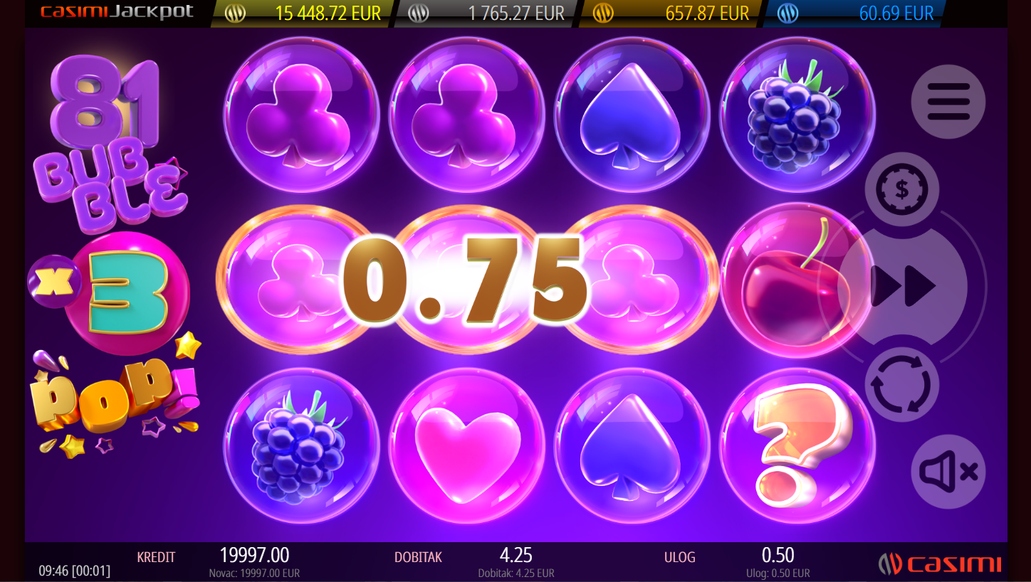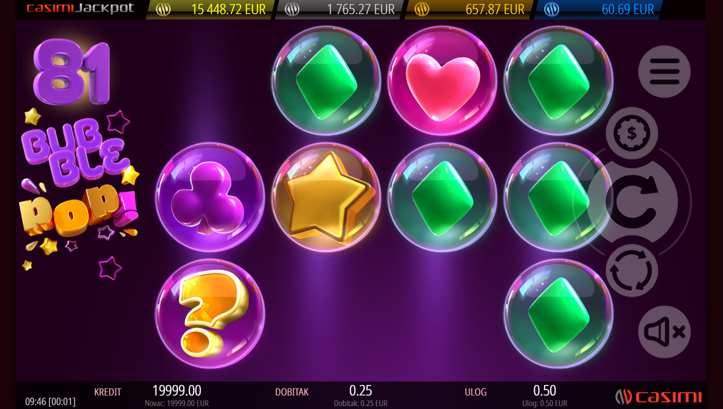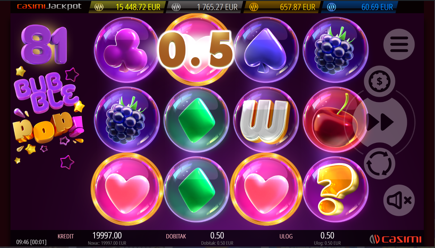 81 Bubble Pop i Casimi donose veselu voćnu atmosferu s razigranim simbolima i brzim tempom igre. Na jednostavnom 3x3 rasporedu krije se čista slot akcija, ali uz moderni bubbly šarm. Svaka vrtnja donosi šarene kombinacije i iznenadnu zabavu. Igra je savršena za one koji vole klasiku s vedrim twistom.