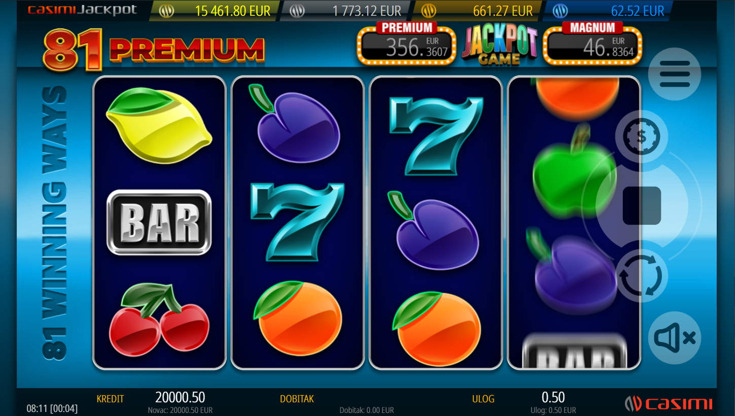 81 Premium, od Casimija, donosi luksuzni doživljaj klasičnog voćnog slota: 4 koluta, 3 reda i čak 81 način za dobitak. Klasični simboli poput trešanja i sedmica dobivaju premium tretman uz sjajne moderne značajke. Wild množitelji, Sticky simboli i Free Spins čine igru nepredvidivom i uzbudljivom. Svaki spin je prilika za sočan pogodak i elegantnu pobjedu.
