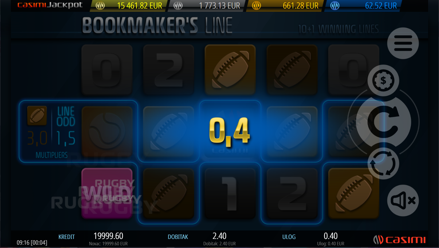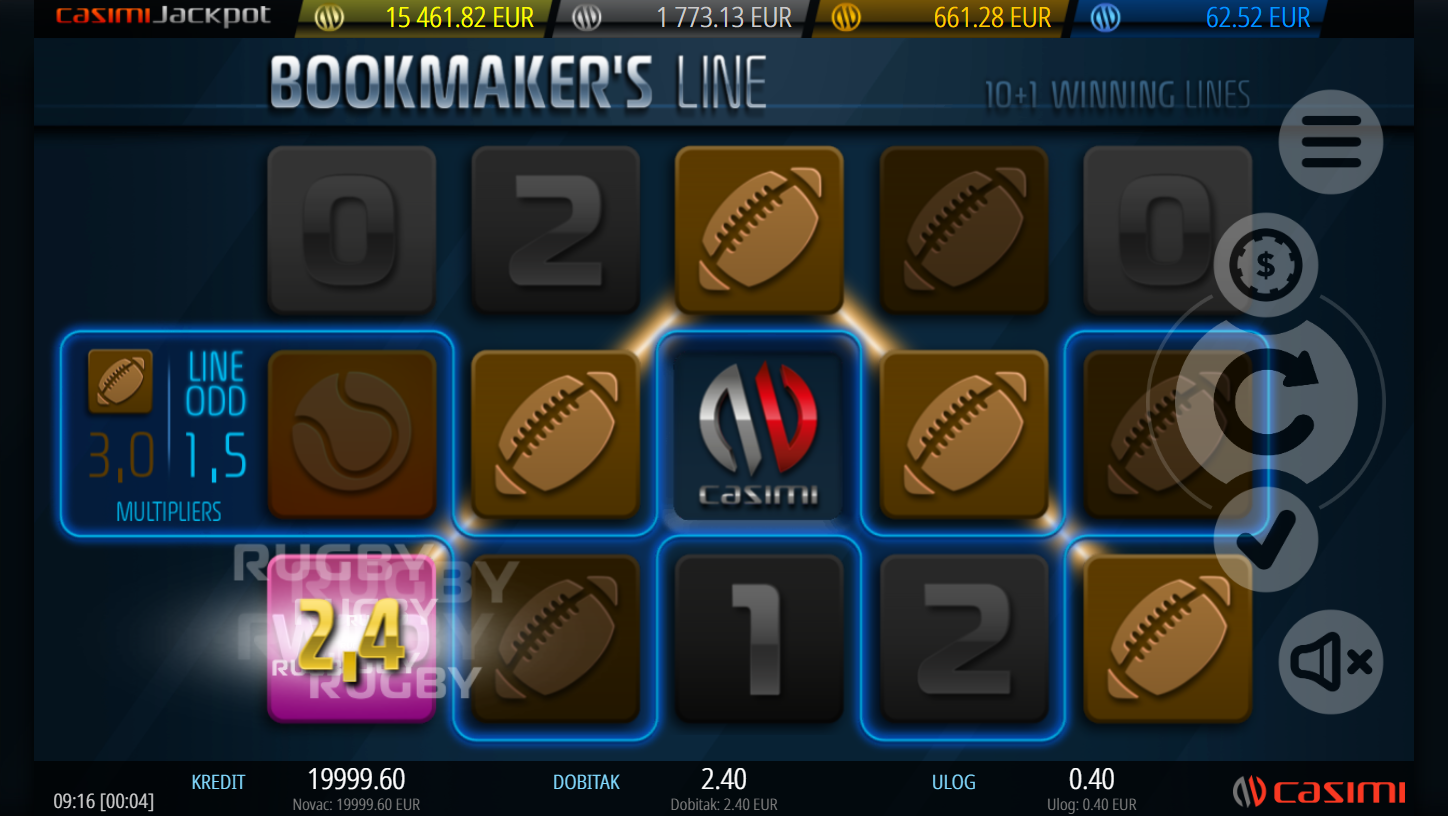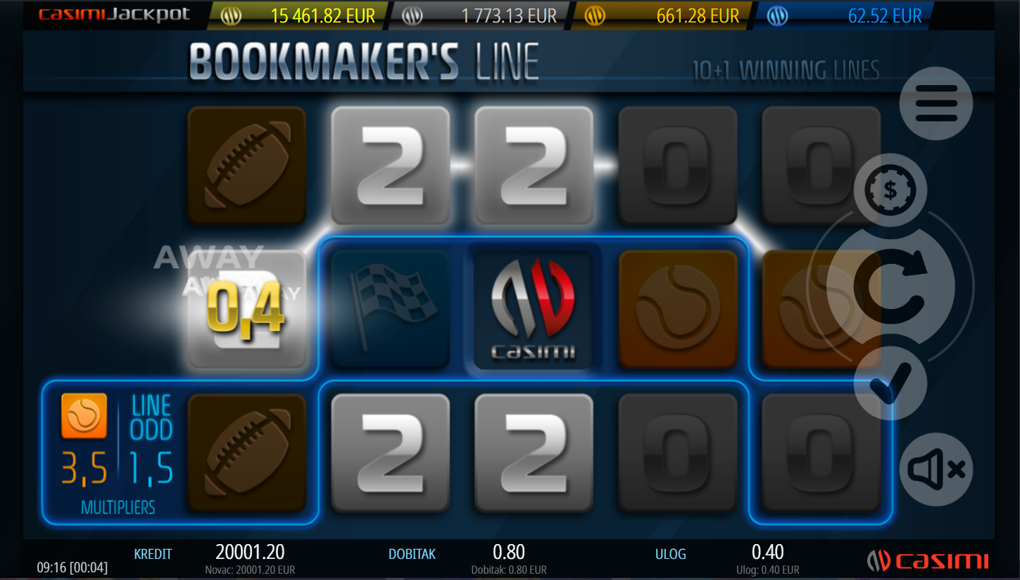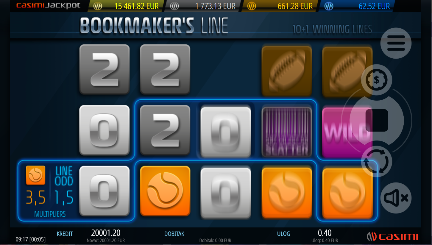 Bookmaker’s Line i Casimi tevode u svijet sportskog uzbuđenja na 5 koluta i 10 fiksnih linija, uz posebnu dodatnu bookmaker’s liniju koja otvara još više prilika za dobitak. Tema igre podsjeća na kladionički svijet, s mnoštvom adrenalina i osjećajem prave sportske akcije. Scatter simboli otvaraju Free Spins rundu, dok posebna linija donosi nepredvidive preokrete. Svaka vrtnja izgleda kao nova utakmica, a ti si igrač koji može pogoditi pravi rezultat!