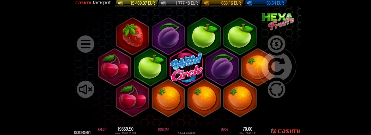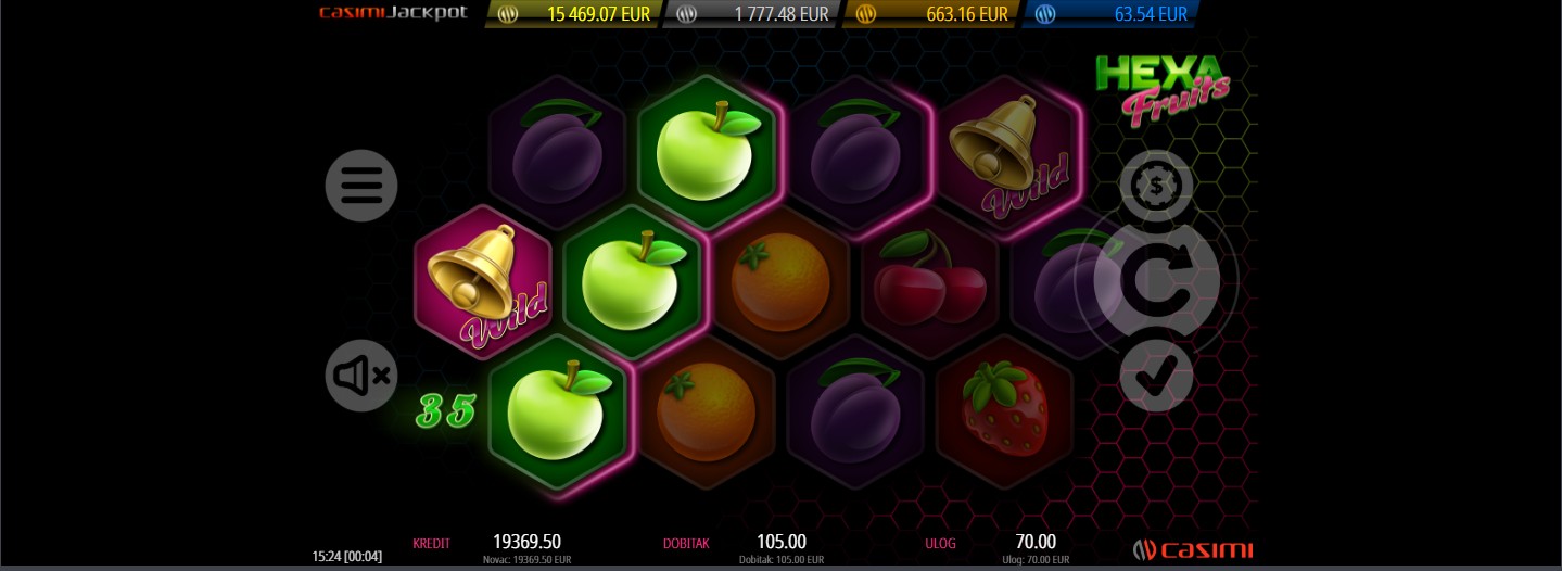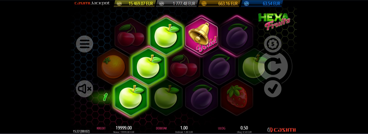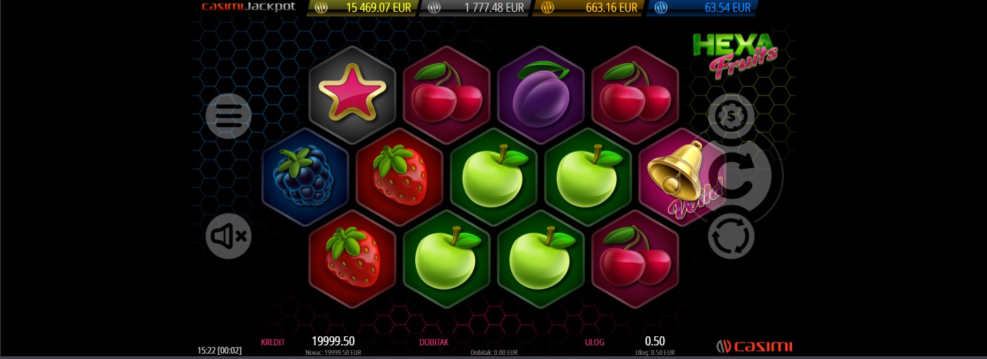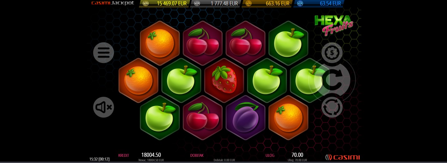 Zakorači u svijet voćne zabave s Hexa Fruits, šarenom slot igrom providera Casimi koja spaja klasične voćne simbole s modernim značajkama. Igra se na mreži od 5 valjaka i 3 reda s 15 isplatnih linija s mnoštvom bogatih, uzbudljivih značajki koje doprinose uzbuđenju i vrhunskoj zabavi. Osim širećih Wild simbola koji donose bogate dobitke, tu je i značajka respin za dodatne nagrade i veselje. S maksimalnim dobitkom do 540x uloga, Hexa Fruits pruža uzbudljivo iskustvo s mogućnostima za značajne dobitke.