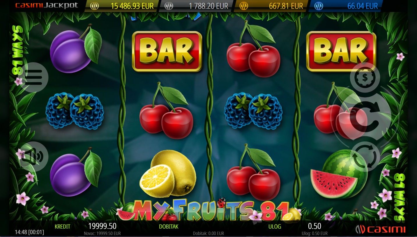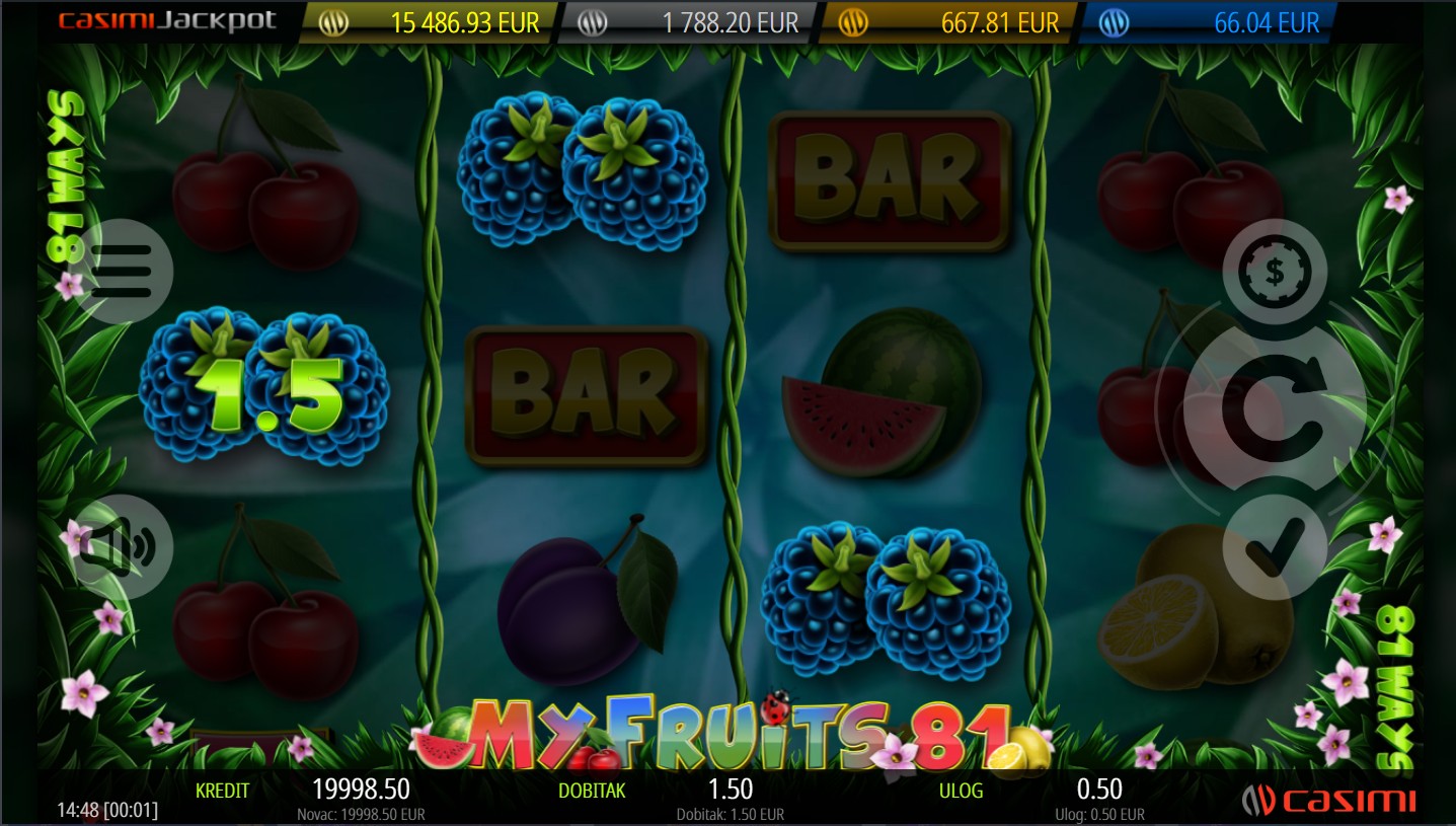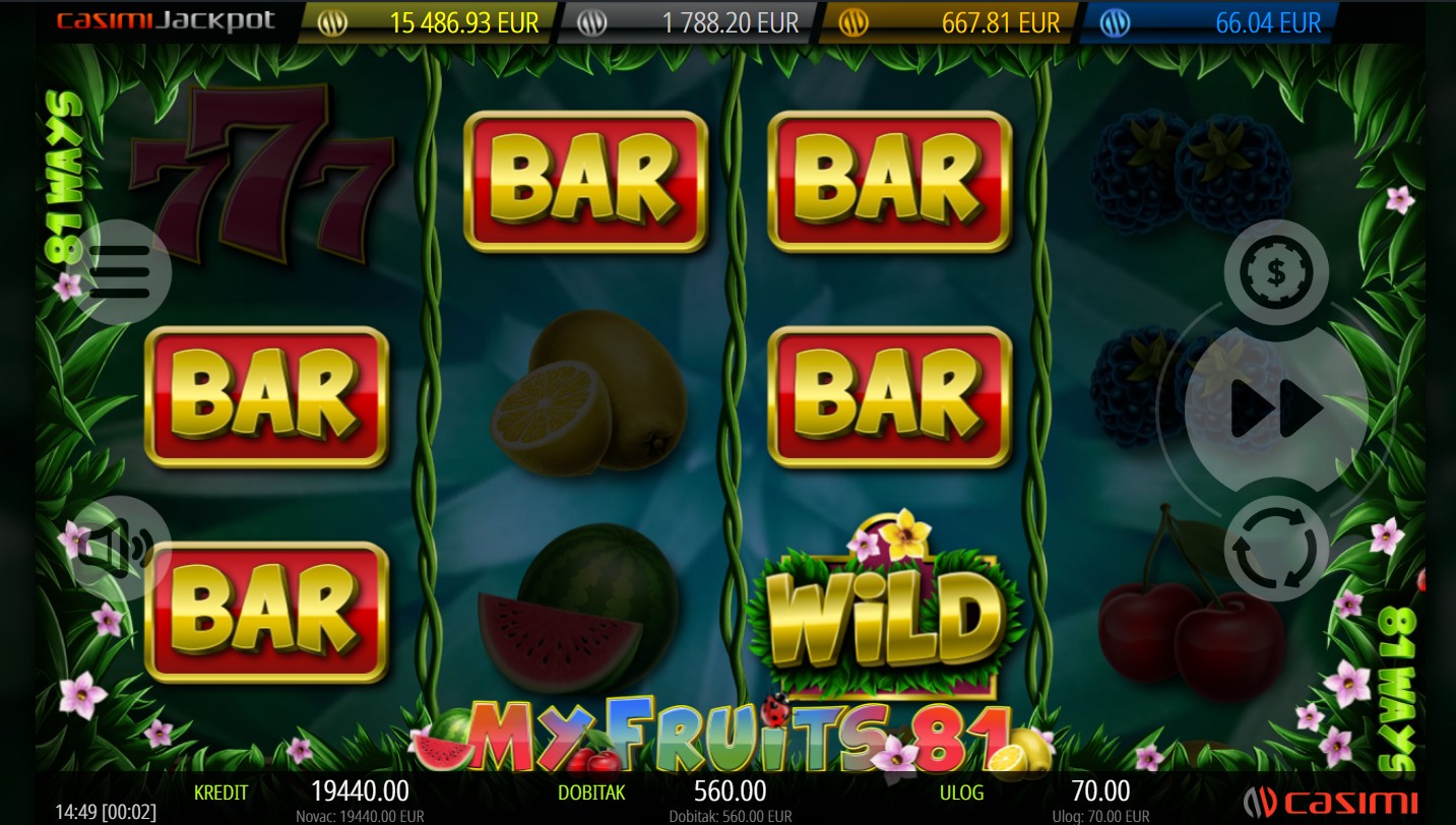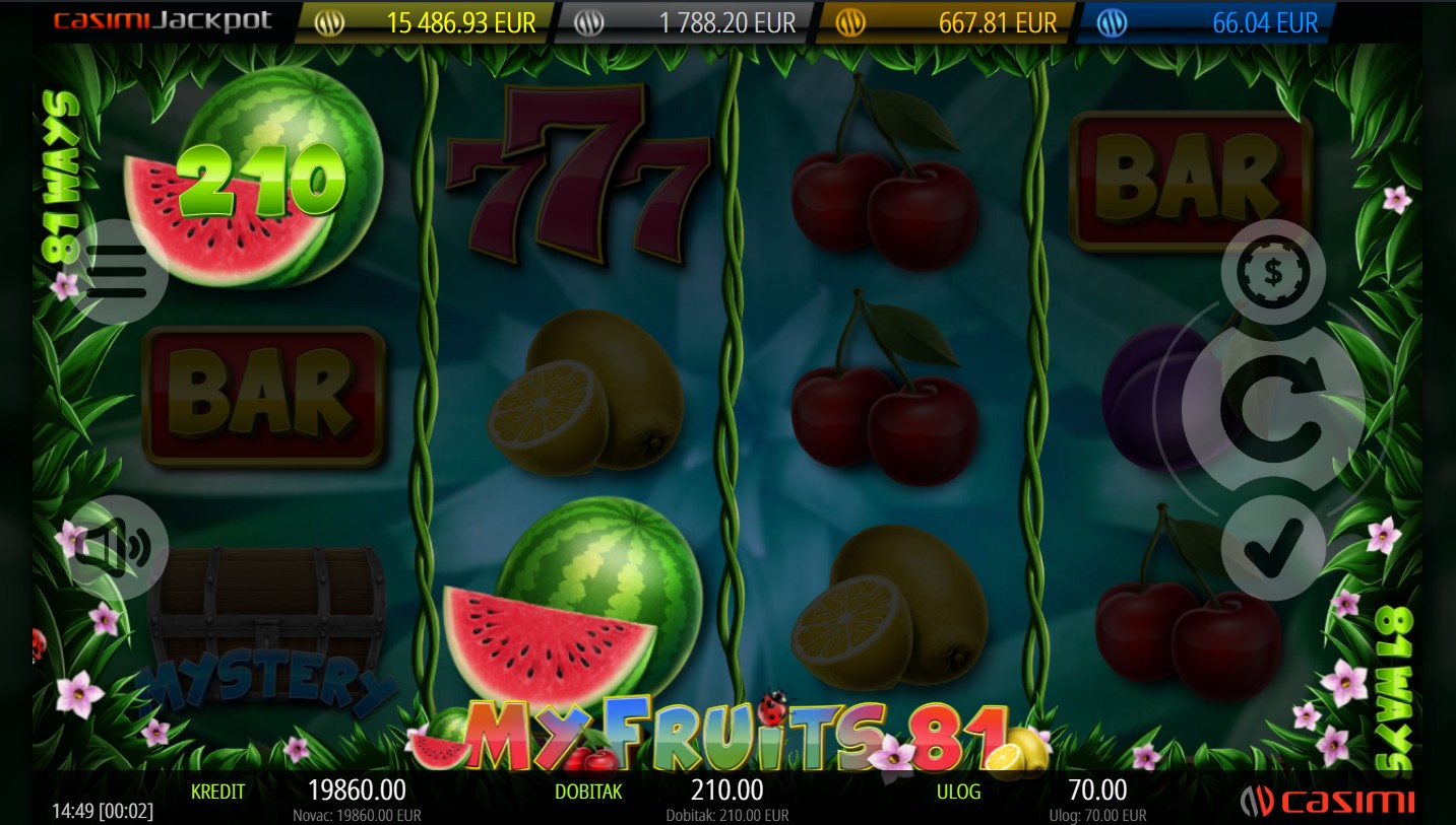 Zakorači u svijet voćne zabave uz My Fruits 81, slot igru providera Casimi koja te vodi u šareni vrt pun sočnih plodova i neočekivanih dobitaka! Na mreži od 5 valjaka i 3 reda, svako okretanje donosi priliku za stvaranje dobitnih kombinacija, dok šarenilo voćnih simbola stvara veselu atmosferu igre. Posebne značajke, poput Wild simbola i Mystery Scatter simbola, donose dodatne prilike za osvajanje nagrada.. My Fruits 81 pruža jednostavnu, ali uzbudljivu avanturu koja te vodi kroz svijet voćnih užitaka i neočekivanih iznenađenja.