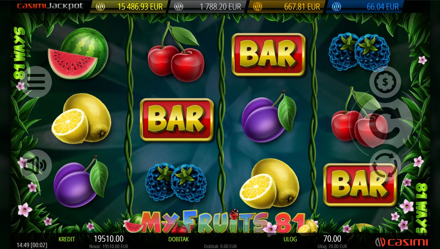 My Fruits 81 se igra na 5 valjaka i 3 reda s 81 isplatnom linijom. Dobitne kombinacije formiraju se kada se najmanje tri ista simbola slože na aktivnim linijama, a cilj je složiti što više istih simbola za veće dobitke. Wild simbol zamjenjuje sve regularne simbole i može povećati dobitak kada sudjeluje u dobitnoj kombinaciji. Mystery Scatter simbol u obliku kovčega donosi nasumične nagrade kada se pojave najmanje tri puta na valjcima. Za dodatno uzbuđenje tu je i mogućnost osvajanja bogatog jackpota. Svako okretanje pruža novu priliku za voćnu avanturu i uzbuđenje koje te vodi kroz svijet My Fruits 81.