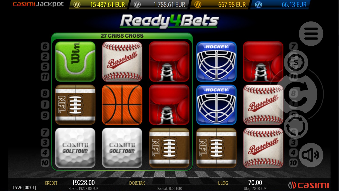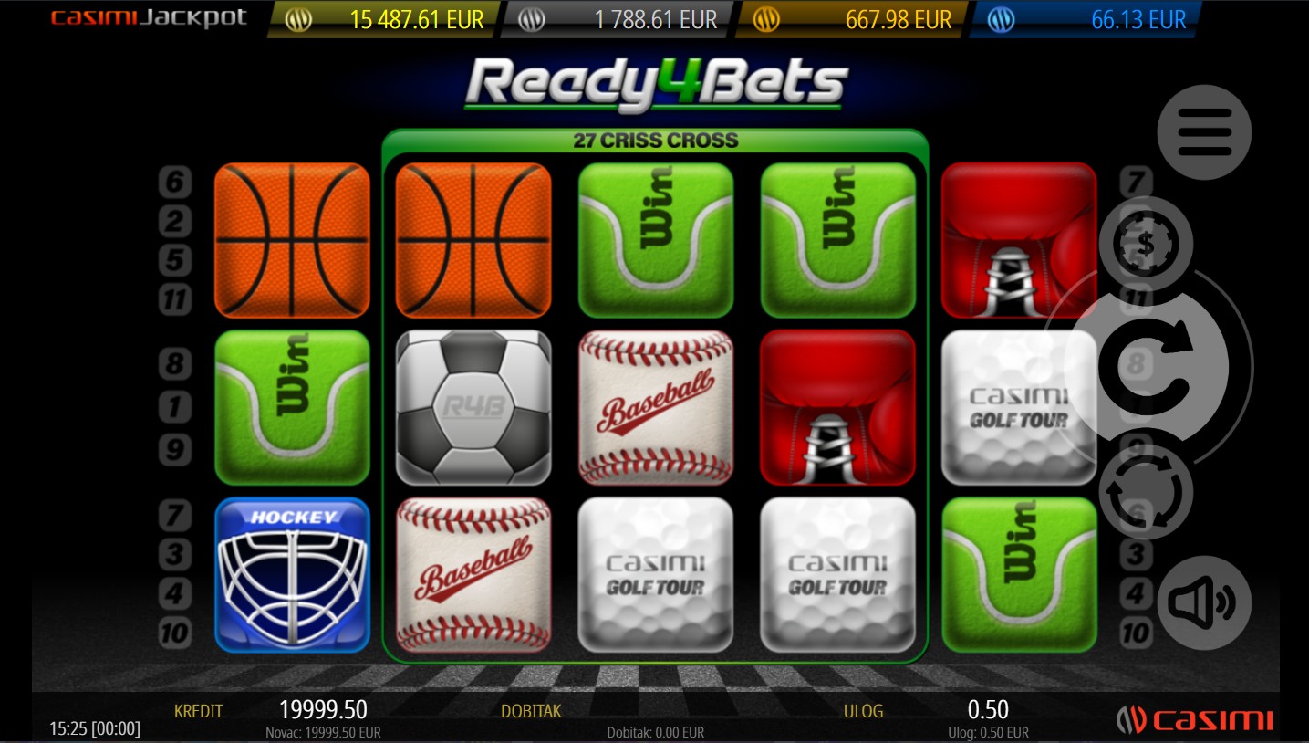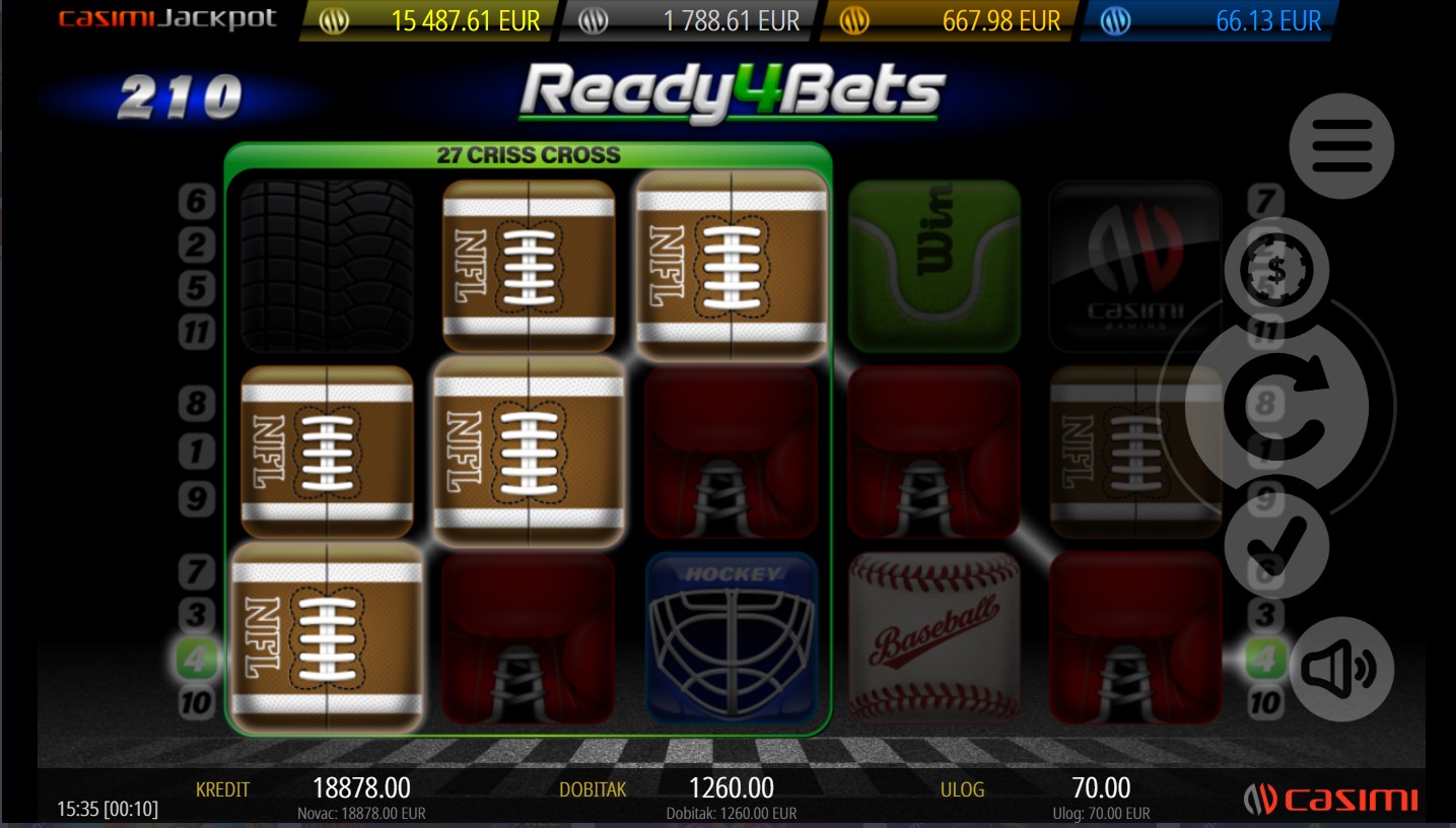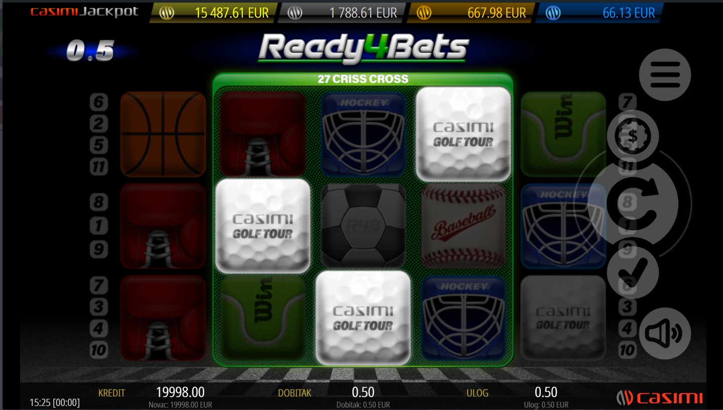 Ready 4 Bets se igra na 5 valjaka i 3 reda s 11 isplatnih linija u osnovnoj igri i 27 isplatnih linija tijekom besplatnih vrtnji. Dobitne kombinacije formiraju se kada se najmanje tri ista simbola slože na aktivnim linijama, a cilj je složiti što više istih simbola za veće dobitke. Wild simbol zamjenjuje sve regularne simbole i može povećati dobitak kada sudjeluje u dobitnoj kombinaciji. Scatter simboli aktiviraju rundu besplatnih vrtnji, dok značajka "Home and Away" donosi dodatne mogućnosti za dobitak. Uz to, imaš priliku osvojiti i bogati jackpot. Svako okretanje pruža novu priliku za sportsko uzbuđenje i osjećaj pobjedničke atmosfere koja te vodi kroz Ready 4 Bets avanturu!