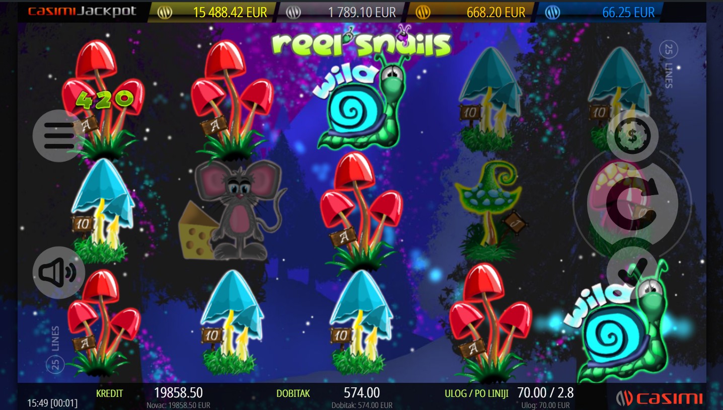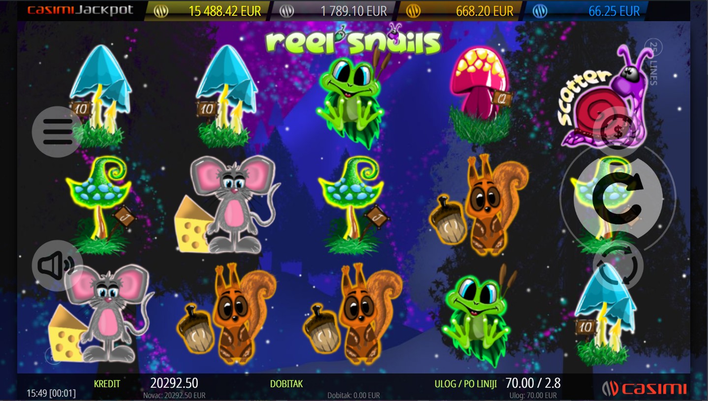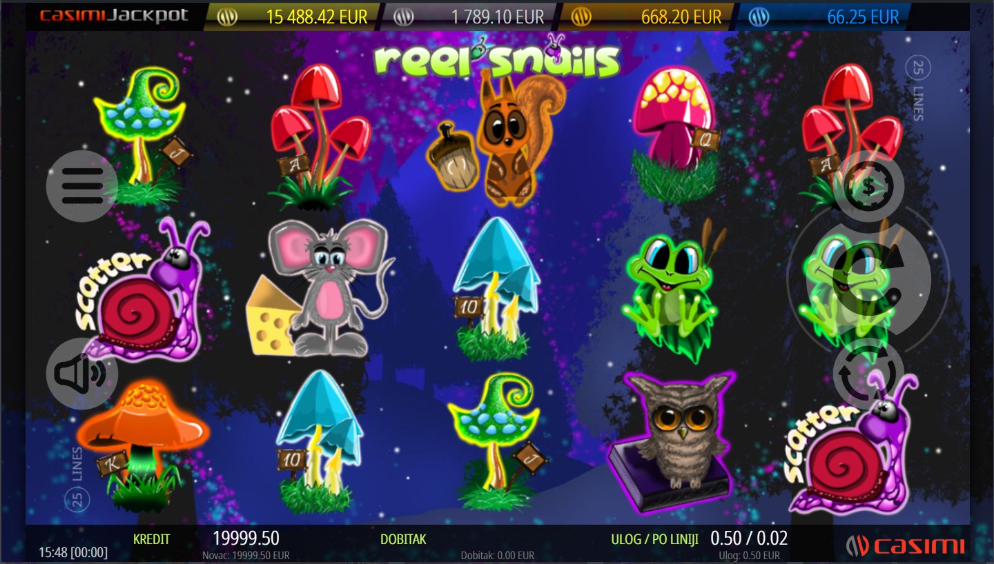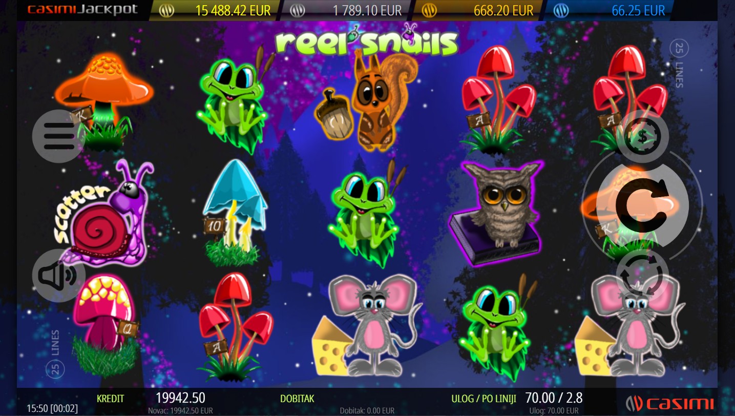 Reel Snails se igra na 5 valjaka i 3 reda s 25 isplatnih linija. Dobitne kombinacije formiraju se kada se najmanje tri ista simbola slože na aktivnim linijama, a cilj je složiti što više istih simbola za veće dobitke. Wild simbol u obliku plavog puža zamjenjuje sve regularne simbole i može se proširiti na cijeli valjak, aktivirajući respin i povećavajući šanse za dobitak. Scatter simbol u obliku crvenog puža aktivira rundu besplatnih vrtnji kada se pojavi najmanje pet puta na valjcima. Tijekom besplatnih vrtnji, svi Wild simboli postaju sticky, ostajući na svom mjestu do kraja runde i povećavajući šanse za veće dobitke. Također, za dodatno uzbuđenje i napetost tu je i mogućnost osvajanja jackpota. Svako okretanje pruža novu priliku za šumsku avanturu i uzbuđenje koje te vodi kroz svijet Reel Snails.