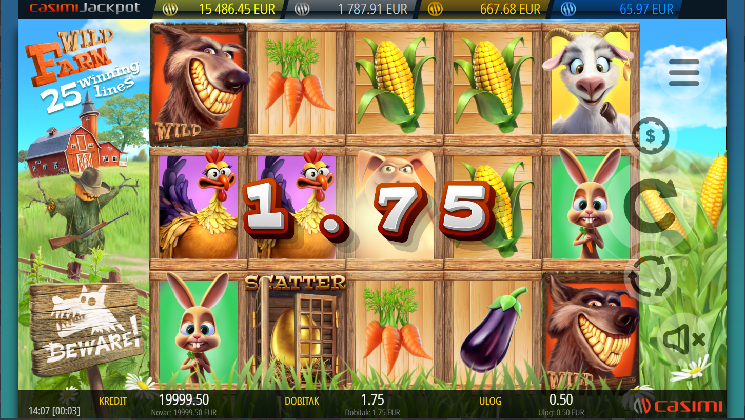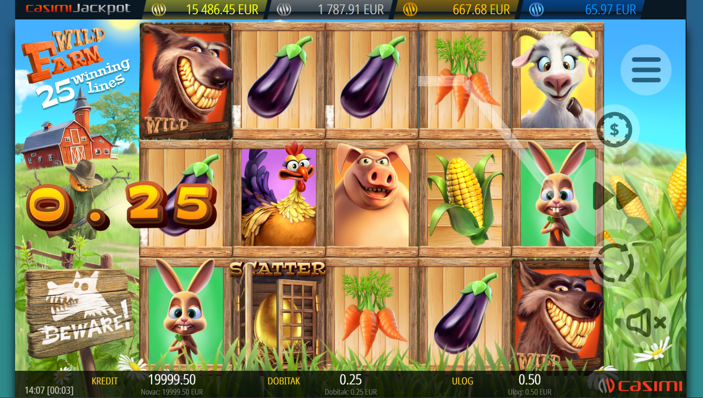 Wild Farm i Casimi vode te na veselu farmu gdje domaće životinje donose nagrade. Slot ima 5 bubnjeva, 3 reda i 25 isplatnih linija. Grafika je šarena i zabavna, uz zvukove farme koji stvaraju opuštenu atmosferu. Savršen izbor za igrače koji vole veselu i ležernu slot avanturu.