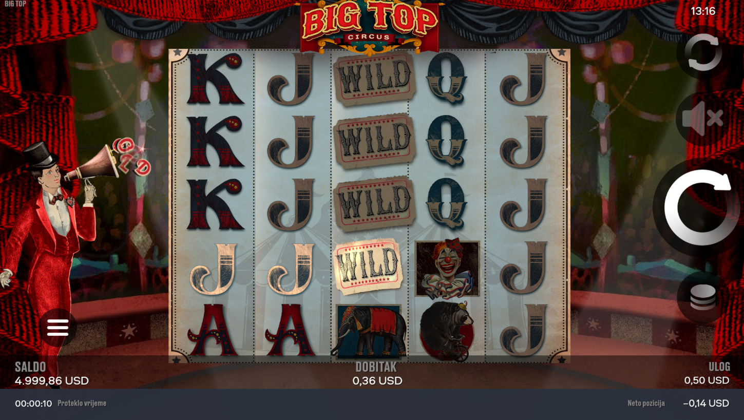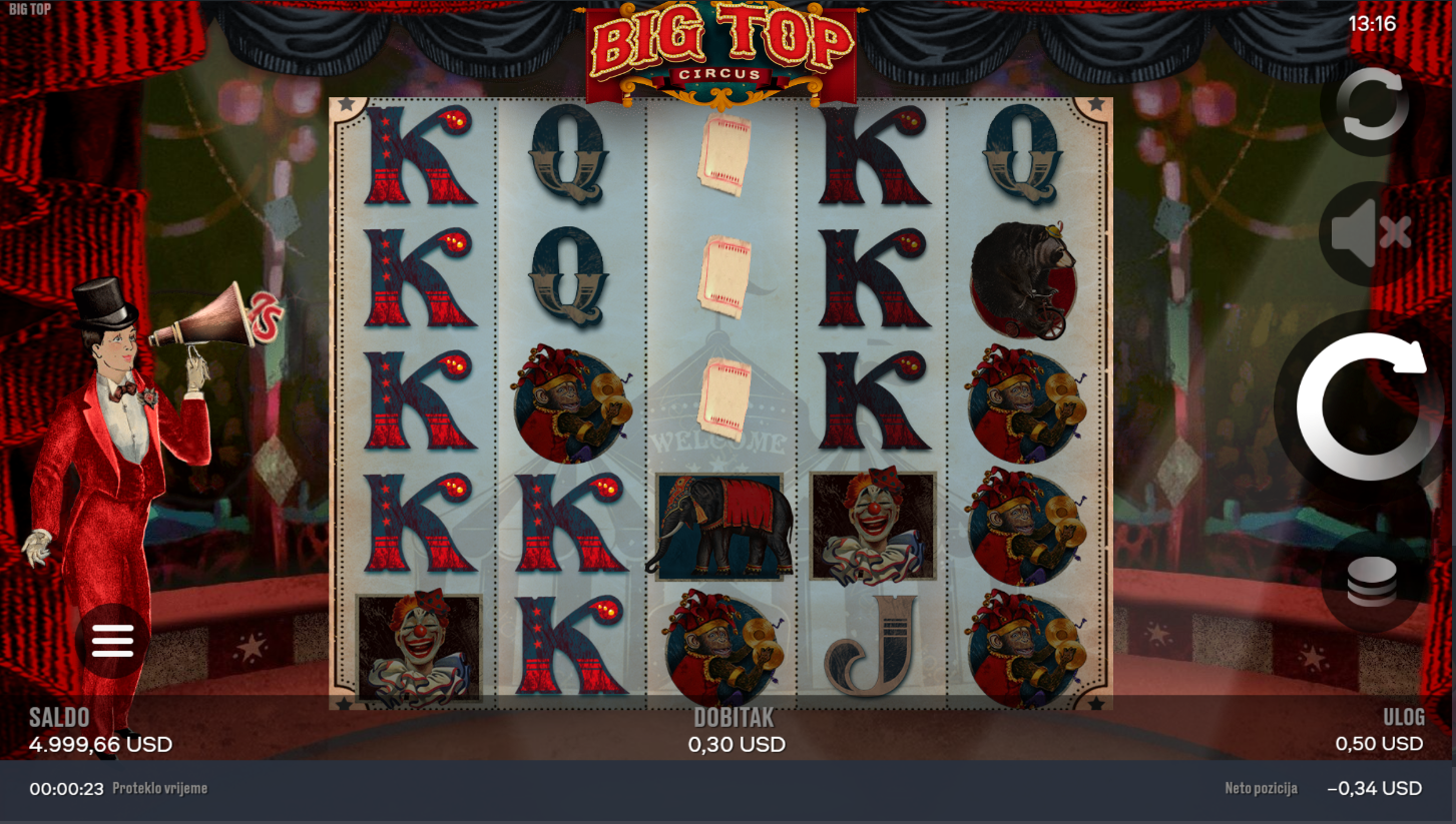 Big Top nudi RTP od oko 96%, što znači da vraća solidan dio uloga tijekom vremena. Volatilnost je srednja, pa možeš očekivati dobar balans između manjih, čestih dobitaka i većih iznenađenja. To ga čini odličnim izborom za one koji žele uzbuđenje, ali bez prevelikih rizika. Savršen je za igrače koji vole ritam cirkusa: dinamičan, ali s mjerom!