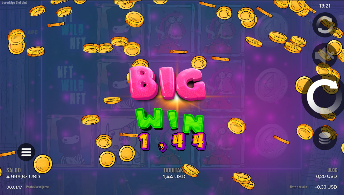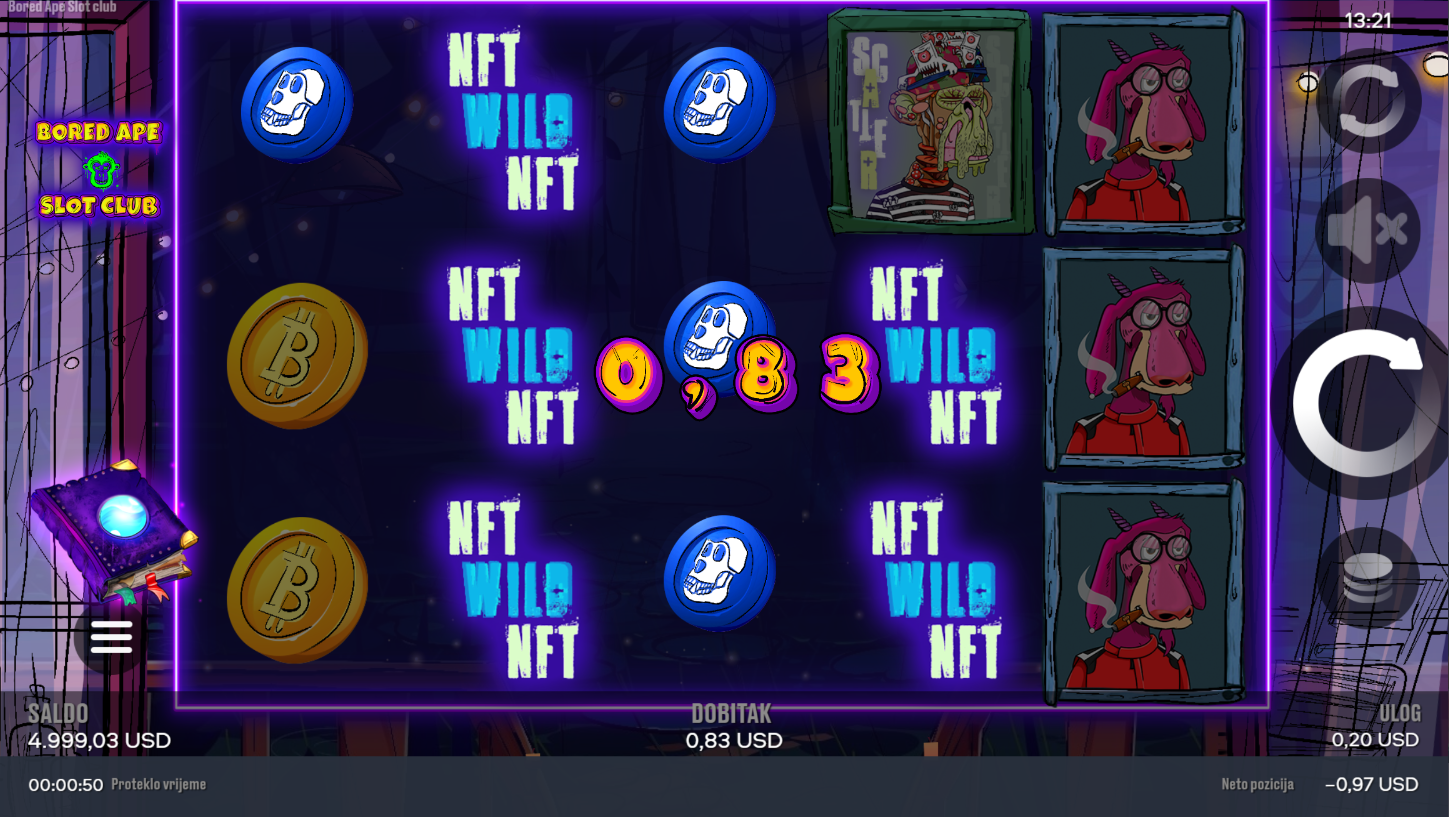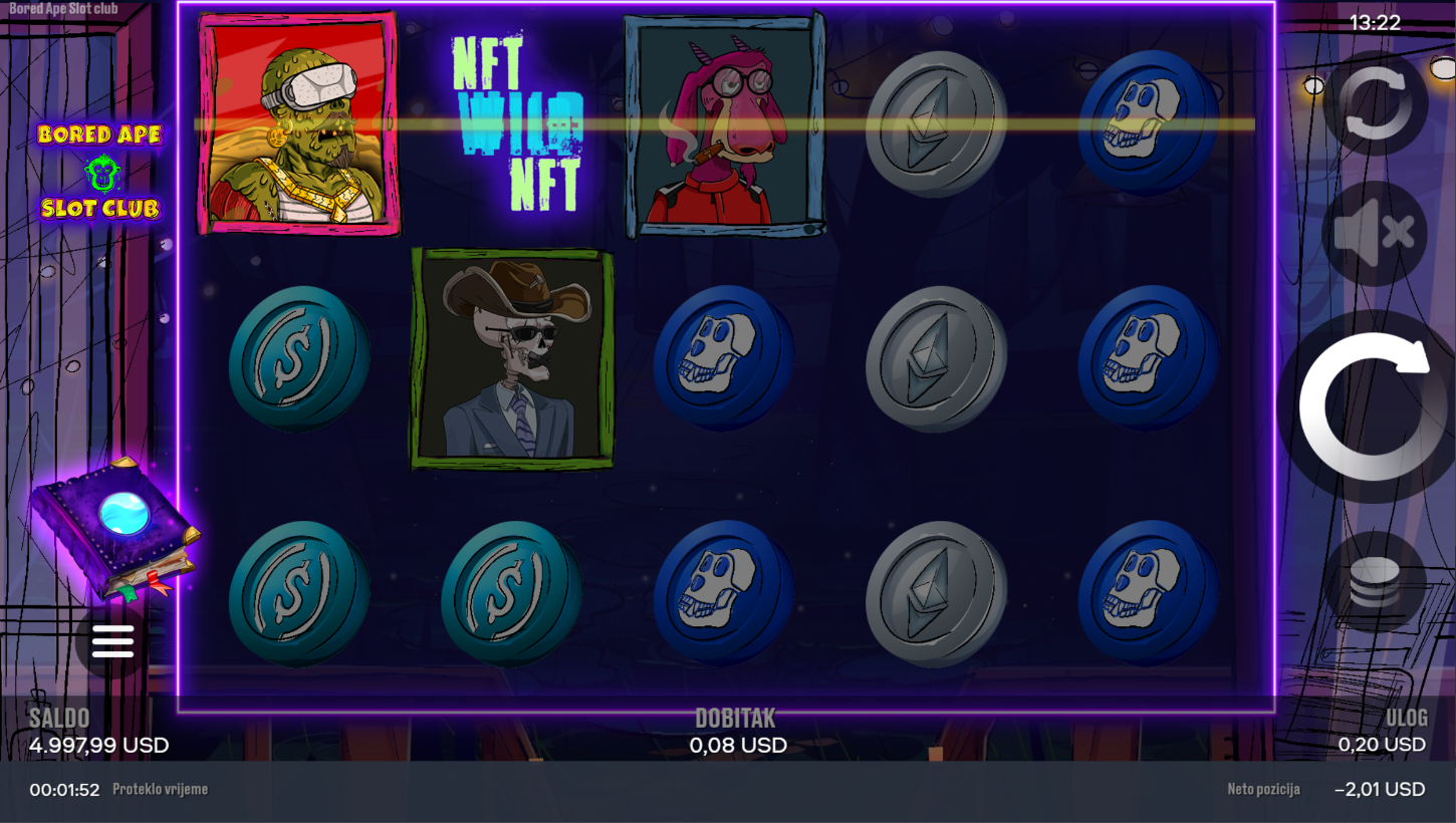 Odaberi ulog i zavrti bubnjeve dok te NFT majmuni vode u svijet iznenađenja. Simboli se slažu preko 20 linija isplate, a posebni znakovi dižu uzbuđenje. Pravila su jednostavna, ali atmosfera je drugačija od bilo čega što si dosad igrao. Zabava je garantirana, a svaki spin može donijeti cool iznenađenje.