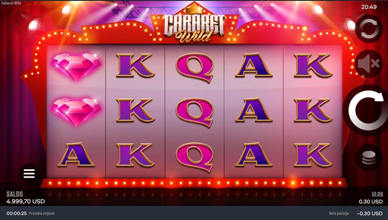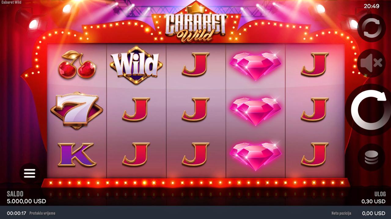 Cabaret Wild igra se na 5 rola, a cilj je povezati iste simbole na aktivnim linijama počevši s lijeve strane kako bi ostvario dobitak. Simboli inspirirani kabaretskim svijetom donose različite razine nagrada, dok jednostavna mehanika omogućuje brzo i intuitivno igranje. Postavi svoj ulog, zavrti role i uživaj u elegantnoj animaciji i šansi za dobitke koji se skrivaju iza svakog simbola!