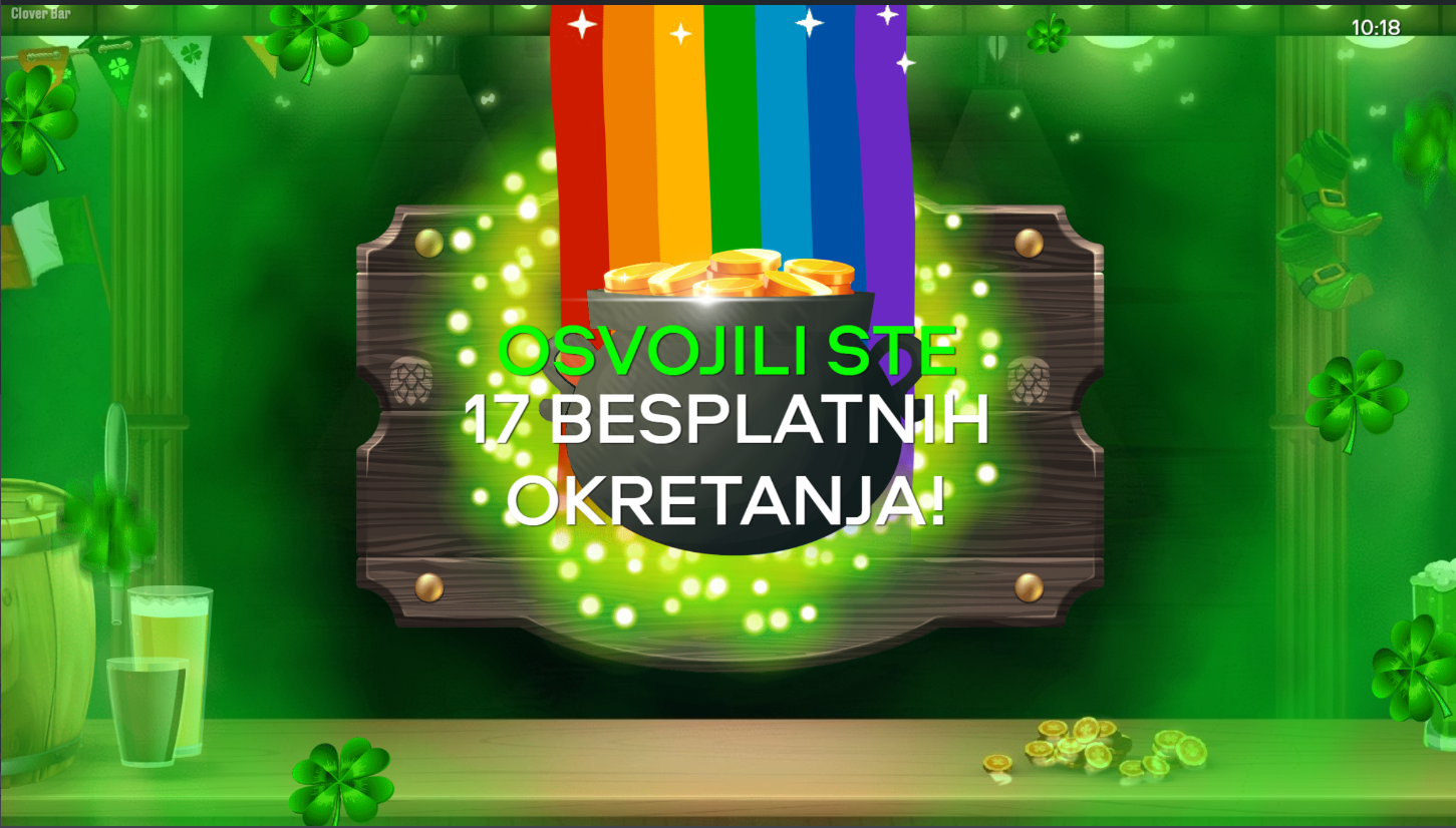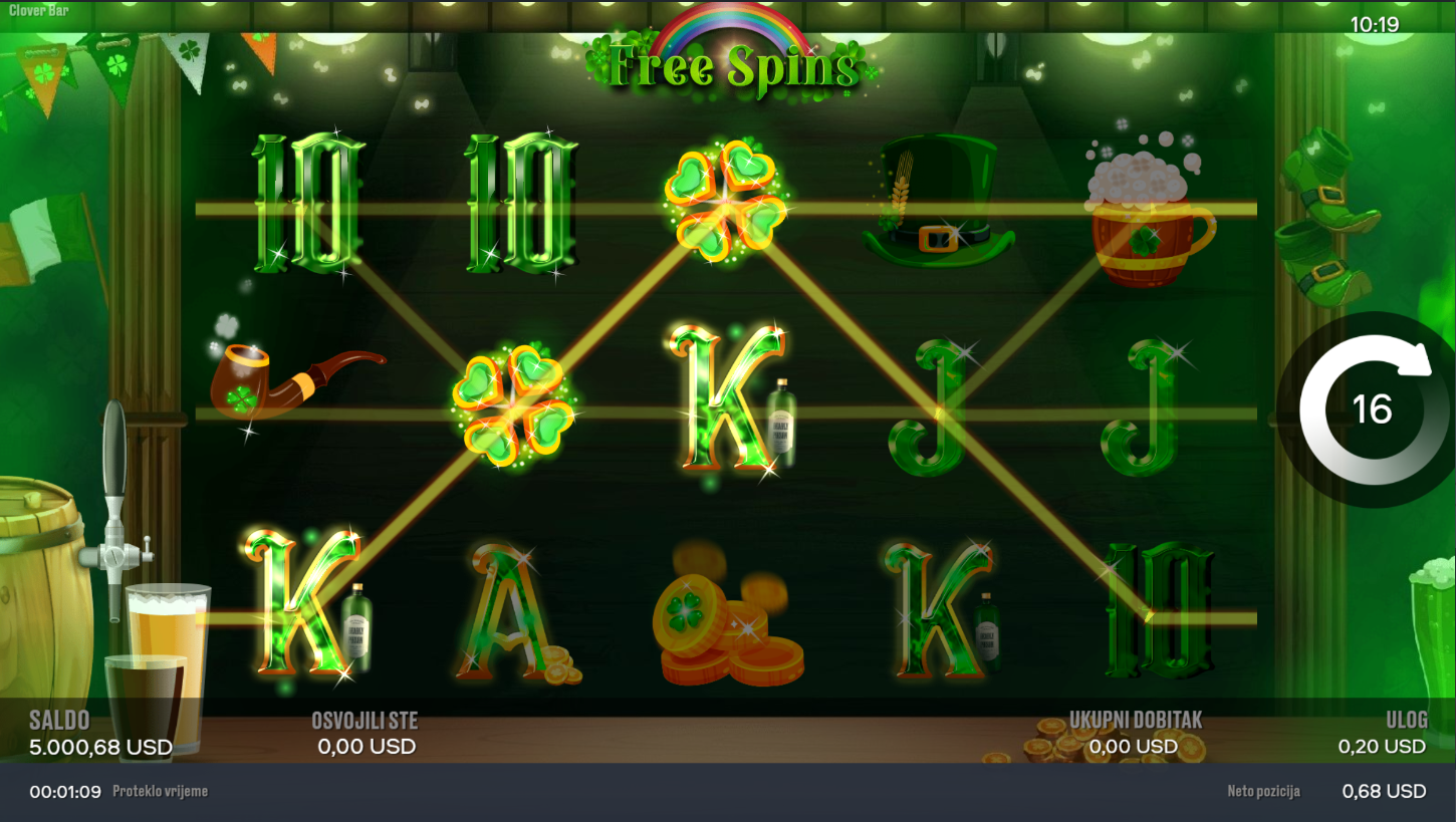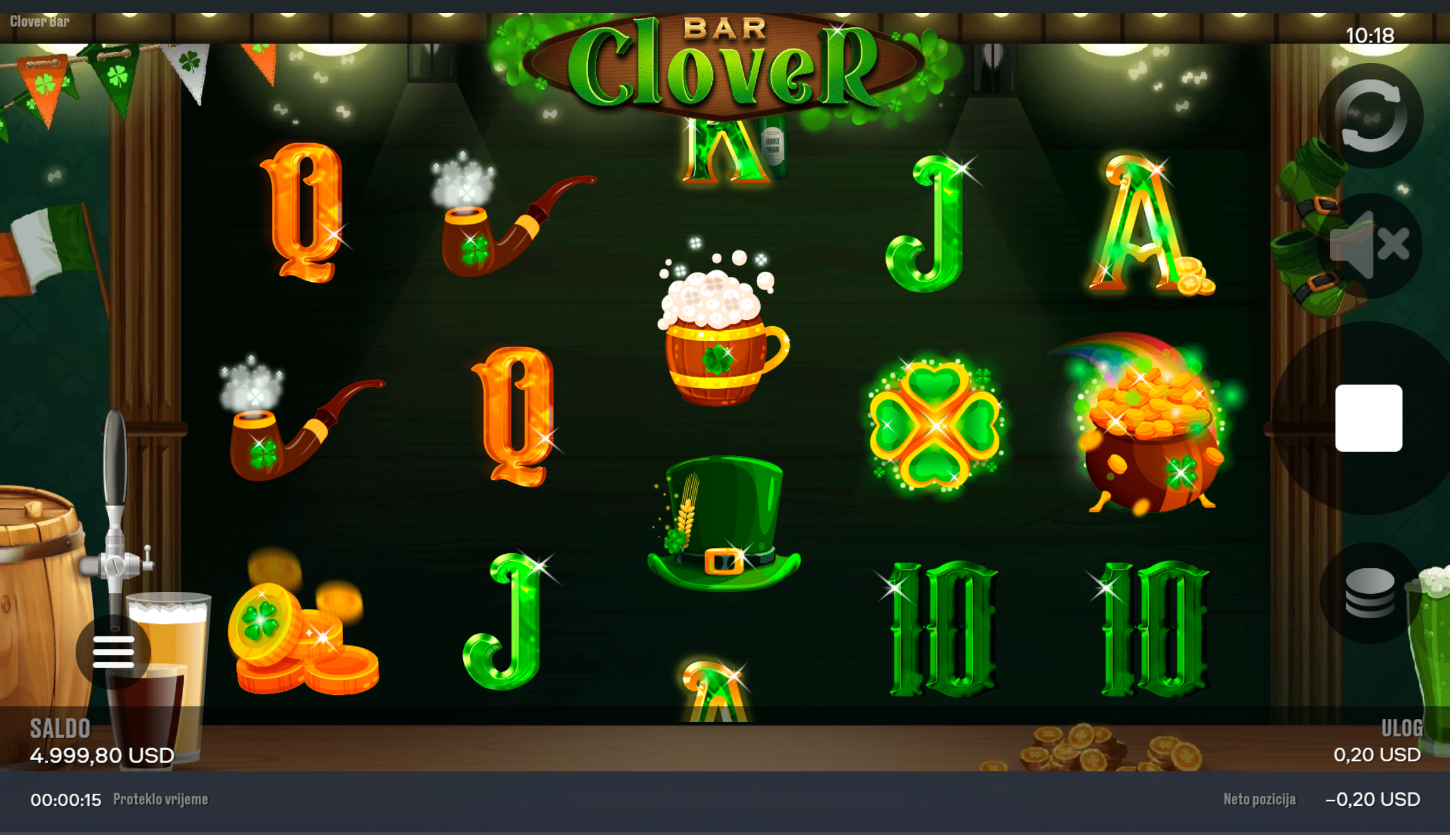 Clover Bar i Chilli Games donose veselu atmosferu irskog puba, gdje se sreća i zabava stapaju u jedno. Na 5x3 bubnjeva i 20 linija isplate čekaju te simboli djetelina, potkova i piva. Grafika je živopisna, a soundtrack stvara pravi pub vibe. Ako voliš opuštenu, ali nagrađujuću atmosferu, Clover Bar je savršen izbor.