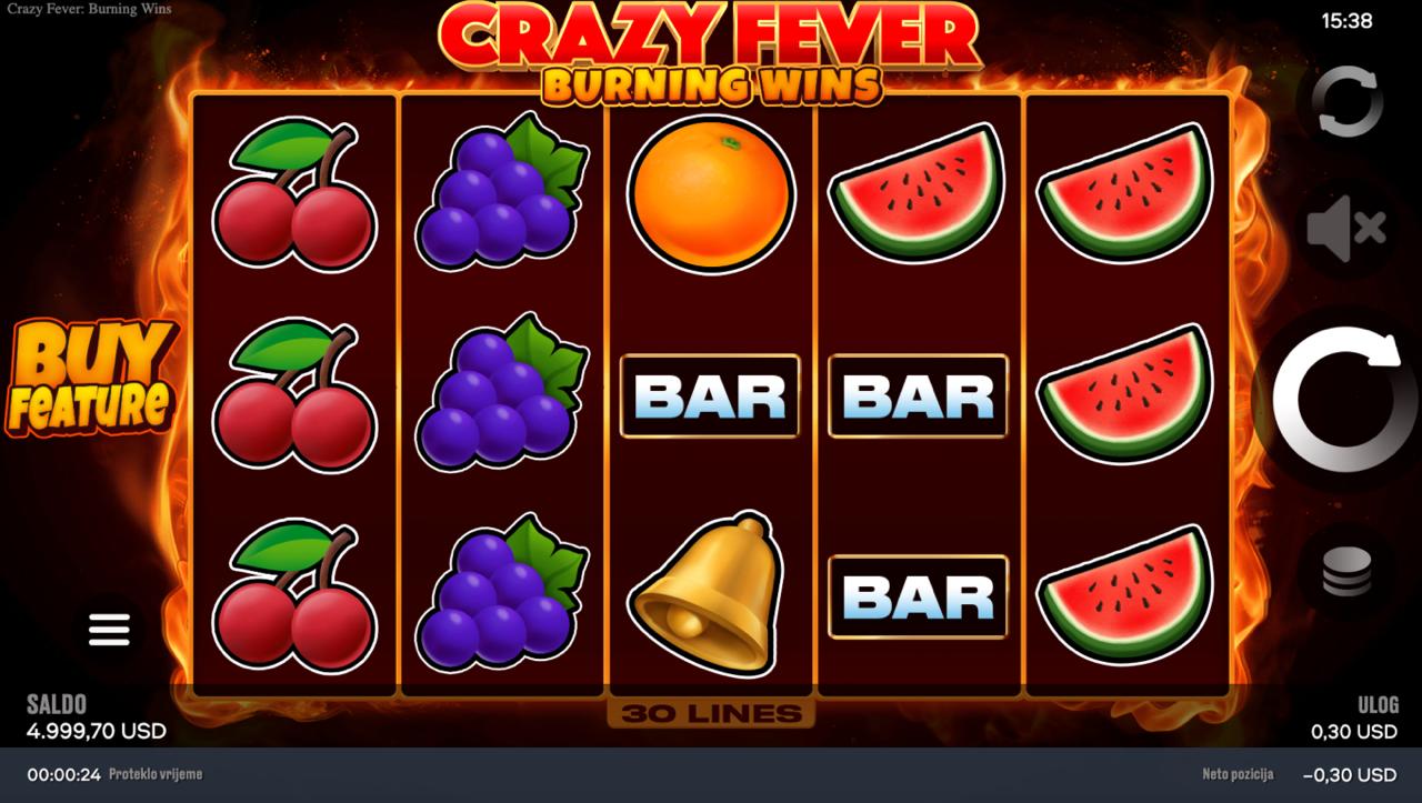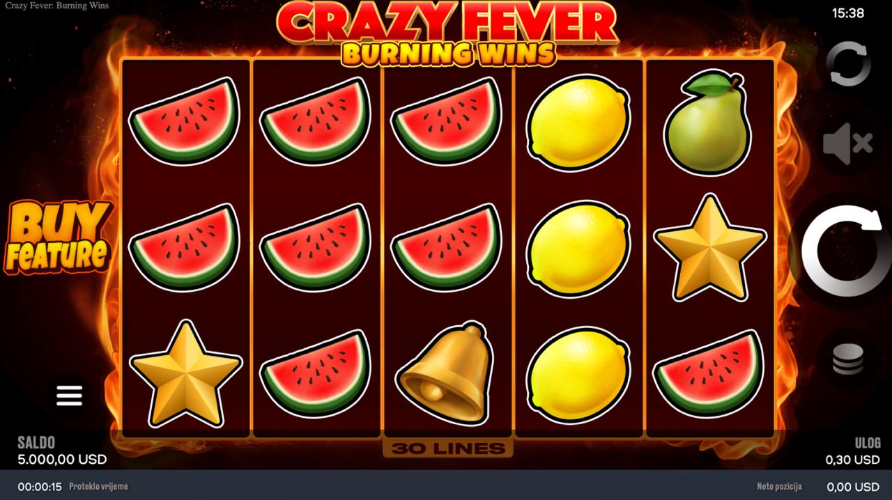 Crazy Fever: Burning Wins je energična slot igra providera ChilliGames koja donosi klasičnu voćnu atmosferu uz moderan, vatreni dizajn i dinamične spinove. Simboli u žarkim bojama, užarena pozadina i brzi tempo igre stvaraju intenzivno iskustvo pri svakom okretu rola. Igra je jednostavna za igranje i idealna za ljubitelje klasičnih slotova s modernim vizualnim efektima. Iako ne uključuje jackpot, nudi česte prilike za osvajanje dobitaka i zabavno, brzo igranje.