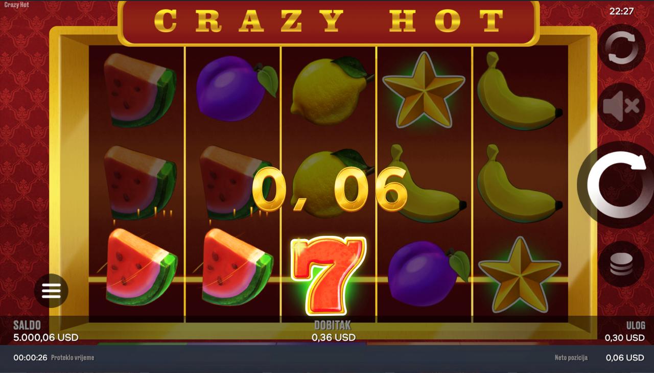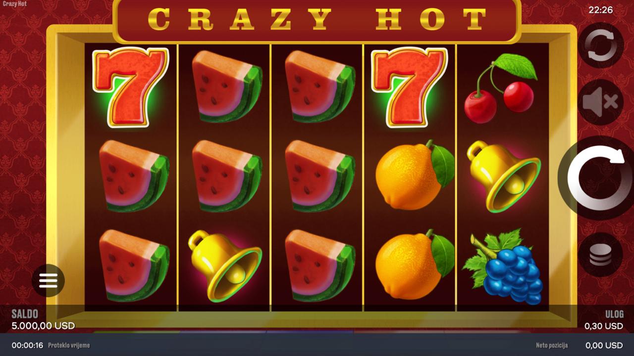Crazy Hot igra se na 5 rola, a cilj je složiti iste simbole na aktivnim linijama, počevši s lijeve strane, kako bi se ostvarili dobitci. Klasični simboli poput voća i sedmica donose različite razine nagrada, dok energični tempo igre dodatno pojačava osjećaj uzbuđenja. Postavi željeni ulog, zavrti role i prepusti se vrućoj zabavi!