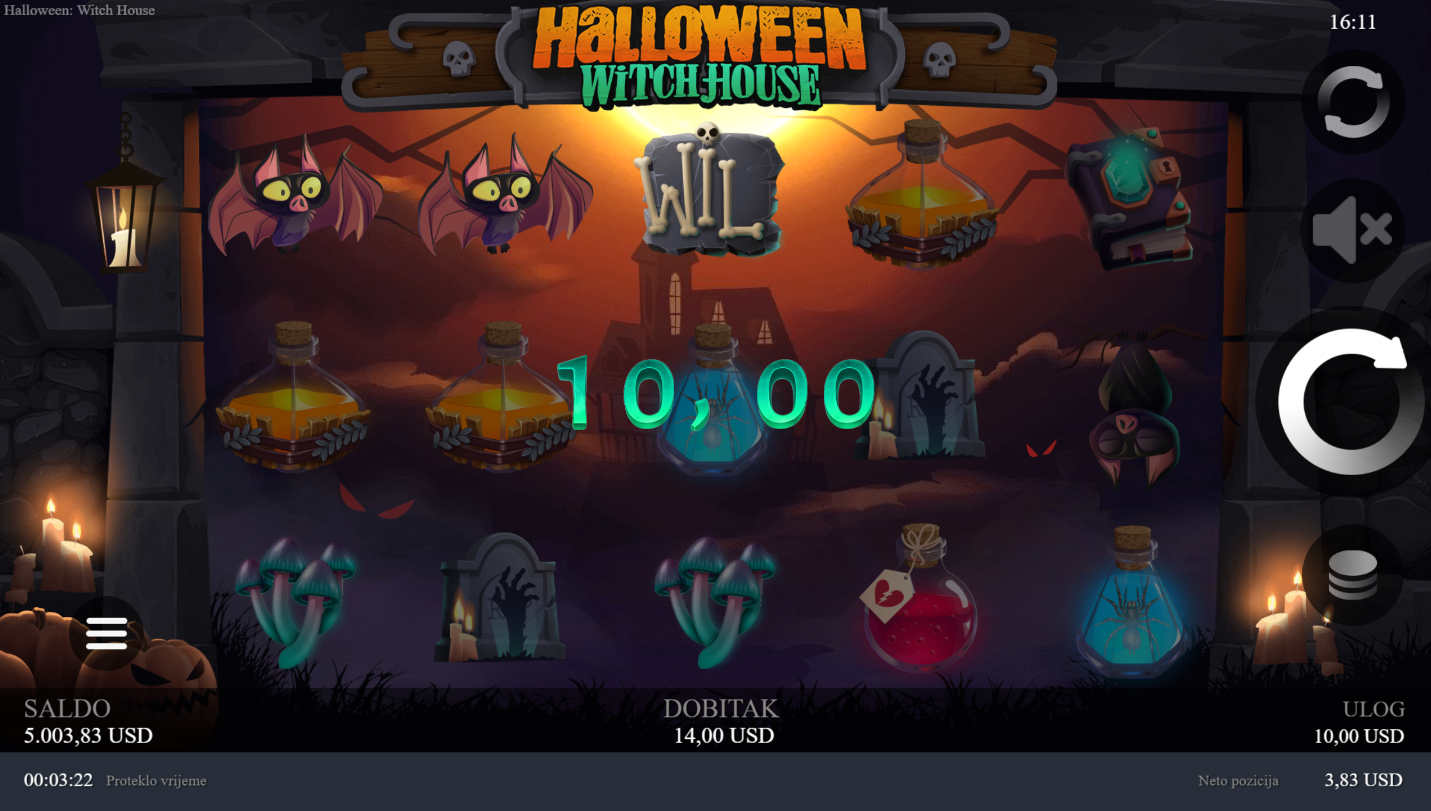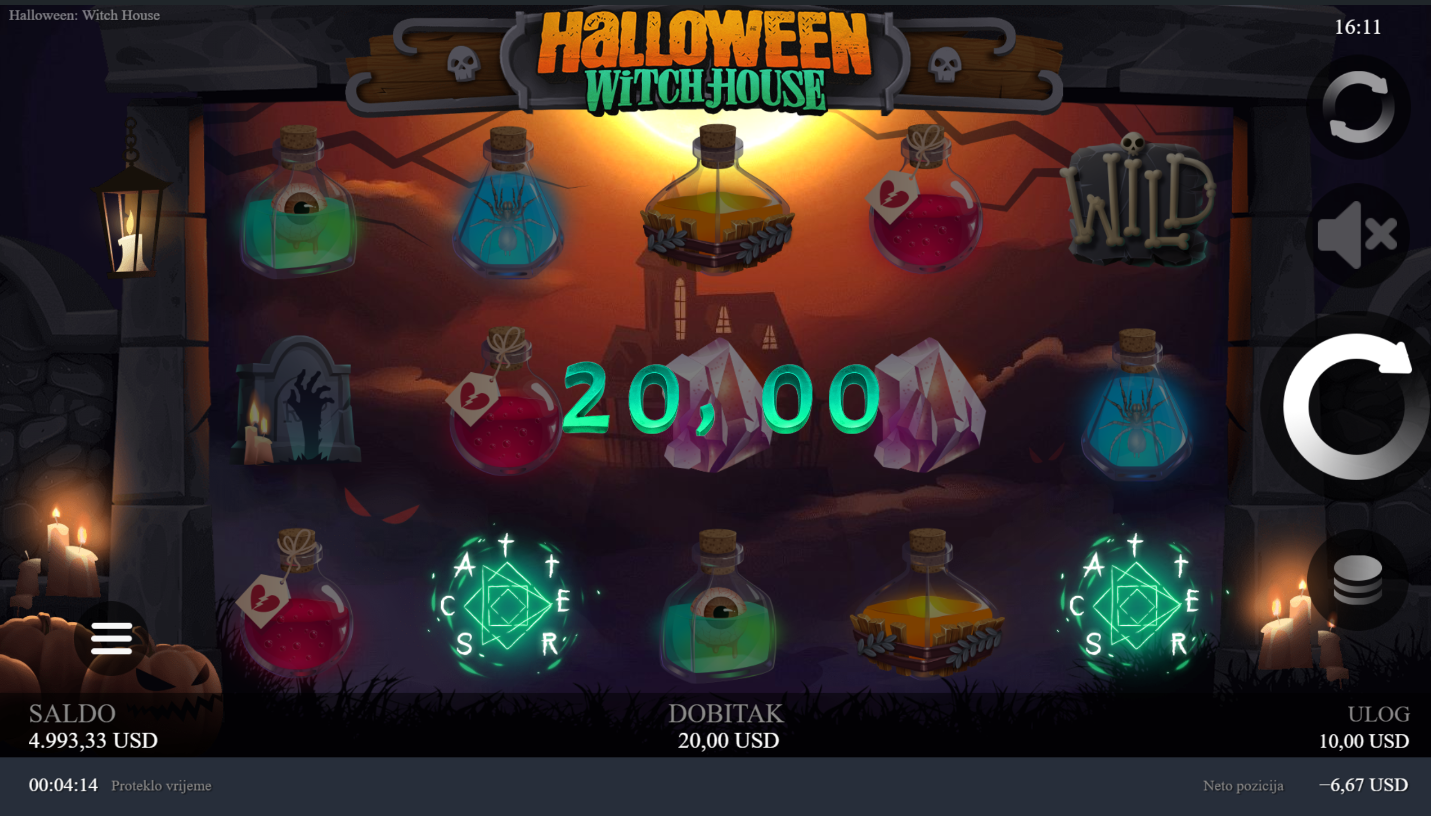 Halloween: Witch House od Chilli Games donosi mračni svijet vještičje kuće. To je slot igra koja spaja jezovitu atmosferu, mistične simbole i Halloween stilizaciju koja te privlači od prve slike. Svjetla svijeća, tamni tonovi i simboli poput čarobnih napitaka i misterioznih knjiga stvaraju osjećaj Noći vještica i ritualnog obreda. Svaka vrtnja donosi novi val napetosti i šarm mračne magije!