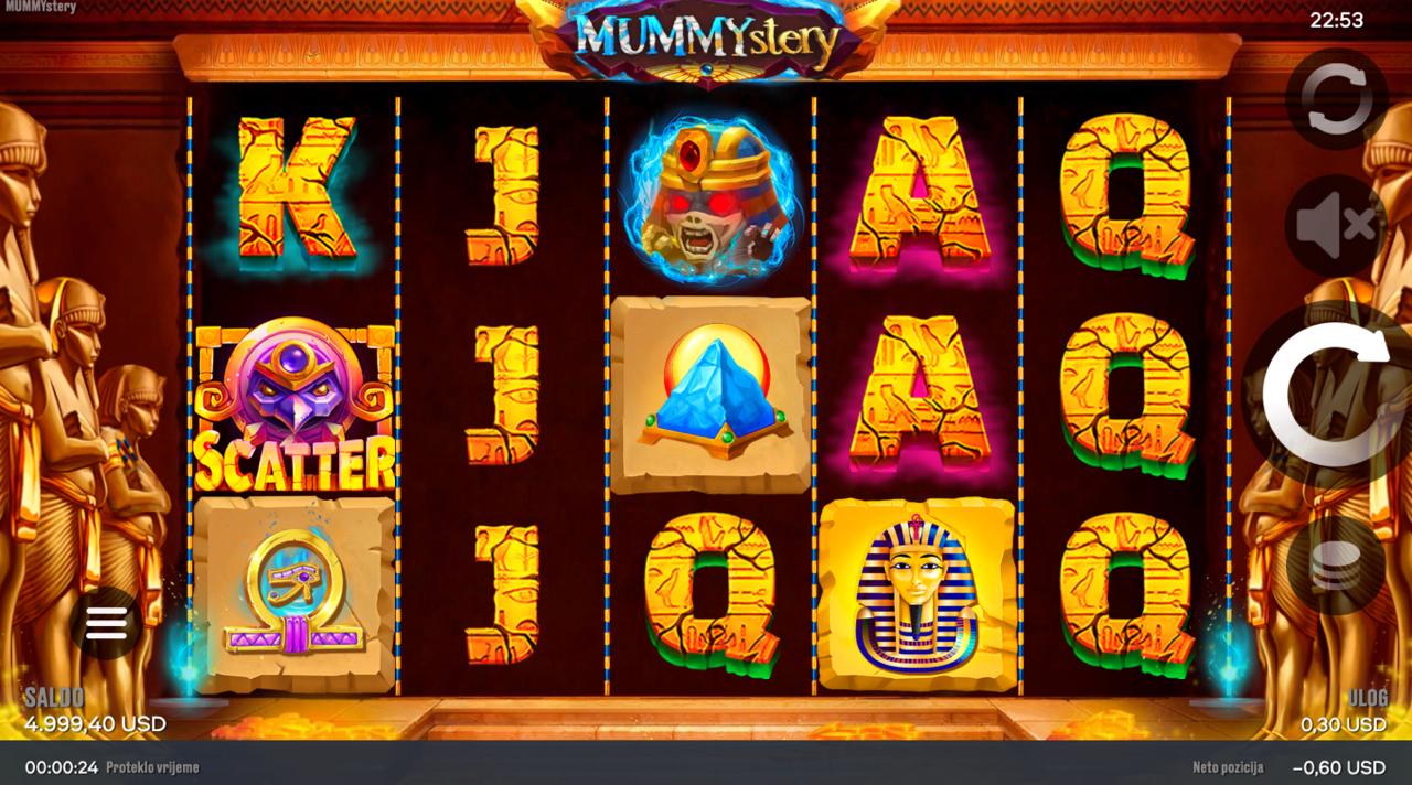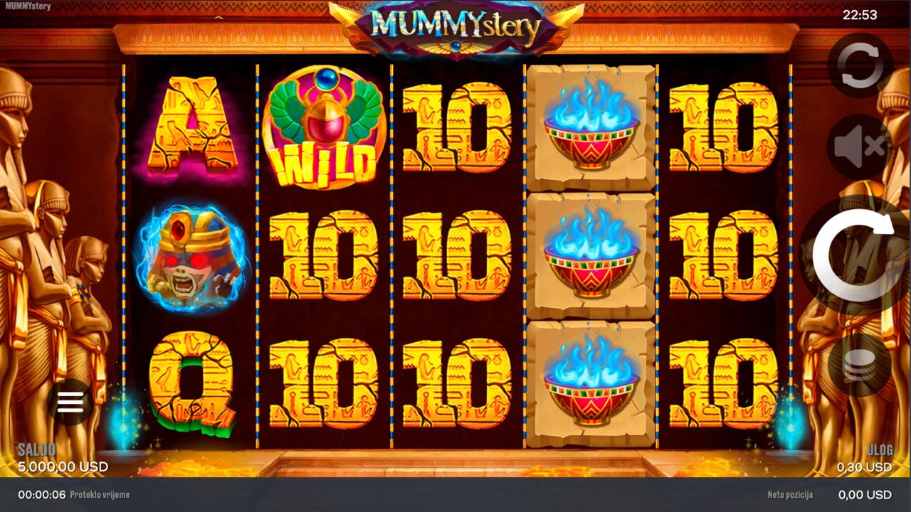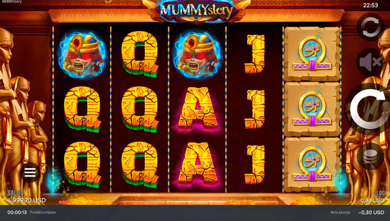 MUMMYstery igra se na 5 rola, a cilj je složiti iste simbole na aktivnim linijama, počevši s lijeve strane kako bi se ostvarili dobitci. Simboli inspirirani egipatskom mitologijom donose različite razine nagrada, dok posebne kombinacije mogu stvoriti dodatne prilike za veću isplatu. Postavi željeni ulog, zavrti role i prepusti se tajanstvenoj avanturi kroz svijet drevnih blaga!