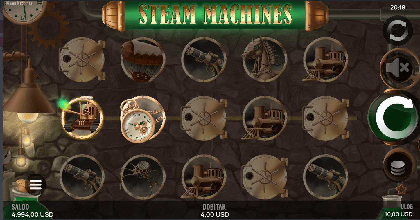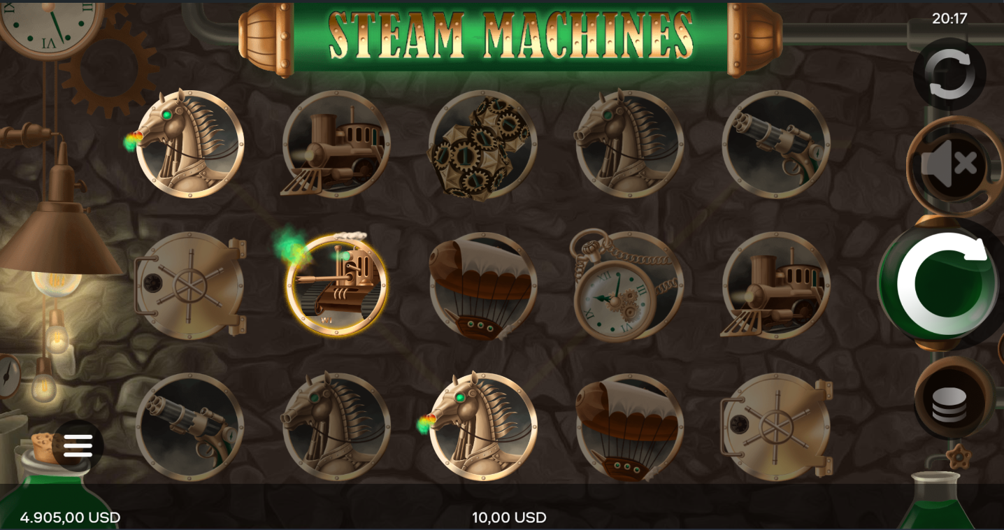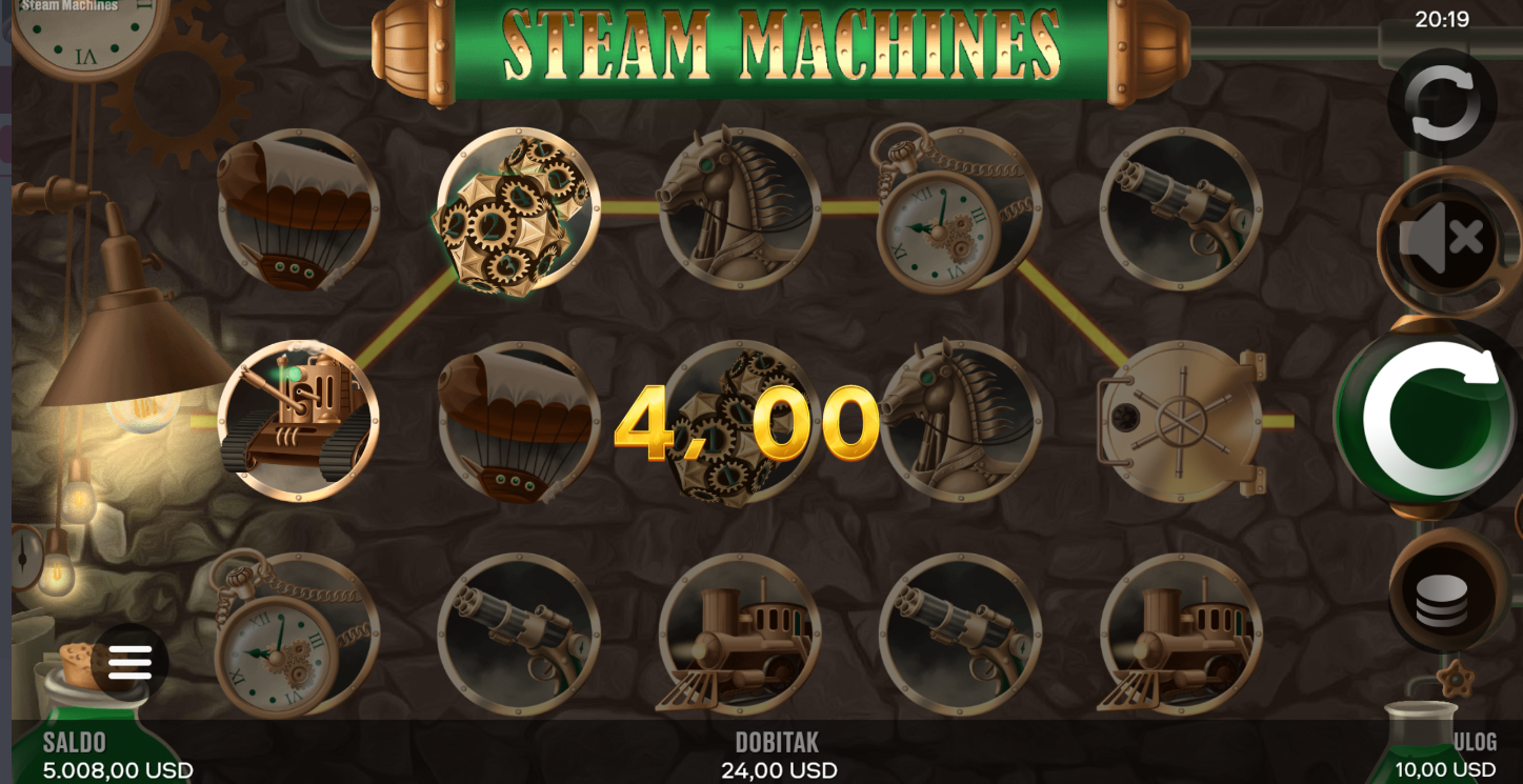 Steam Machines od Chilli Gamesje slot koji kombinira steampunk estetiku, zupčanike, paru i metalne motive. Simboli su mehanički, sa zrakoplovima, strojevima i elementima industrijskog doba. Vizuali i glazba pružaju osjećaj prave tvornice pune pare. Atmosfera je retro-futuristička i idealna za one koji vole povijest i tehnologiju!